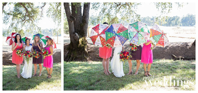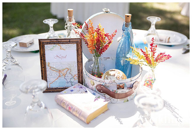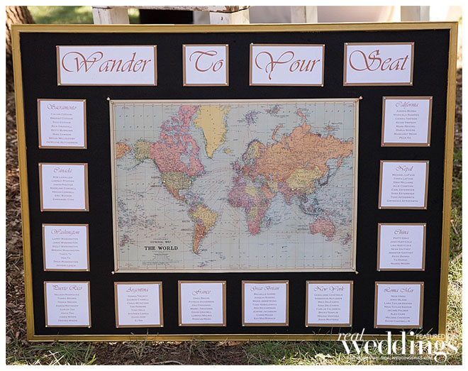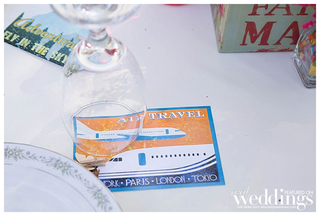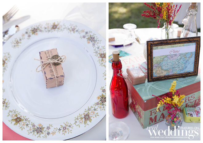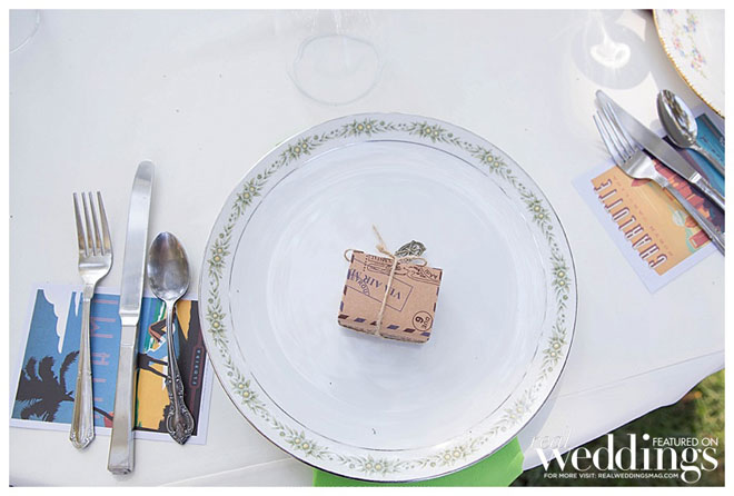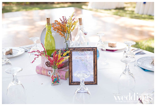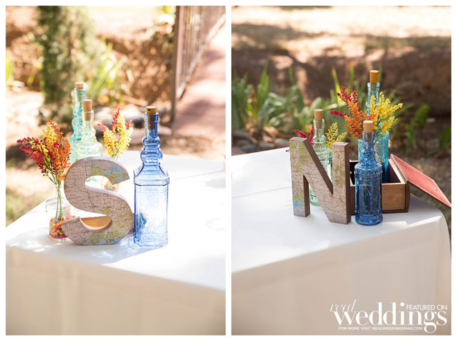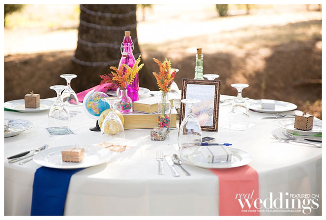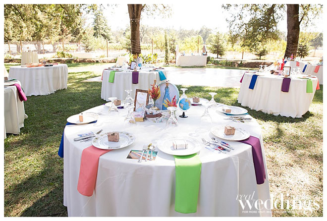 The bright and colorful wedding also incorporated a travel theme. They hired an artist to design a colorful map of the world, and the couple used that logo as invitation seals. Fitting with their travel them, they served a “global assortment of foods.”