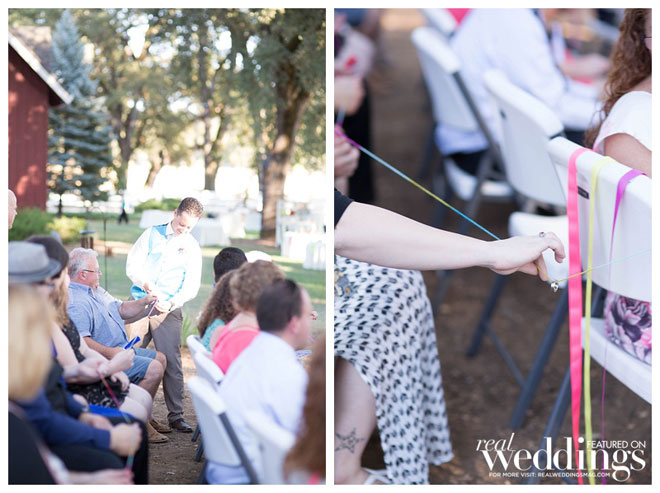 “We wanted audience participation so we came up with a unique idea of placing a colorful string on the ground and weaving it through the audience,” says Sabrina. “The rings were placed on the string and passed along, from one guest to the next, all the way to the front.”