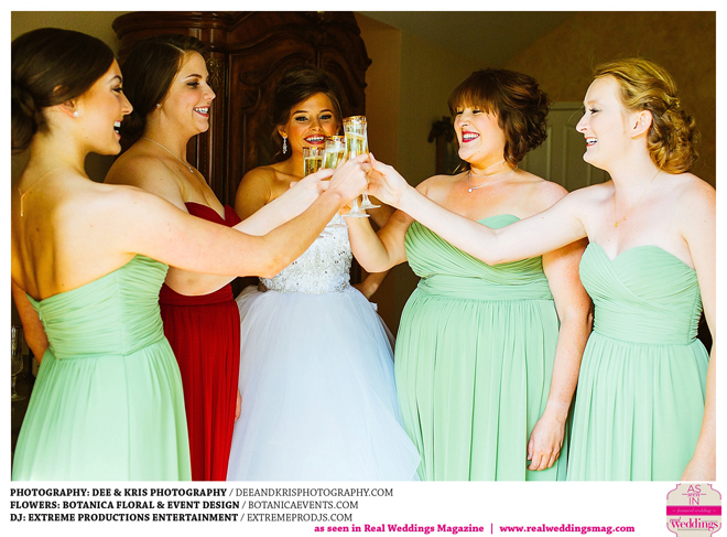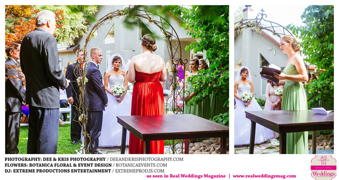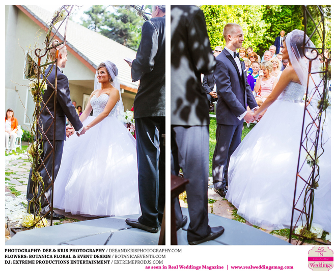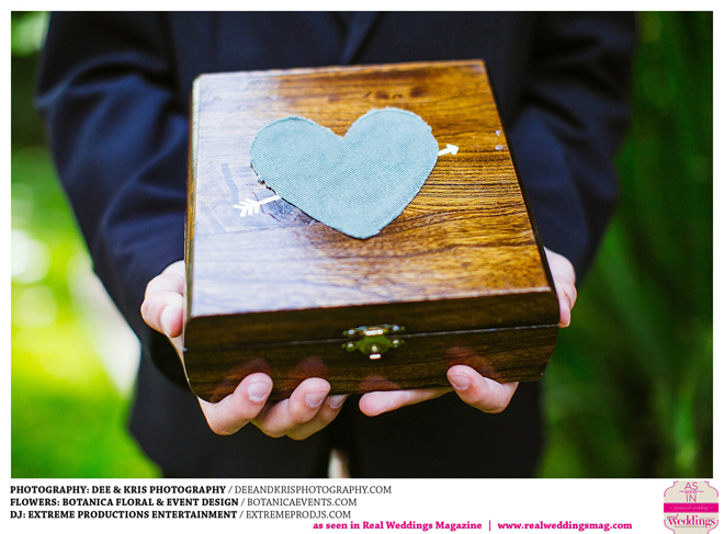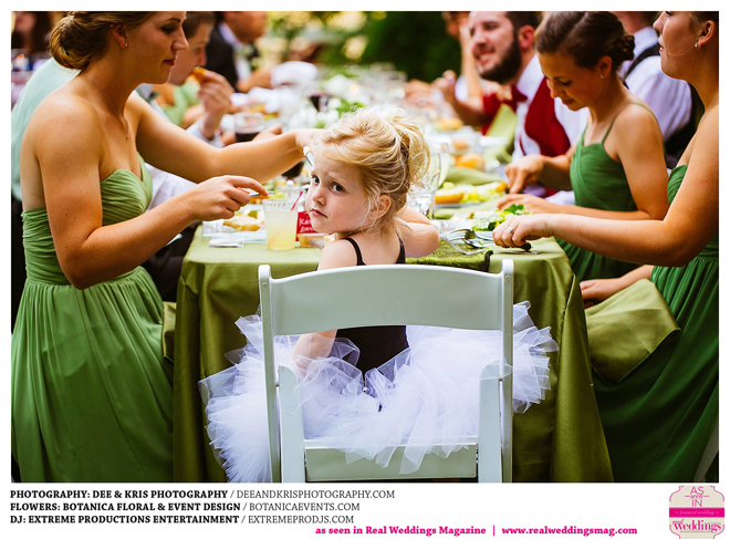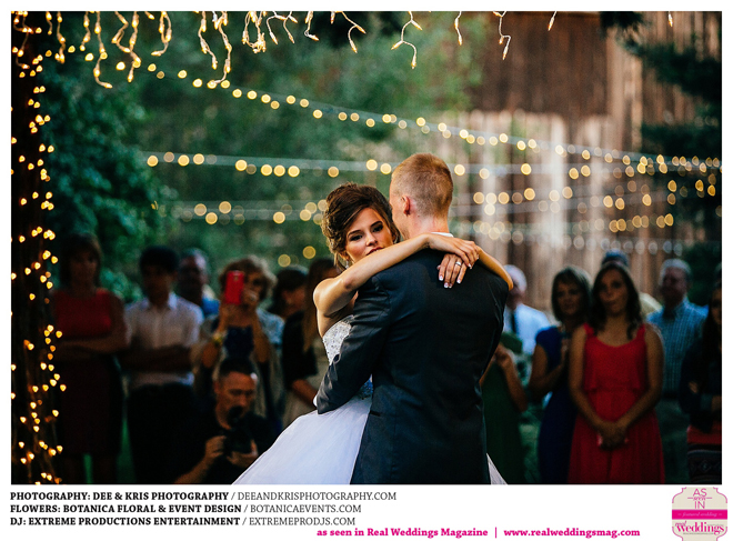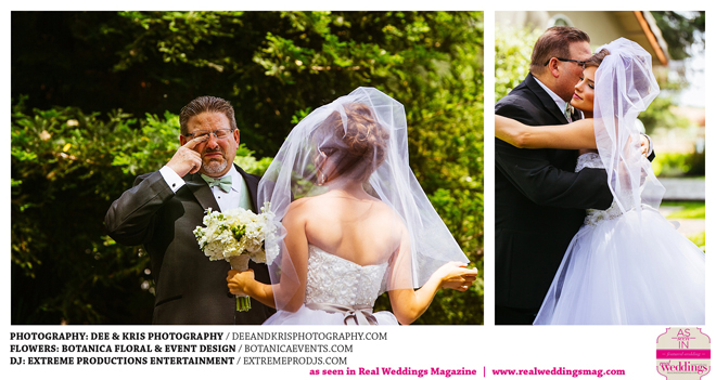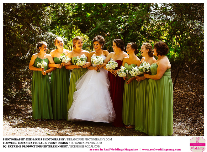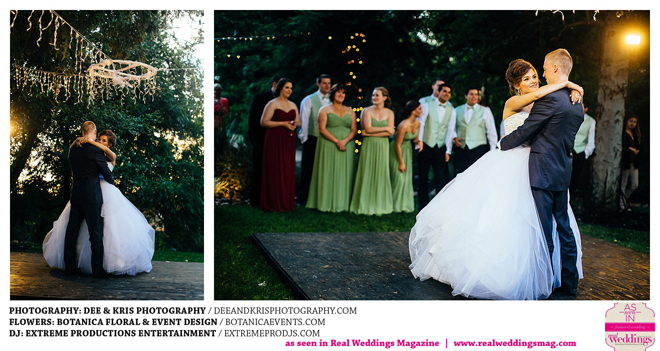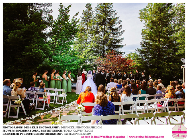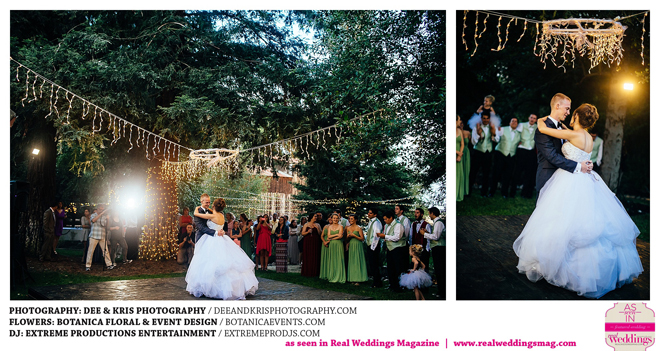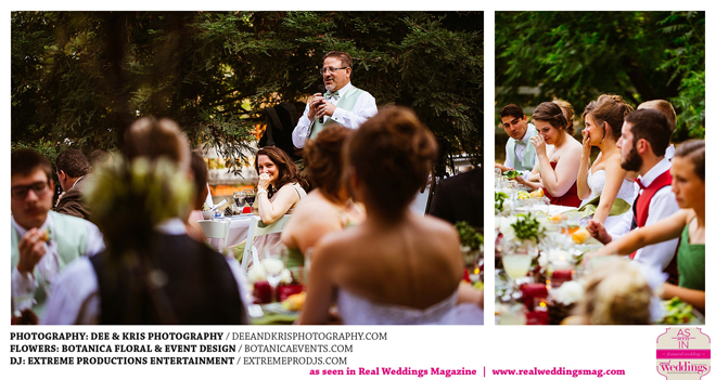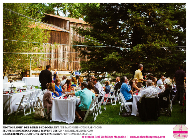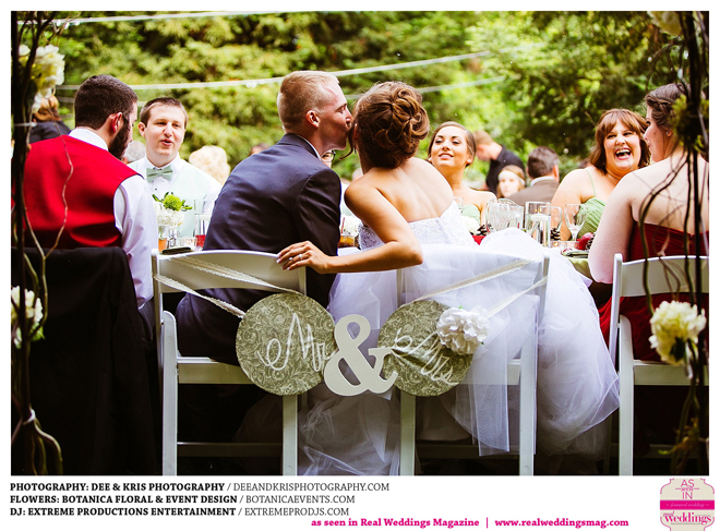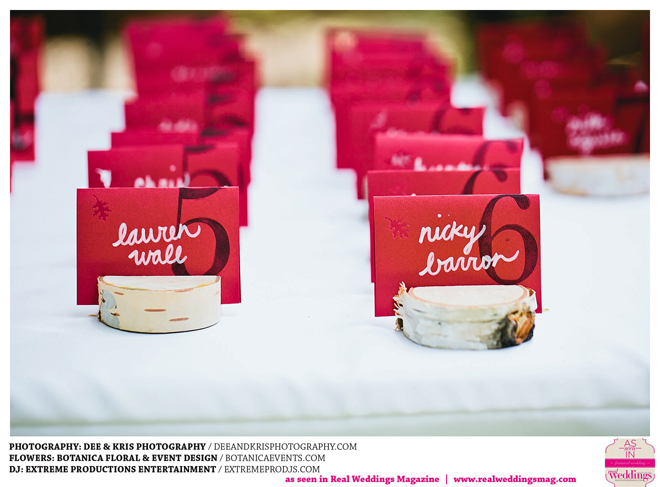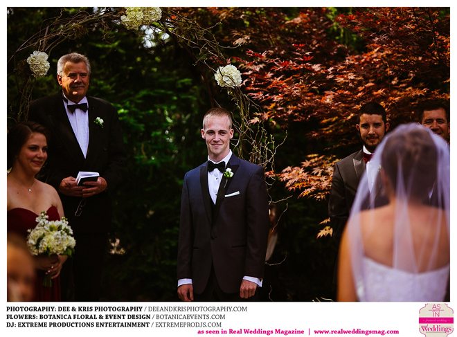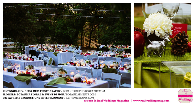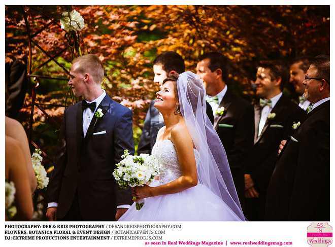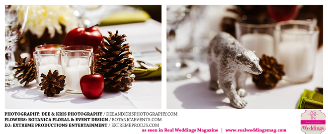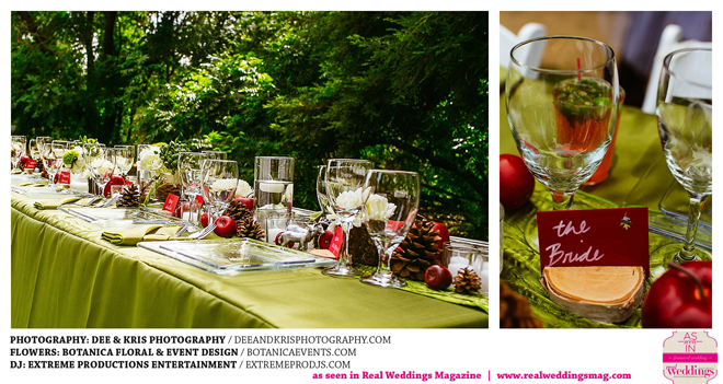 While the couple agreed to have the wedding in Drew’s hometown of Lodi, the bride-to-be wanted to bring a little of her own childhood to the party. “I created a woodland feel to the day…trees all around, pinecones and apples to bring the Washington theme in,” she shares. Other than those small personal touches, the couple had no real expectations for their big day. “We knew we would be married by five o-clock and hoped the dinner would taste good,” she adds.
