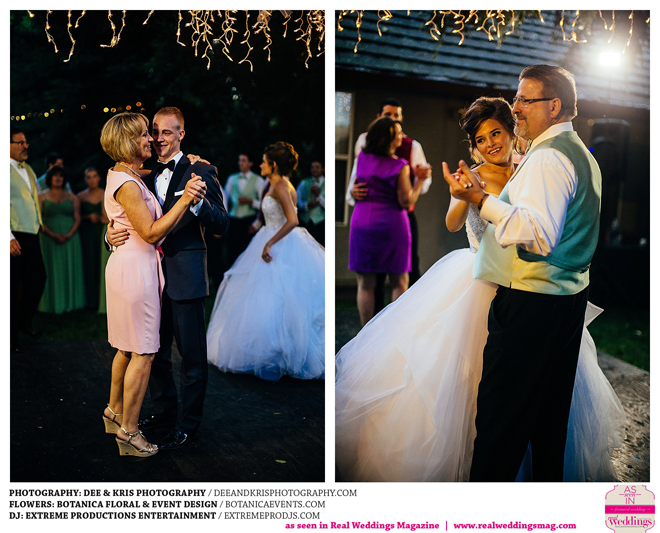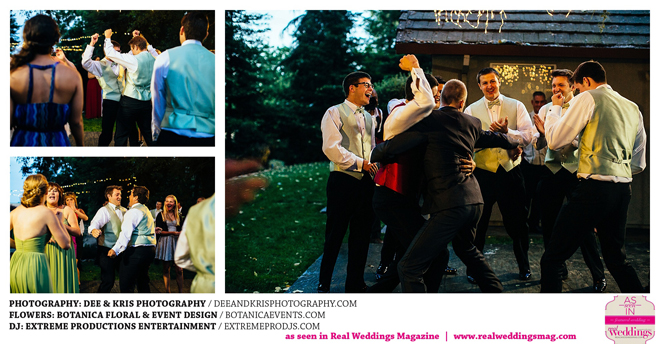 Guests moved on to the outdoor reception, sprinkled with candles, white lights, little silver woodland creatures and flowers on the table. With everyone laughing, dancing and dining on great food and a delicious cake, the couple admits that it was hard to leave at the end of the evening. But Samantha confides that one of her favorite memories of the night was the moment her new husband was trapped on the dance floor by his groomsmen. “He danced for a whole song, and it wasn’t a slow dance,” she says. “Drew never dances, so we all had so much fun just watching him let loose.”