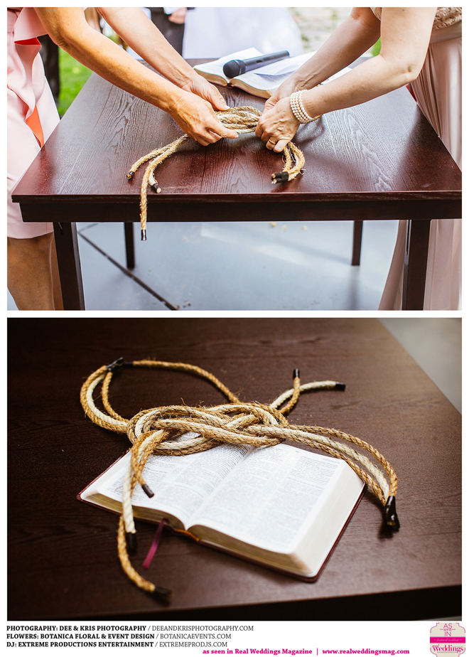 Beautiful weather accompanied a small and intimate ceremony. Both Samantha and Drew’s moms tied a sailor knot with two colors of rope, symbolizing the literal “tying the knot” and bringing the two families together. “Now we have the knot as a symbol of the first time our families came together officially,” she shares. “We are going to frame it and hang it in our home.”