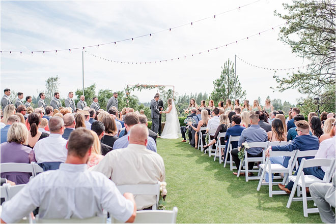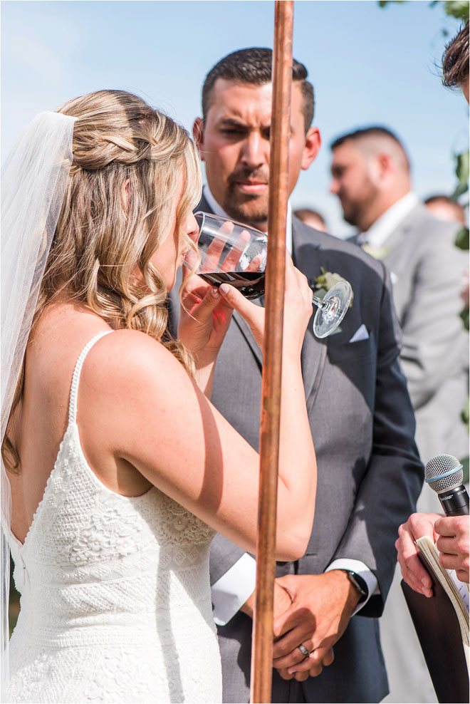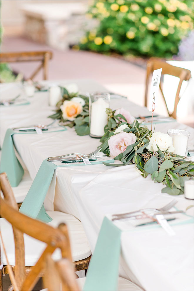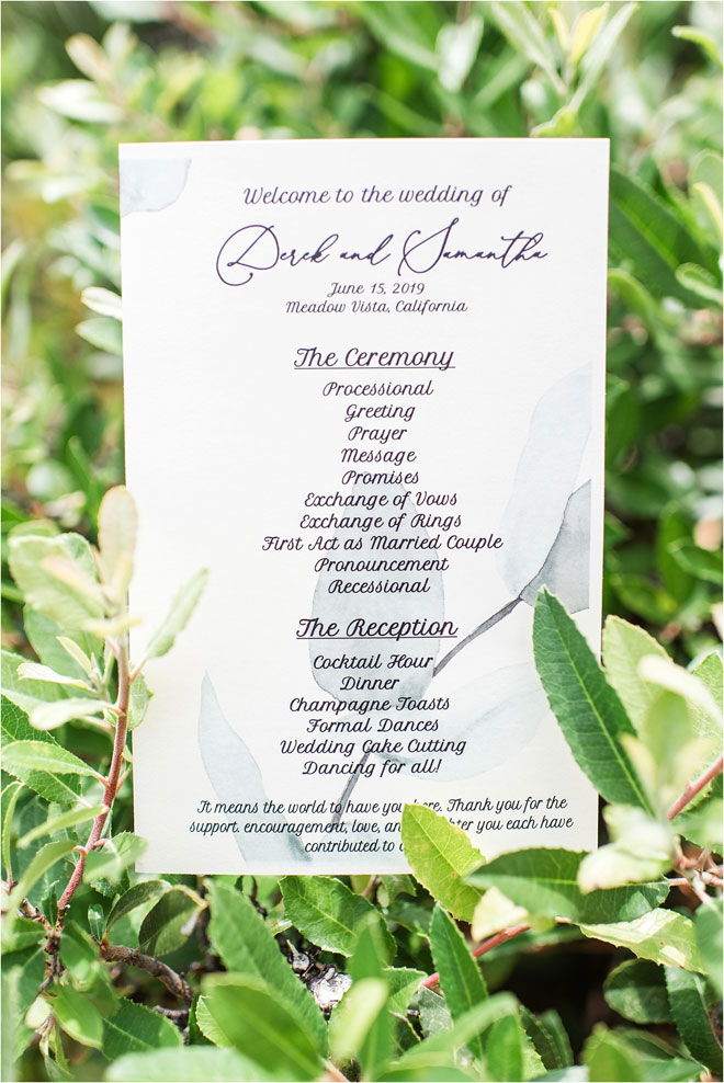 The couple’s ceremony, performed by Sam’s uncle, Matthew O’Leary, incorporated both traditional and contemporary elements. “Matt did a beautiful job outlining our story and incorporating Bible verses that reflected the values we identified as pillars of our relationship in the message he wrote,” says Sam. “Derek and I separately named three values. He wrote: trust, communication and support. I wrote: honesty, communication and kindness. Matt highlighted how comparable these values were!”