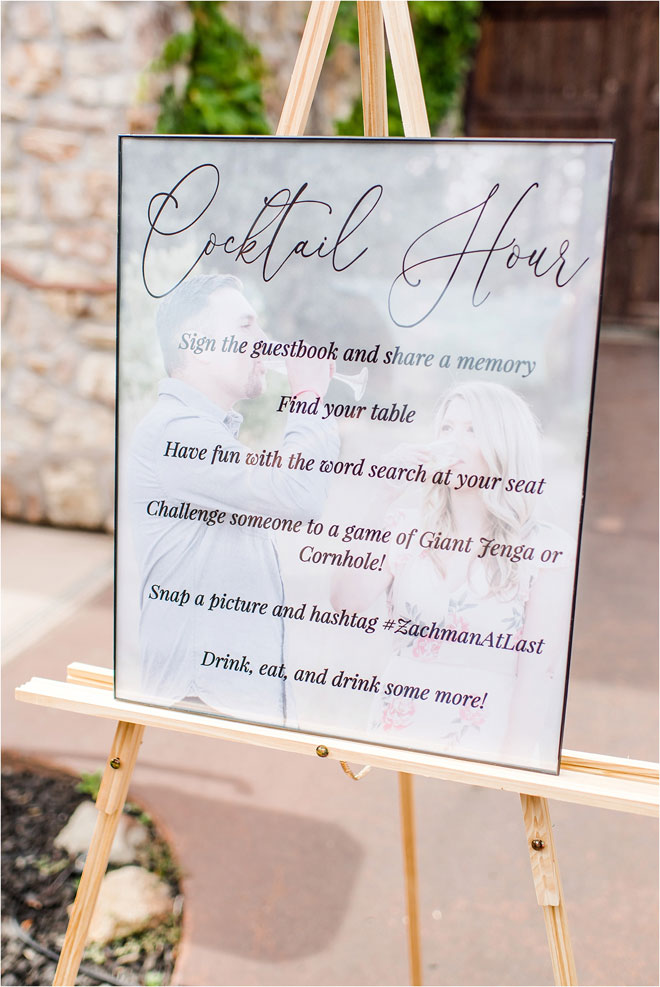 Keep it simple and focus on creating or incorporating a few unique details that you love. I absolutely loved pouring my energy into unique aspects of our wedding. My favorite detail was the personalized word search that I created. (My grandma, Connie, is the best and she tied every single ribbon onto each one.) It was placed at everyone’s seat with a pen attached as the favor. People had fun with it during cocktail hour. I loved this detail that was simple and unique!
