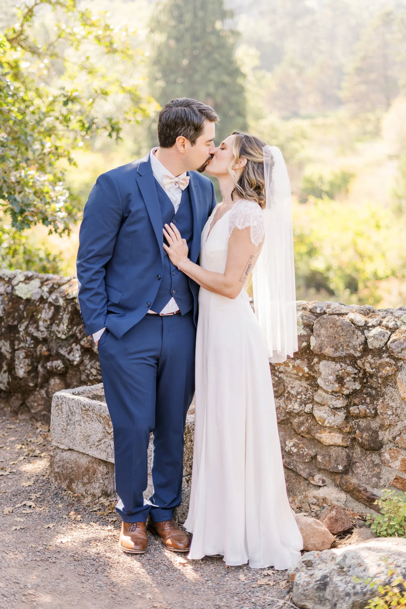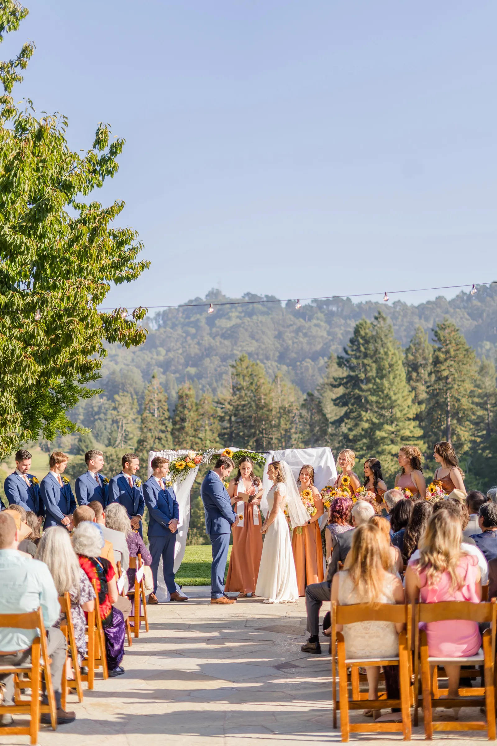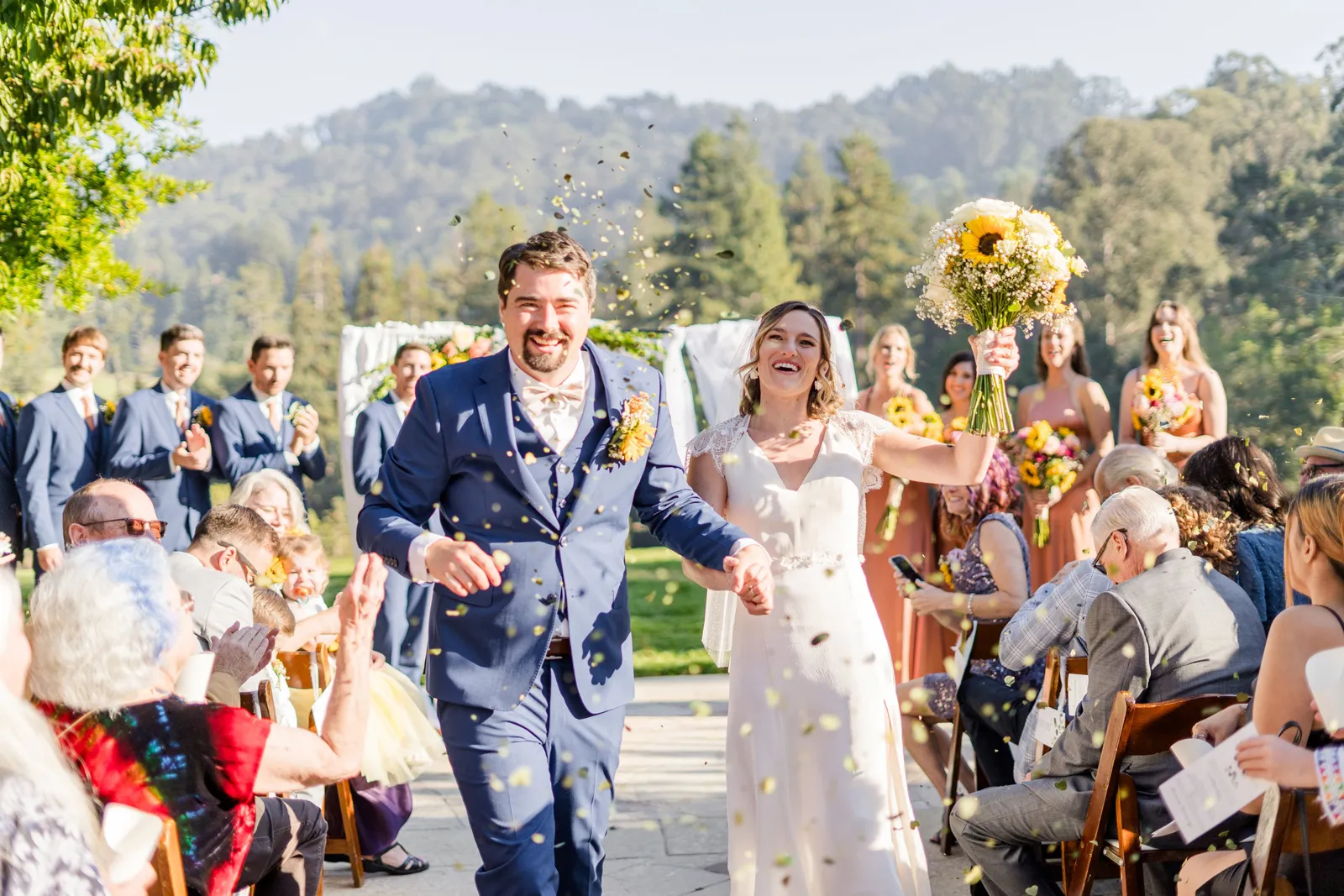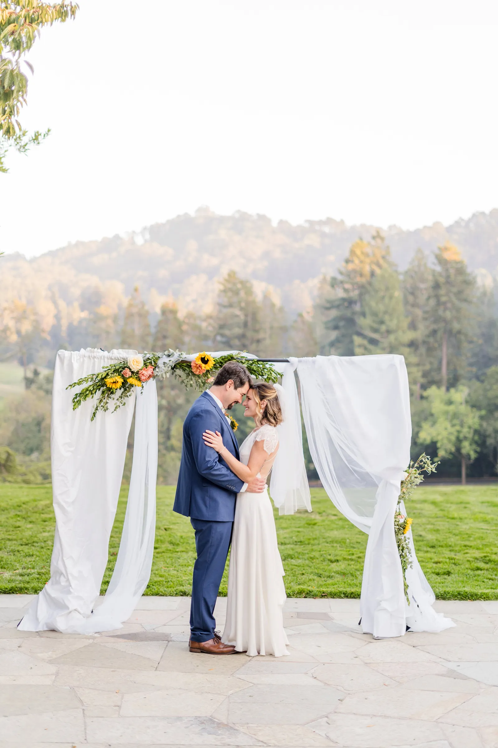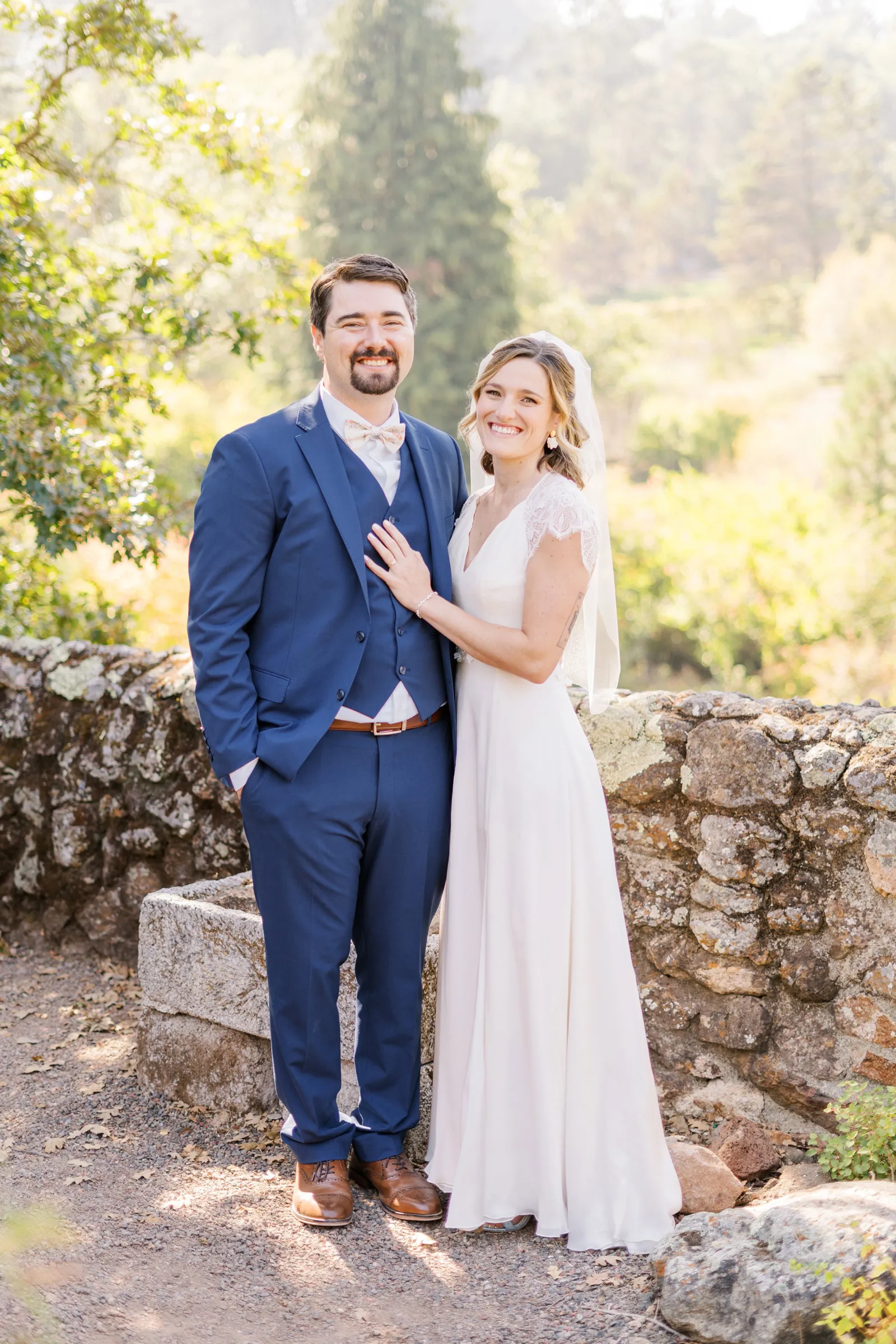 September of 2021 we went on a hike with a group of our closest friends in the same regional park as our venue. Under the guise of one of them moving away to nursing school the next day (“One last Berkeley hike before Fiona leaves!”). When we reached the peak, the groom said to the bride, “Let’s take a family photo!” (with our dog); then shocked the bride by getting down on one knee. Friends recorded the whole thing, and had brought champagne in their backpacks.