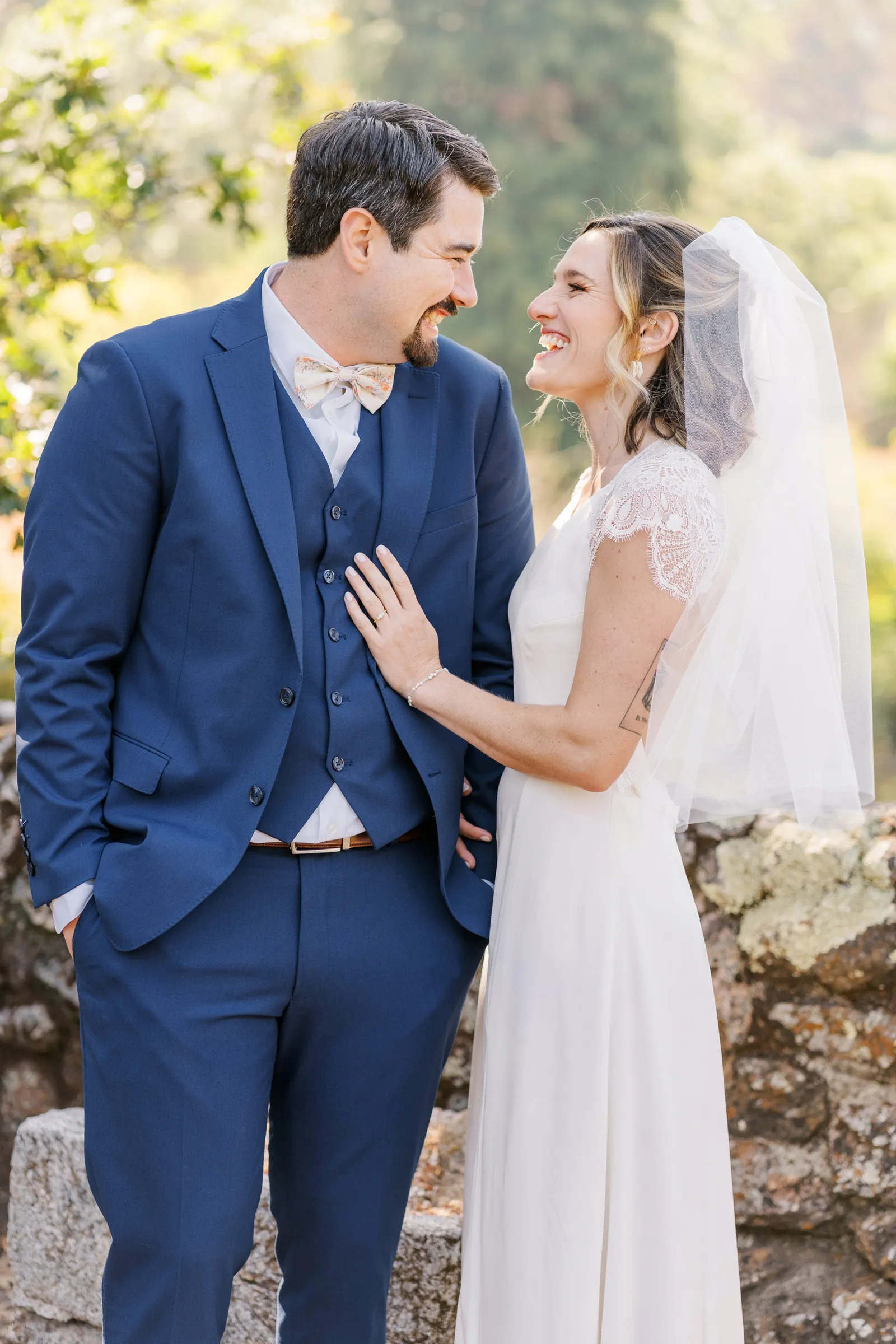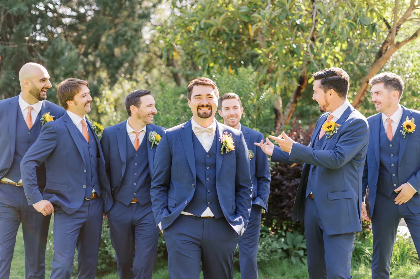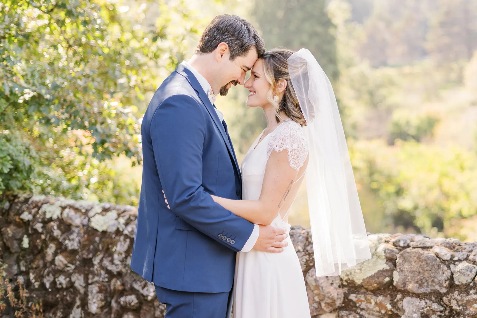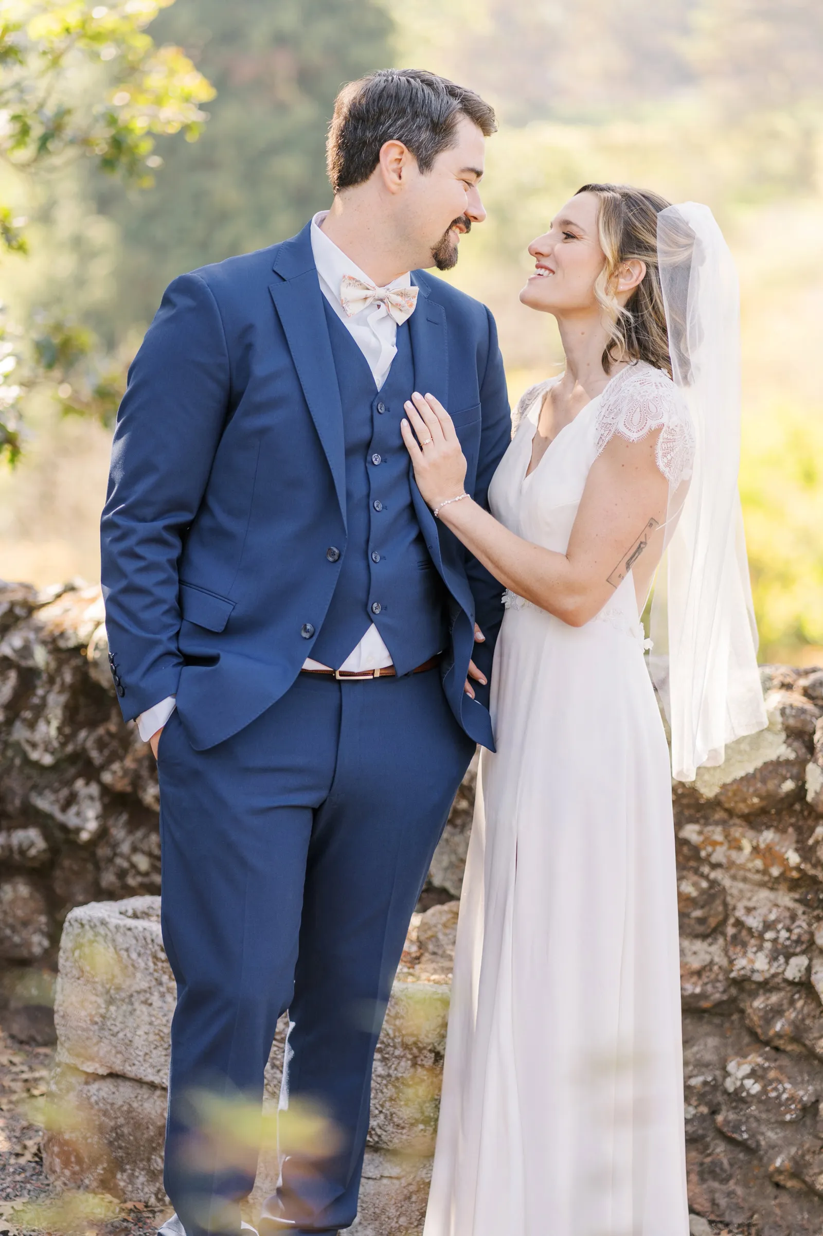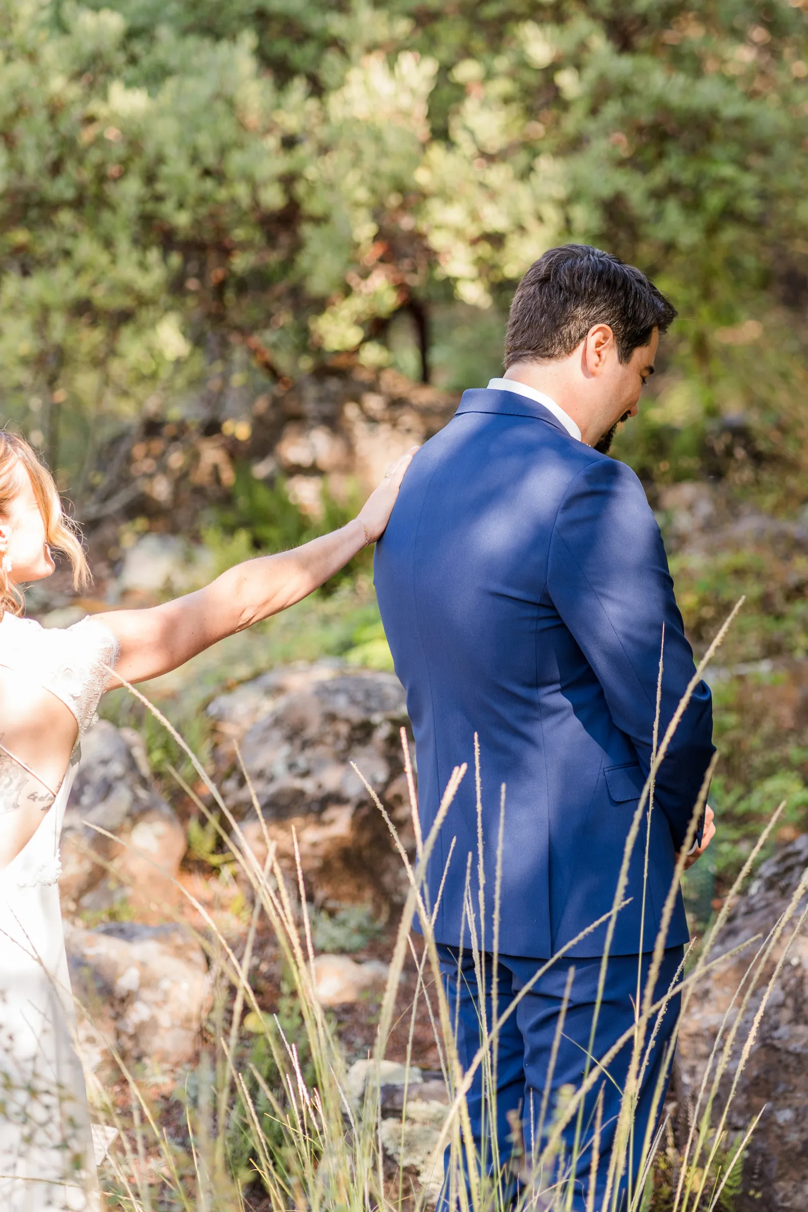 September of 2021 we went on a hike with a group of our closest friends in the same regional park as our venue. Under the guise of one of them moving away to nursing school the next day (“One last Berkeley hike before Fiona leaves!”). When we reached the peak, the groom said to the bride, “Let’s take a family photo!” (with our dog); then shocked the bride by getting down on one knee. Friends recorded the whole thing, and had brought champagne in their backpacks.