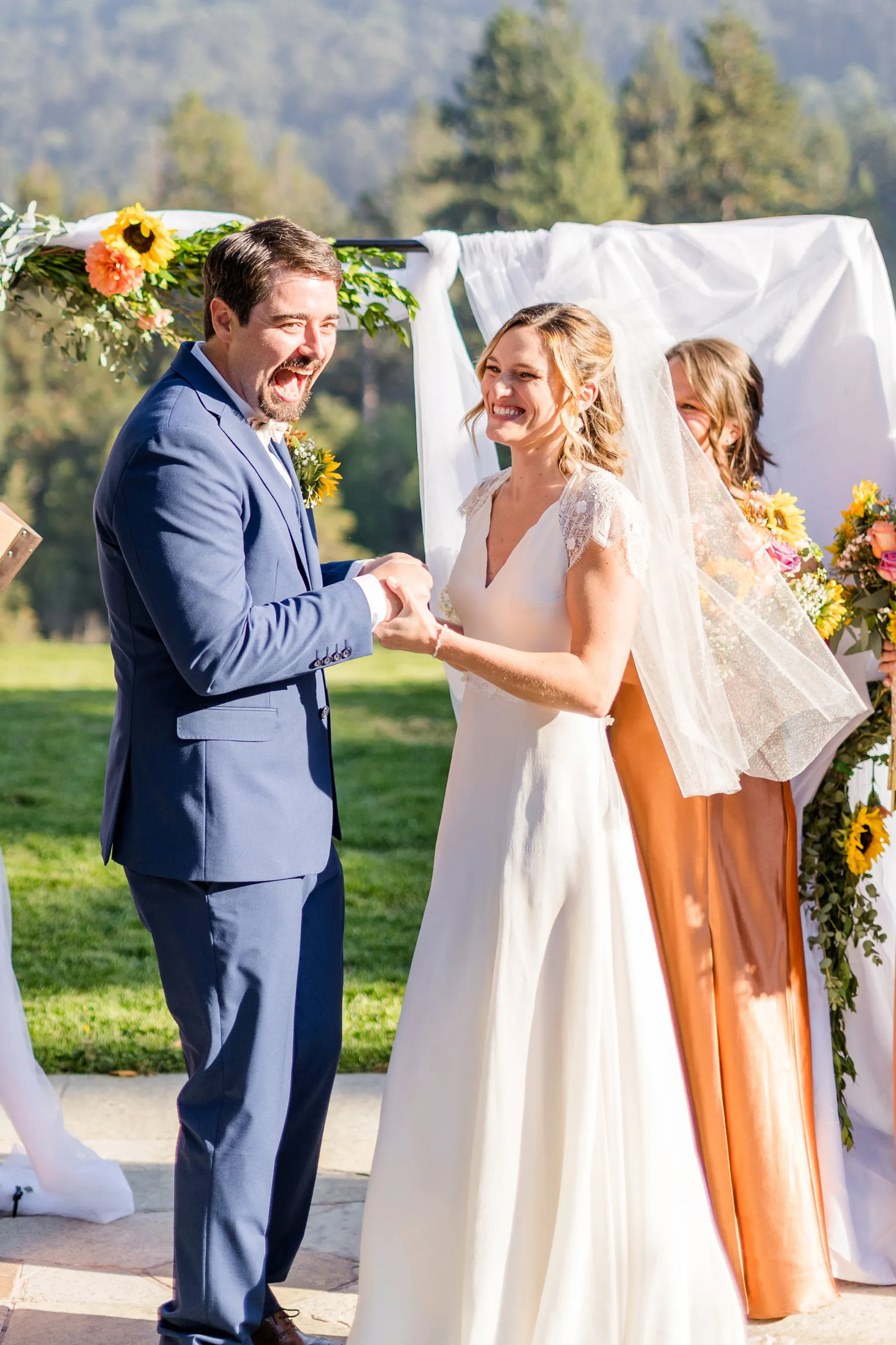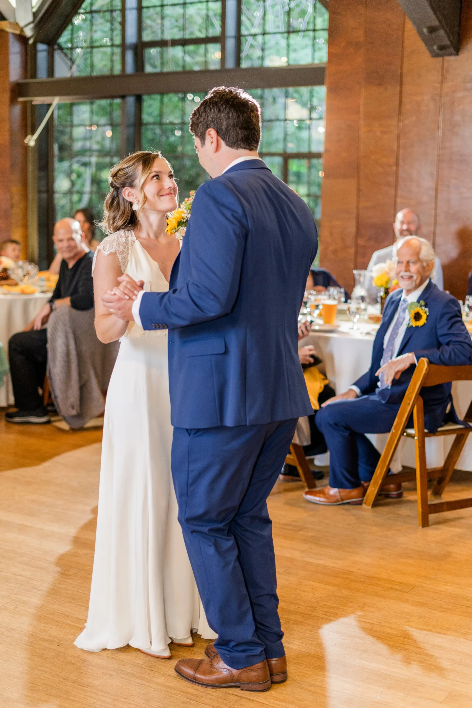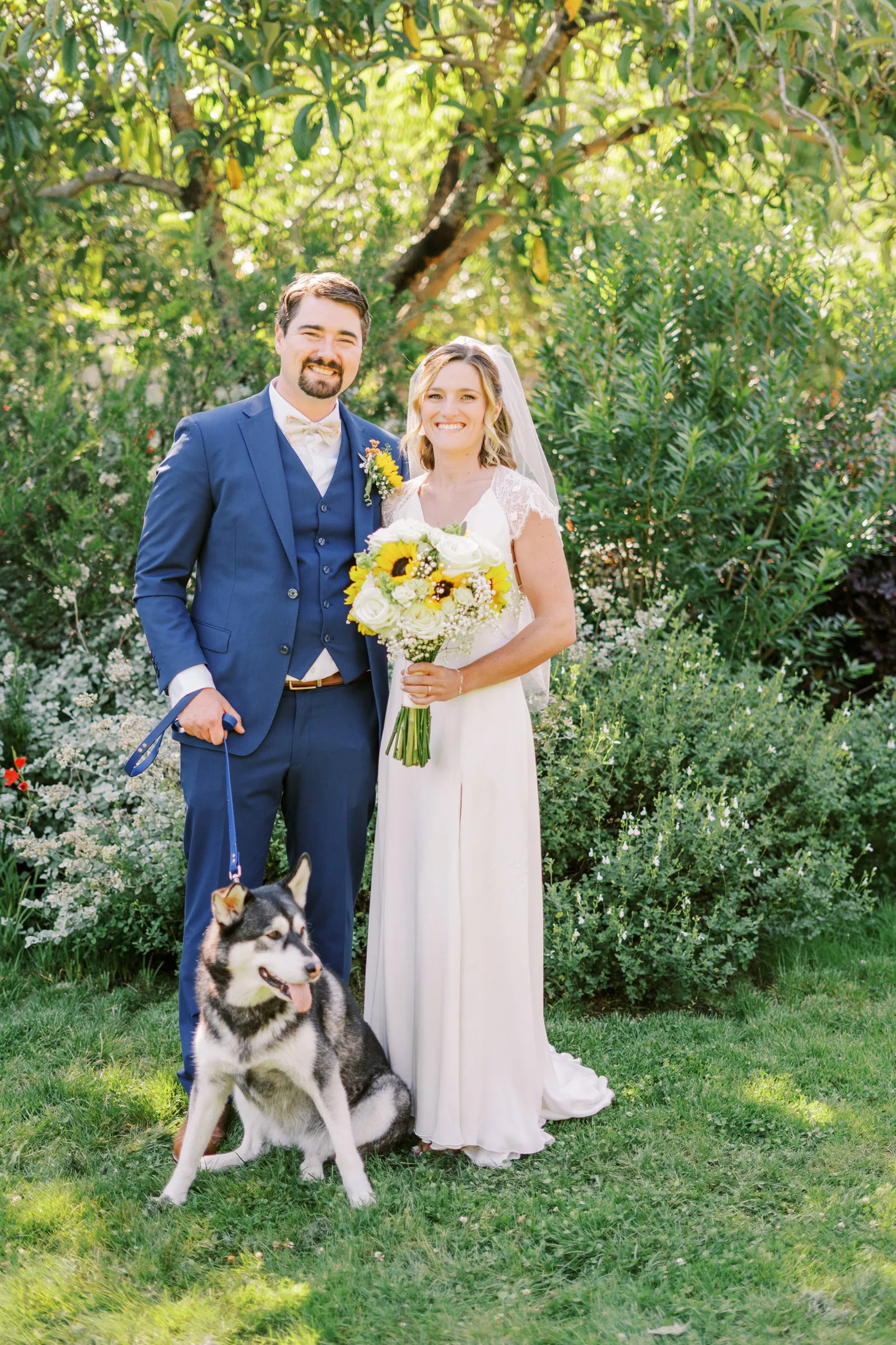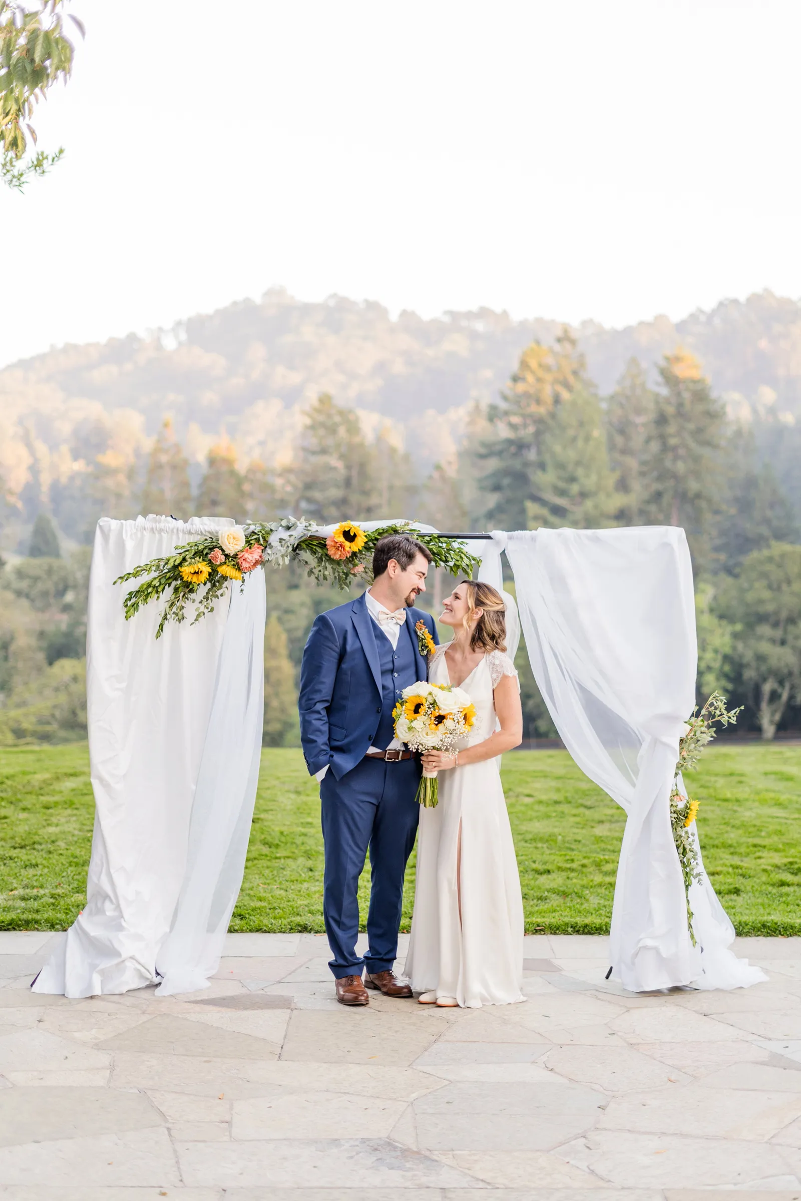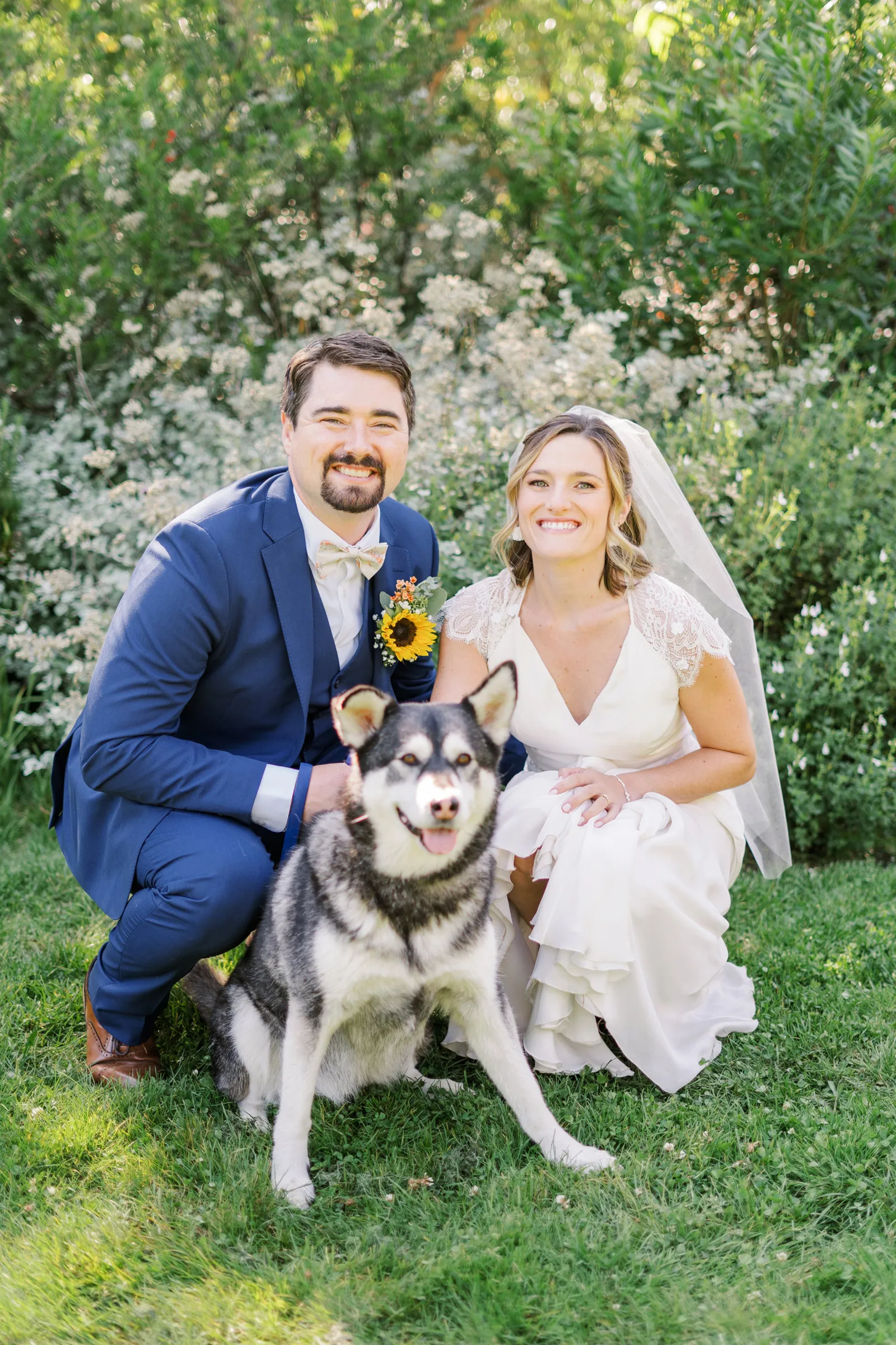 Sunflowers. We wanted our families to get together for a happy occasion… and have fun. We wanted outdoor/indoor, and luckily wildfire smoke cooperated (somewhat). We wanted our mutual friend and matchmaker to officiate. We wanted to take a few photos with our dog. These were our biggest expectations.