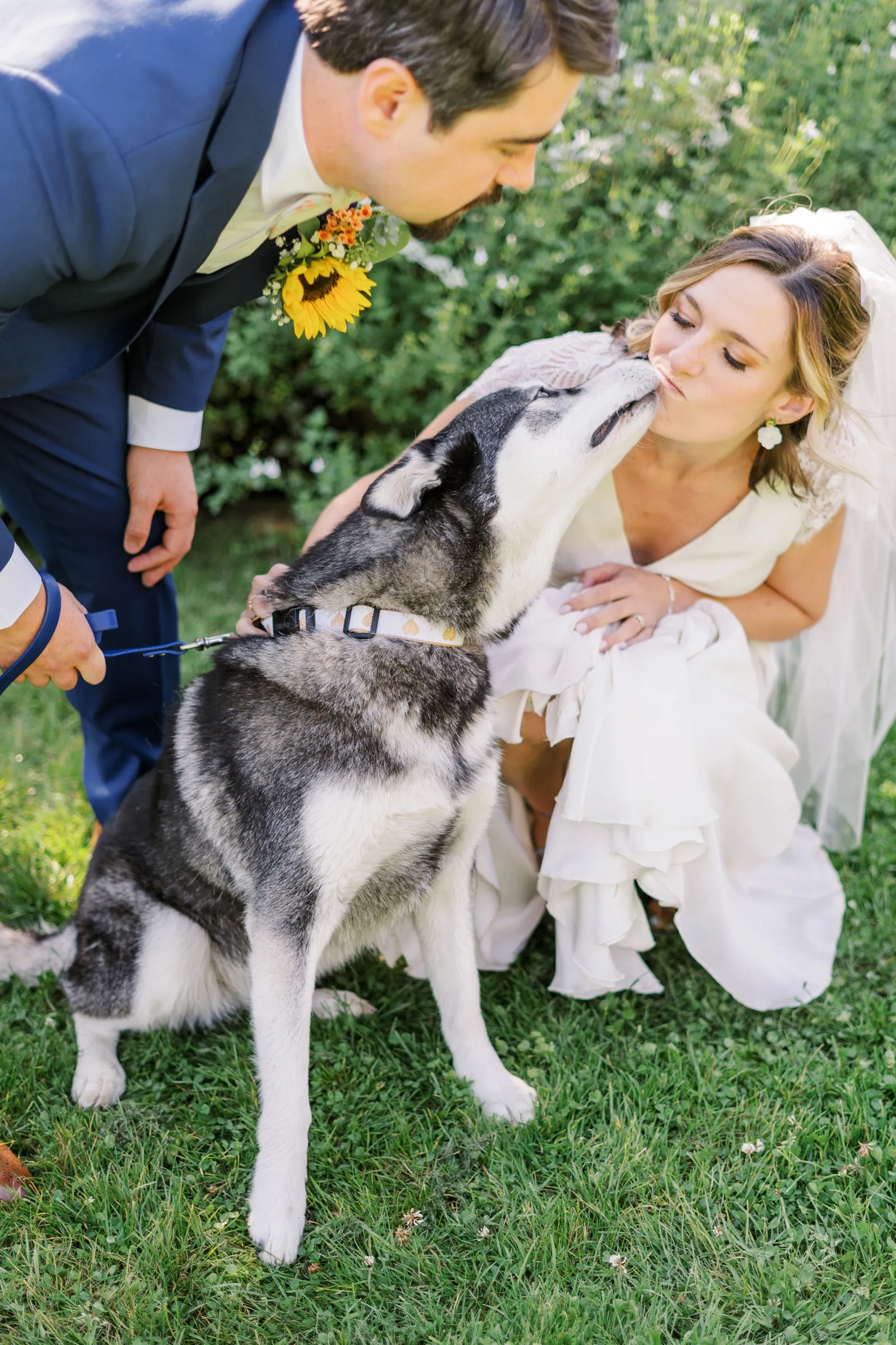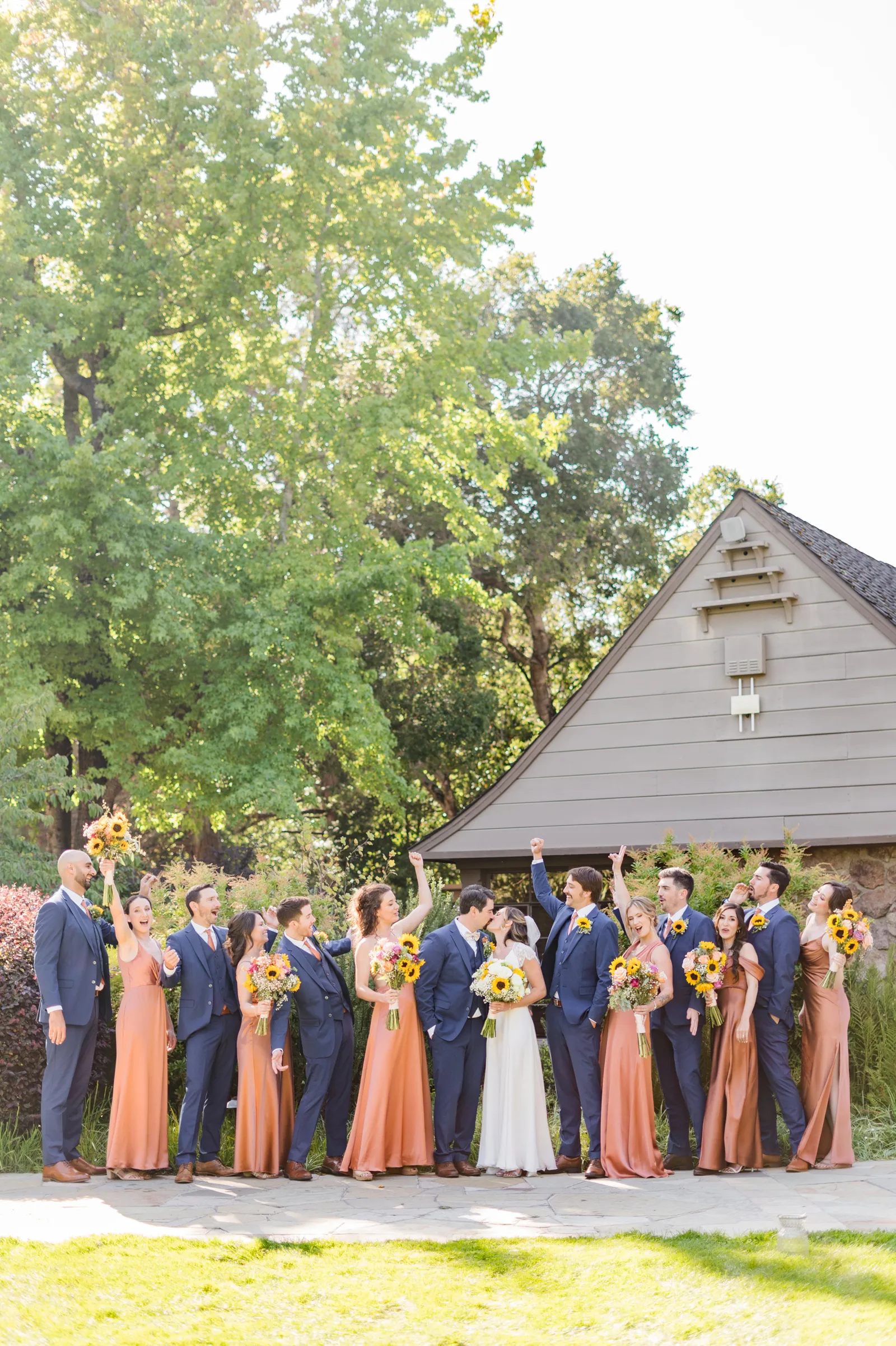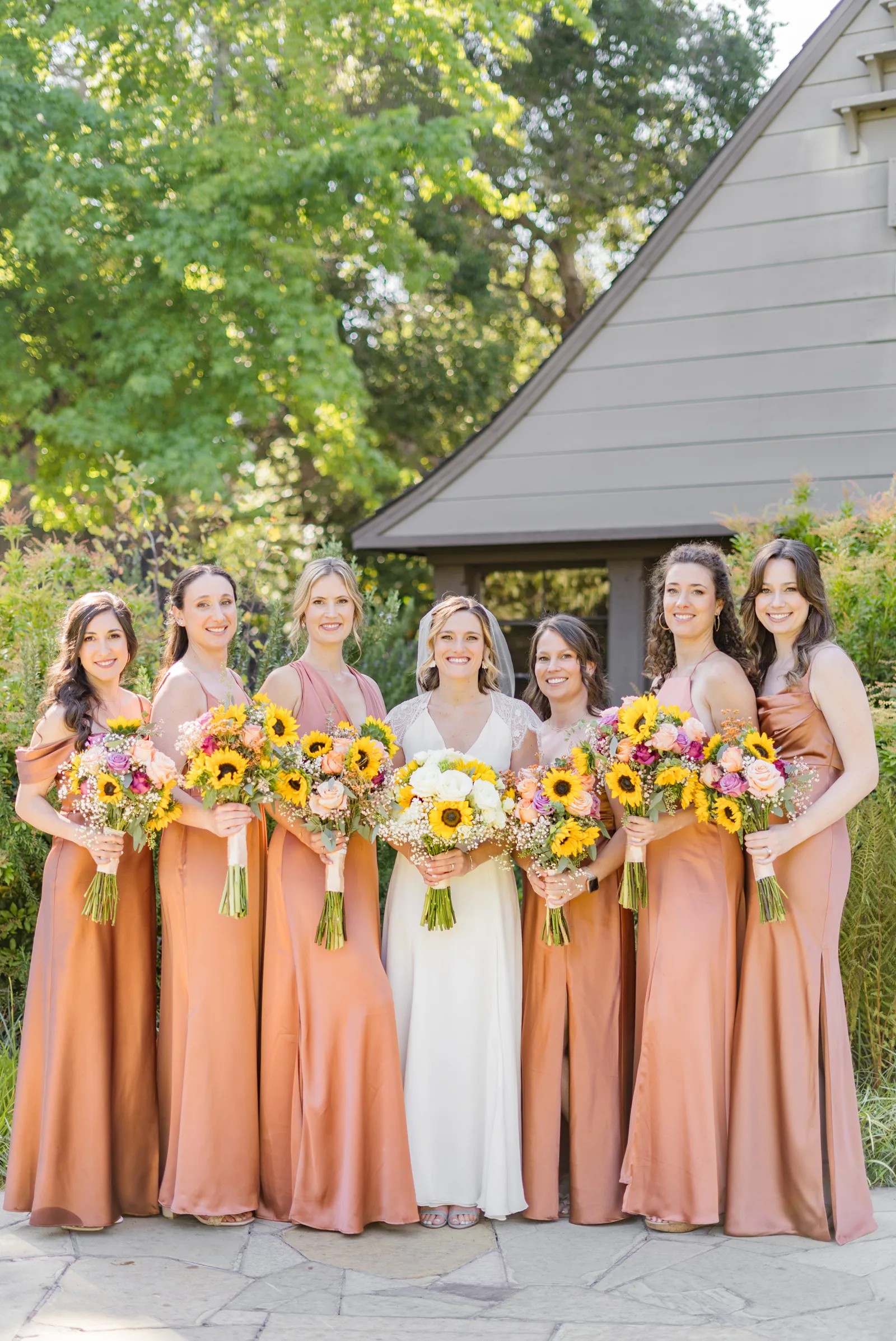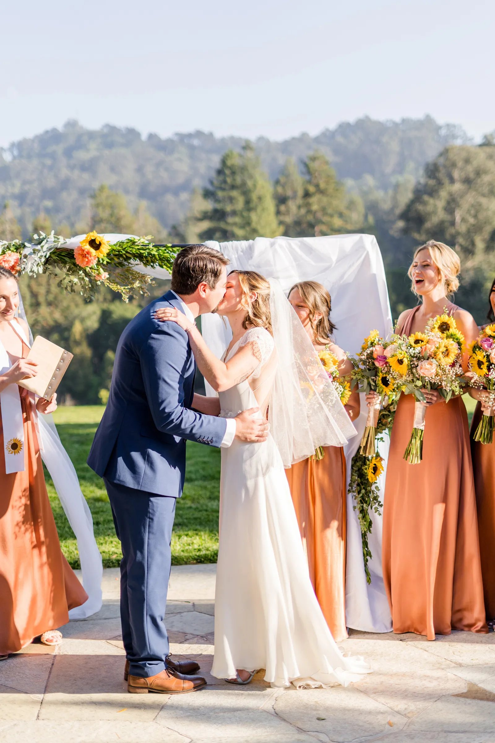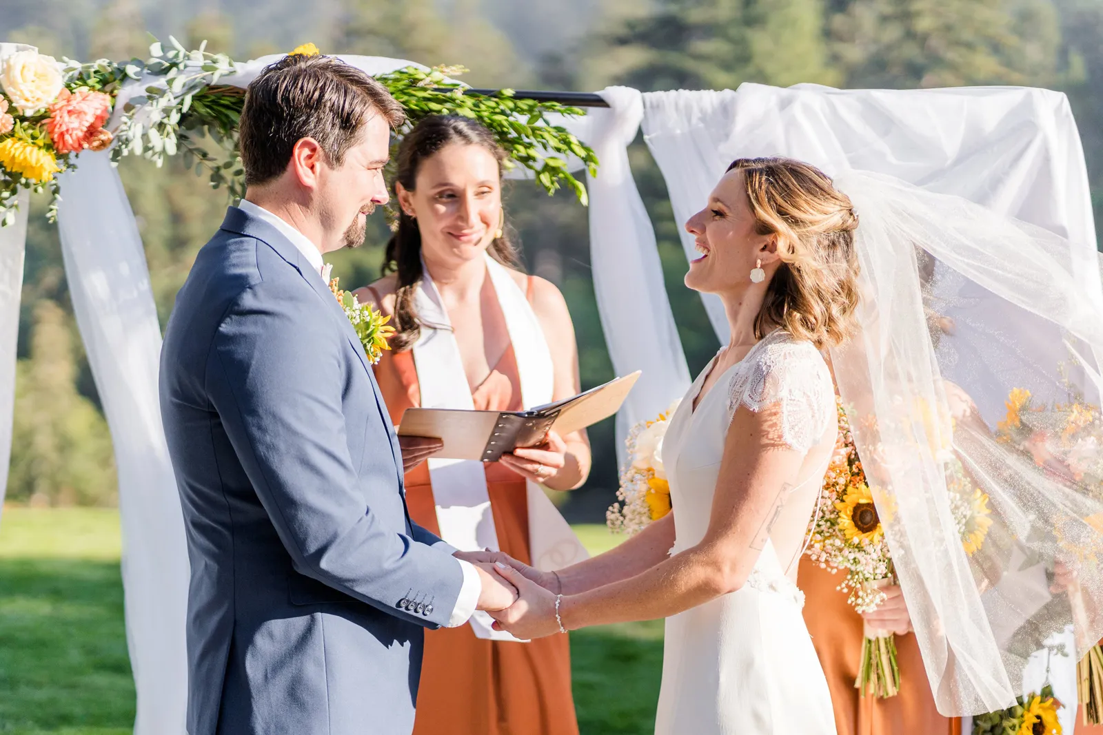 Sunflowers. We wanted our families to get together for a happy occasion… and have fun. We wanted outdoor/indoor, and luckily wildfire smoke cooperated (somewhat). We wanted our mutual friend and matchmaker to officiate. We wanted to take a few photos with our dog. These were our biggest expectations.