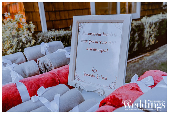 Sam and Nick were sure to think of everything for their guests that day; they provided warm blankets during their outdoor ceremony and kindly allowed guests to take them home. Even with those fabulous keepsakes, Sam says what she wants guests to remember most is their love. “We hope our guests remember the energy, our smiles, and the amazing time we all had celebrating our union.”