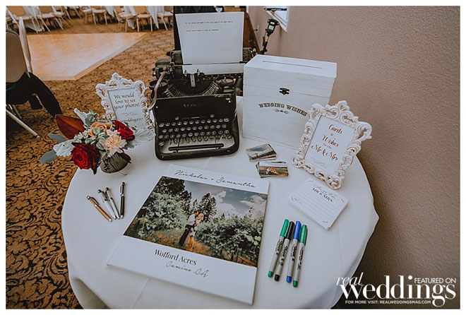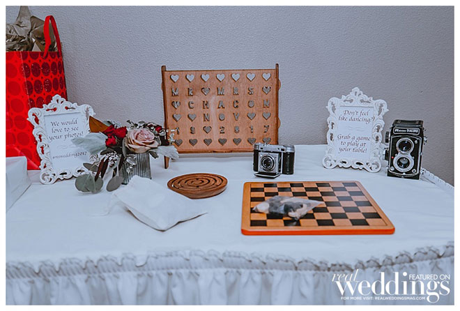 “We picked photos of our many travels and adventures to be displayed in ornate frames on each of the tables,” she explains when describing the ways in which they were innovative and unafraid to step outside of the box. They also provided an alternative to dancing for guests who forgot their dancing shoes with atable of handmade wooden games like Jenga, Connect Four, tic-tac-toe and chess.