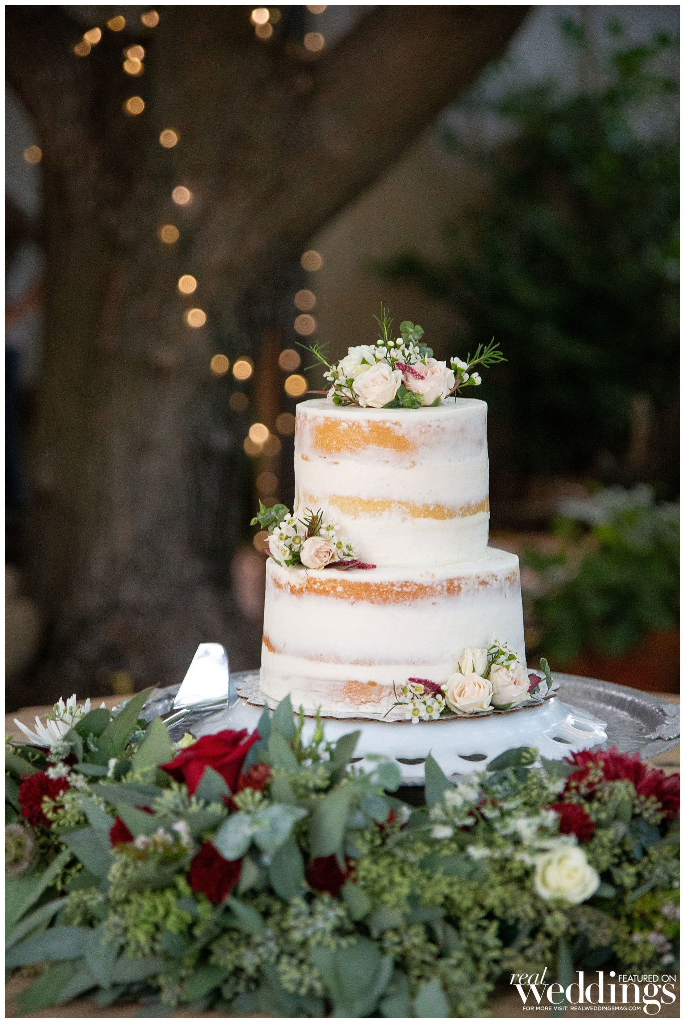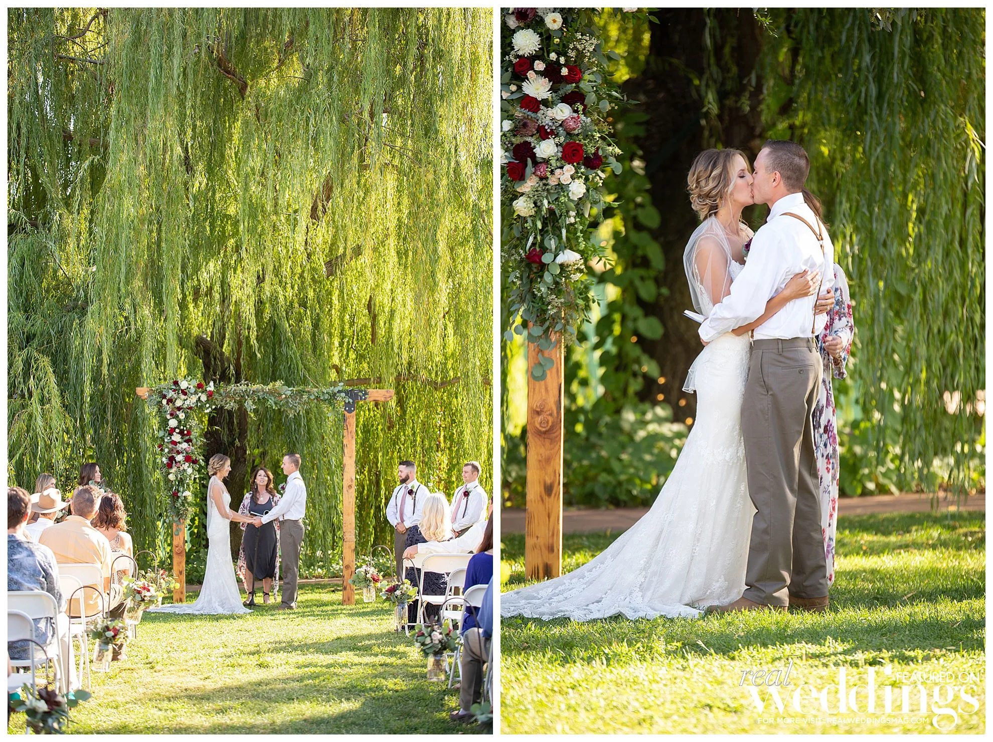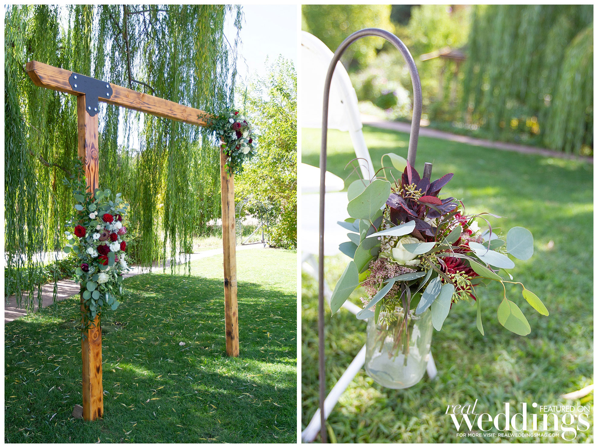 The couple exchanged vows in front of a weeping willow and freshwater pond. “It’s still one of my favorite places, as it is just so beautiful,” shares Sarah. “The aisle was lined with shepherd’s hooks and floral arrangements as well as two huge floral pieces on wine barrels on either side; it was just so pretty and there were flowers everywhere just like I wanted.”