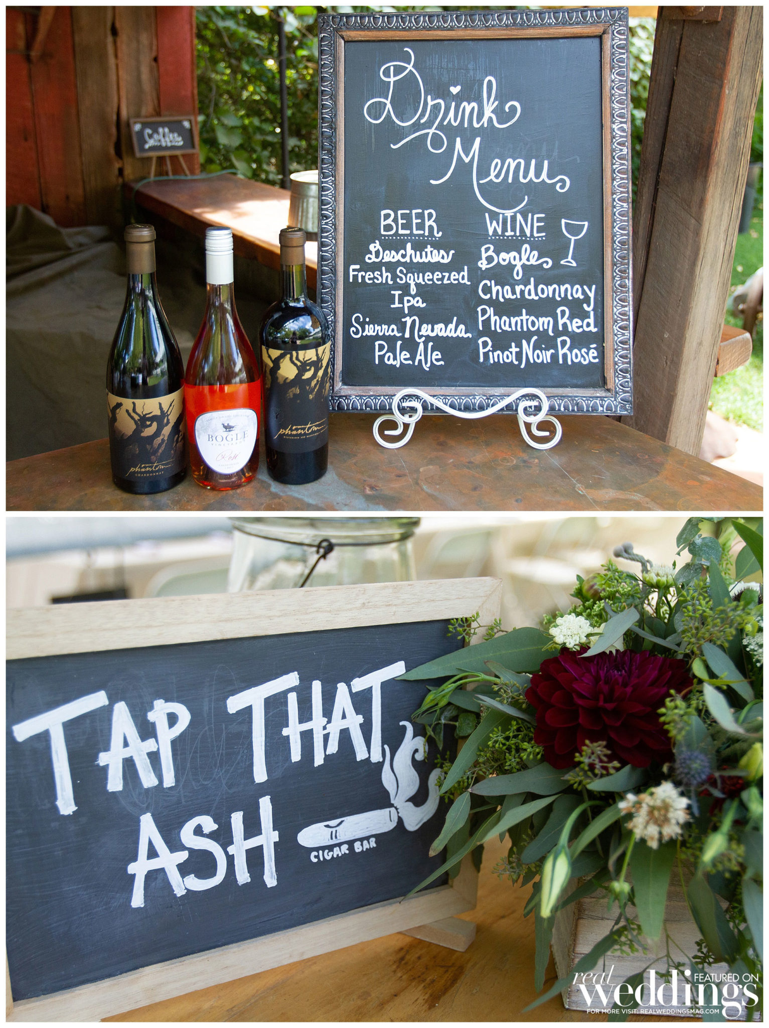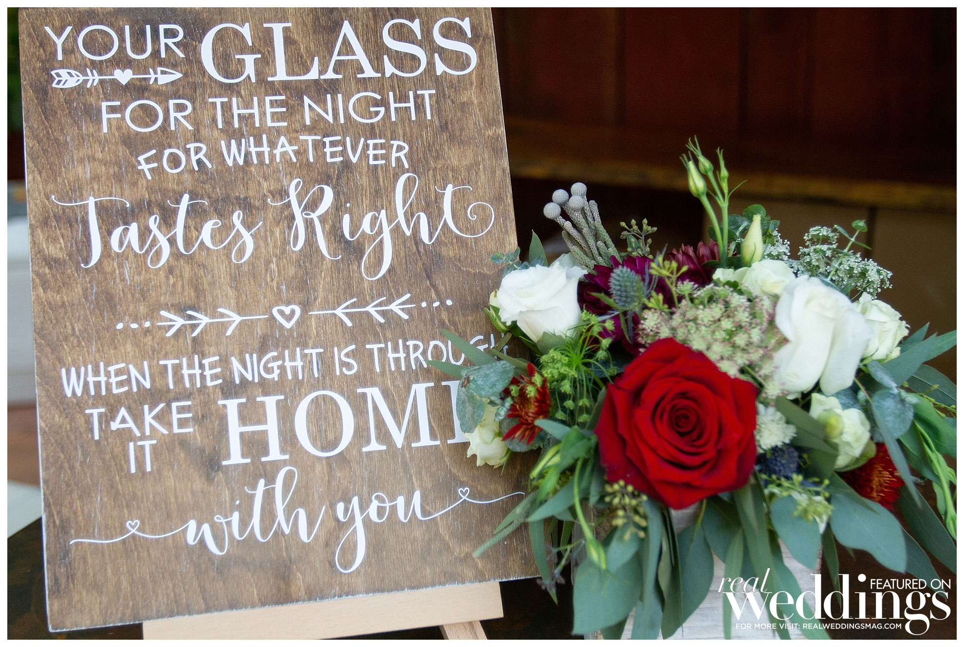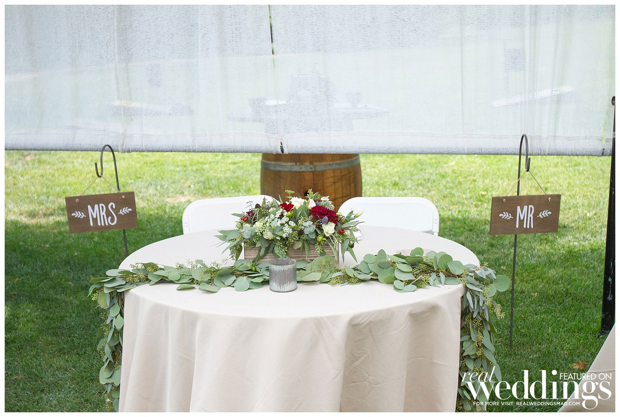 Flowers are the bride’s favorite part of the wedding, so she especially enjoyed picking her flowers and centerpieces. “I loved all of our arrangements—from the big pieces on the wine barrels, to my bouquet, the eucalyptus garland and the floral arrangement on the arbor where our ceremony took place,” she says.