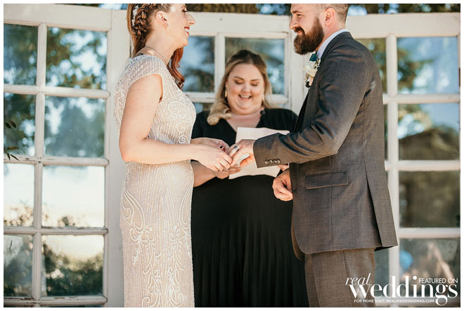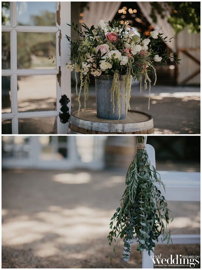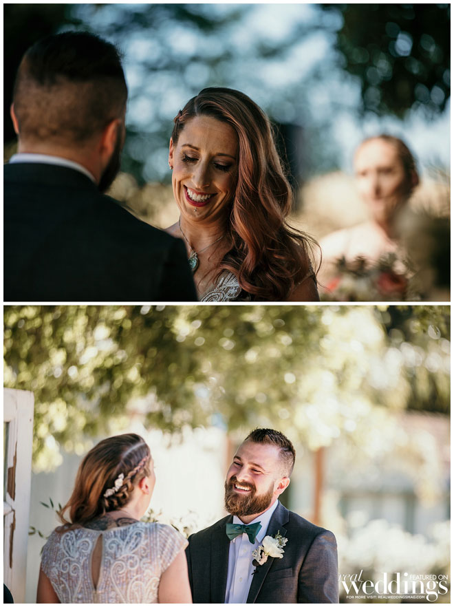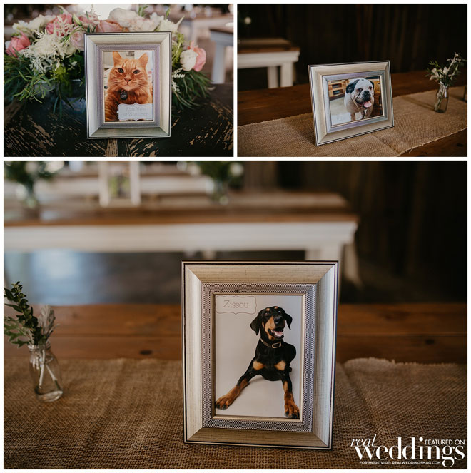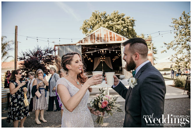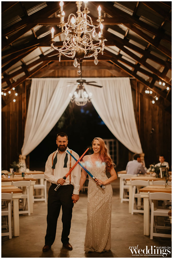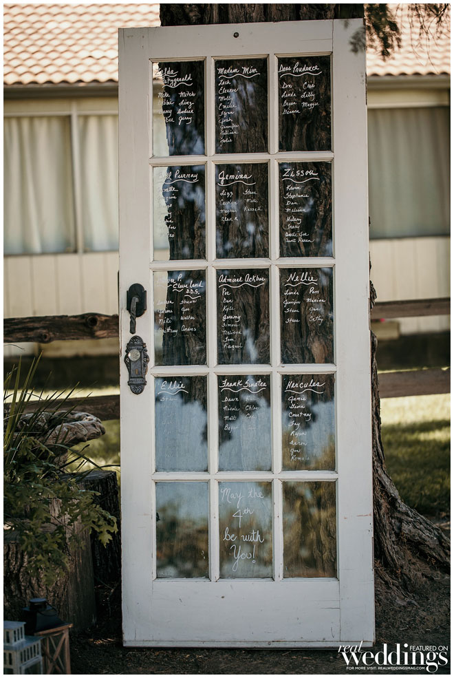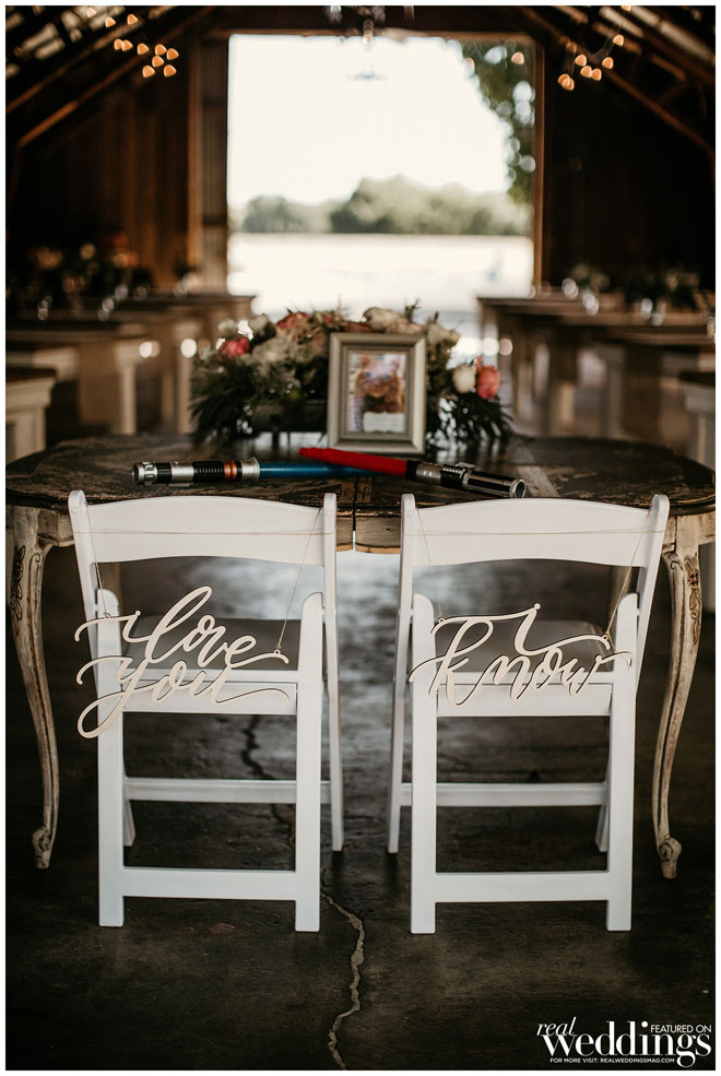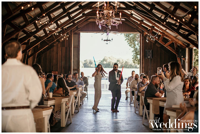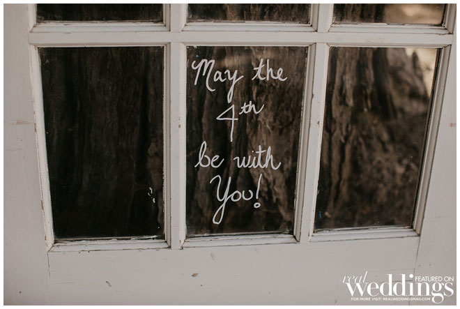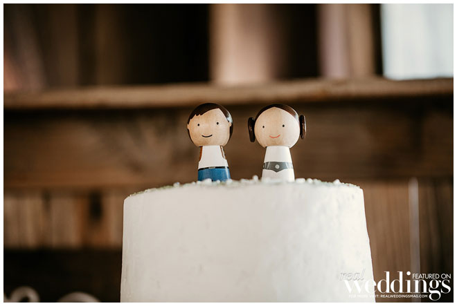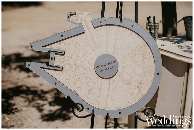 As self-proclaimed Star Wars nerds, Sarah and Jon decided early on they wanted the wedding to happen on May 4th (you know, May the Fourth be with you). “Lightsaber and Millennium Falcon guest books? Check! Chewie roar at the kiss? Check! Table numbers with photos all of our cats and dogs and favorite foster animals? Check,” beams the bride. Sarah works at the Sacramento SPCA so they wanted to also fit in the animals somewhere.