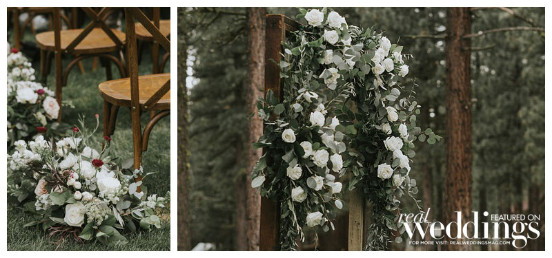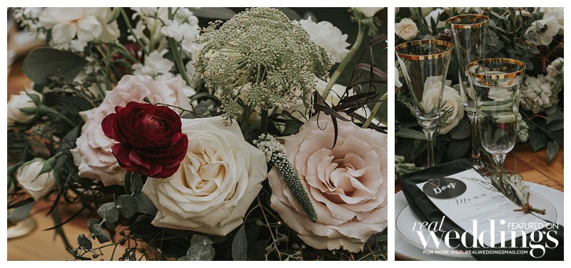Jenn from Jenn Robirds Events picked all of our florals; they consisted of white peonies, white moonstone roses, white O’Haras, dusty pink quicksand roses, white anemone, white tulips, burgundy ranunculus, burgundy chocolate lace, three different kinds of eucalyptus, olive branches, bay leaf, Italian ruscus, brake fern, jasmine vine, lemon leaf tips and so much more.
