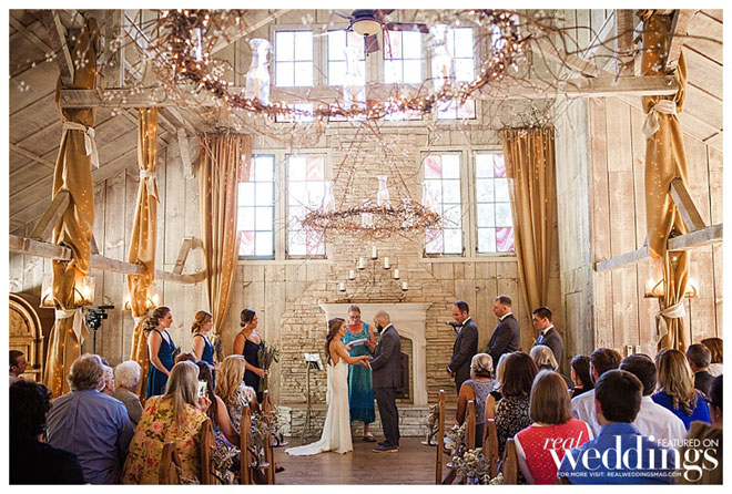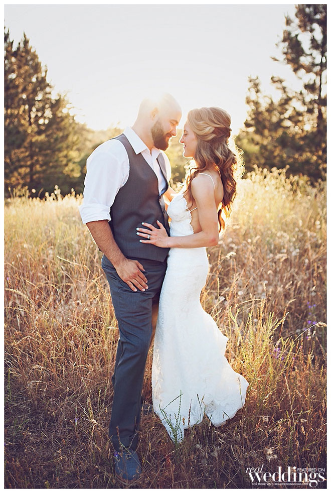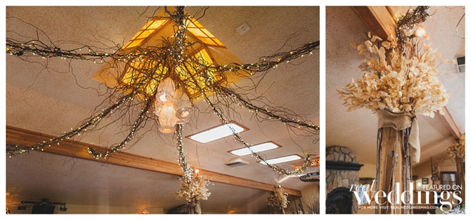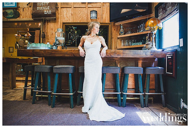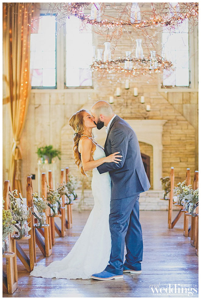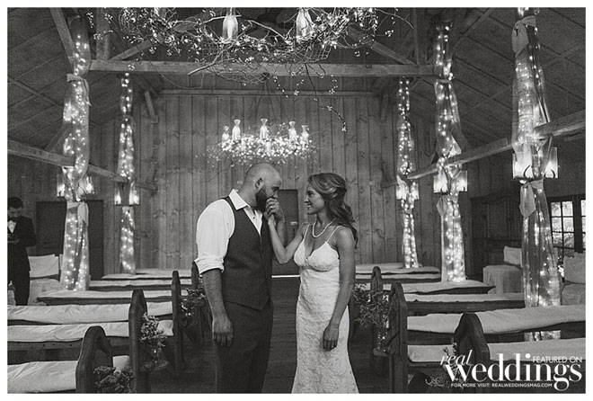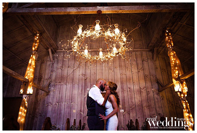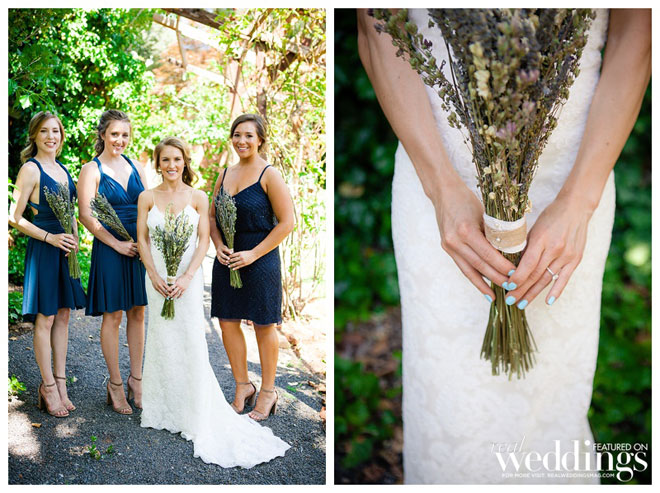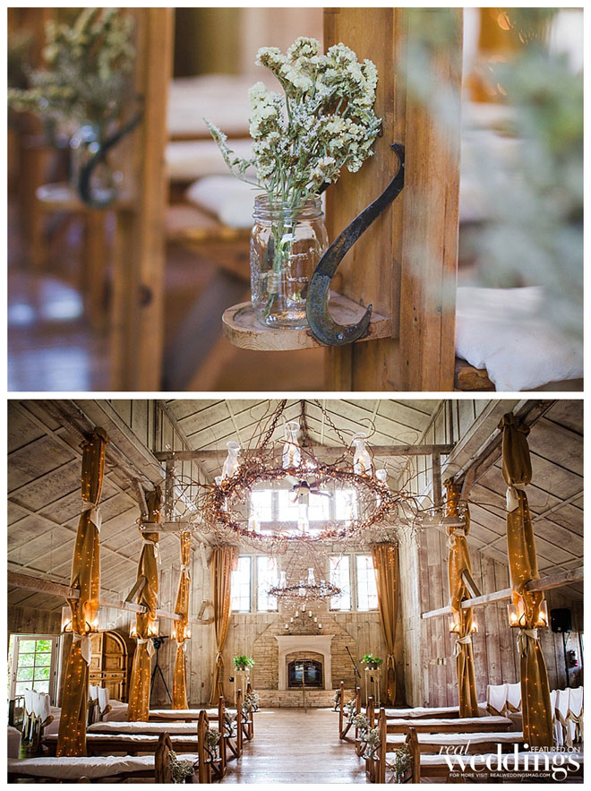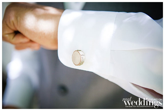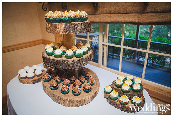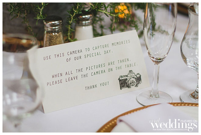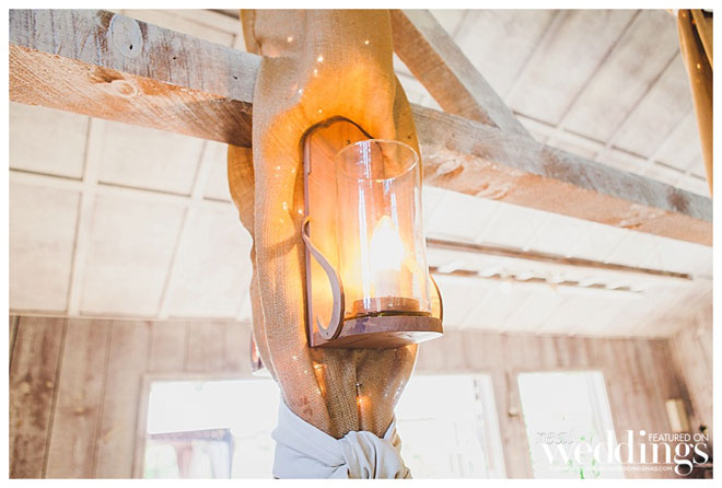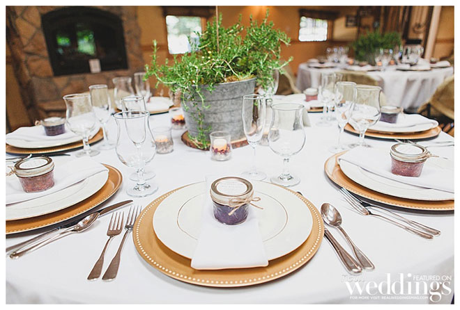 For their wedding, Sarah wanted living, breathing, beautiful and cascading rosemary for her centerpieces mixed with dried plants. “We planted 14 rosemary plants in galvanized buckets and grew them for over a year in preparation,” she says. “Our taste and style is industrial rustic, so we tried to really reflect that in all of the décor.” Putting time and effort into every detail, the couple even cut wood rounds for the centerpieces from a log in their backyard.