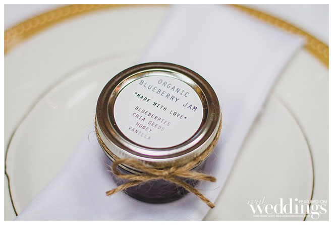 Favors were jars of homemade Organic Strawberry and Blueberry Chia Seed Jam. The bride, her mother, and the groom’s mother spent hours making the jam and canning it into jars.