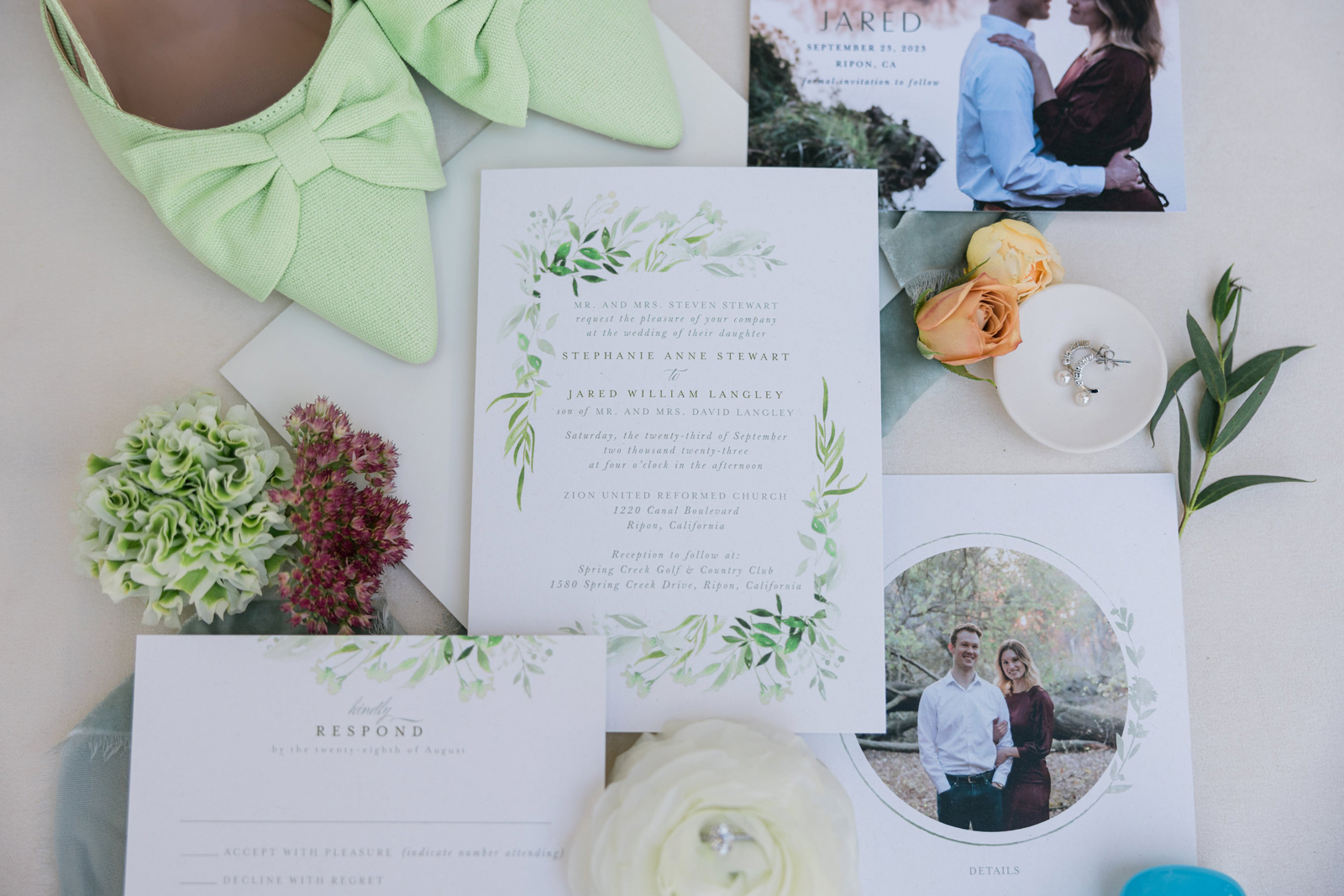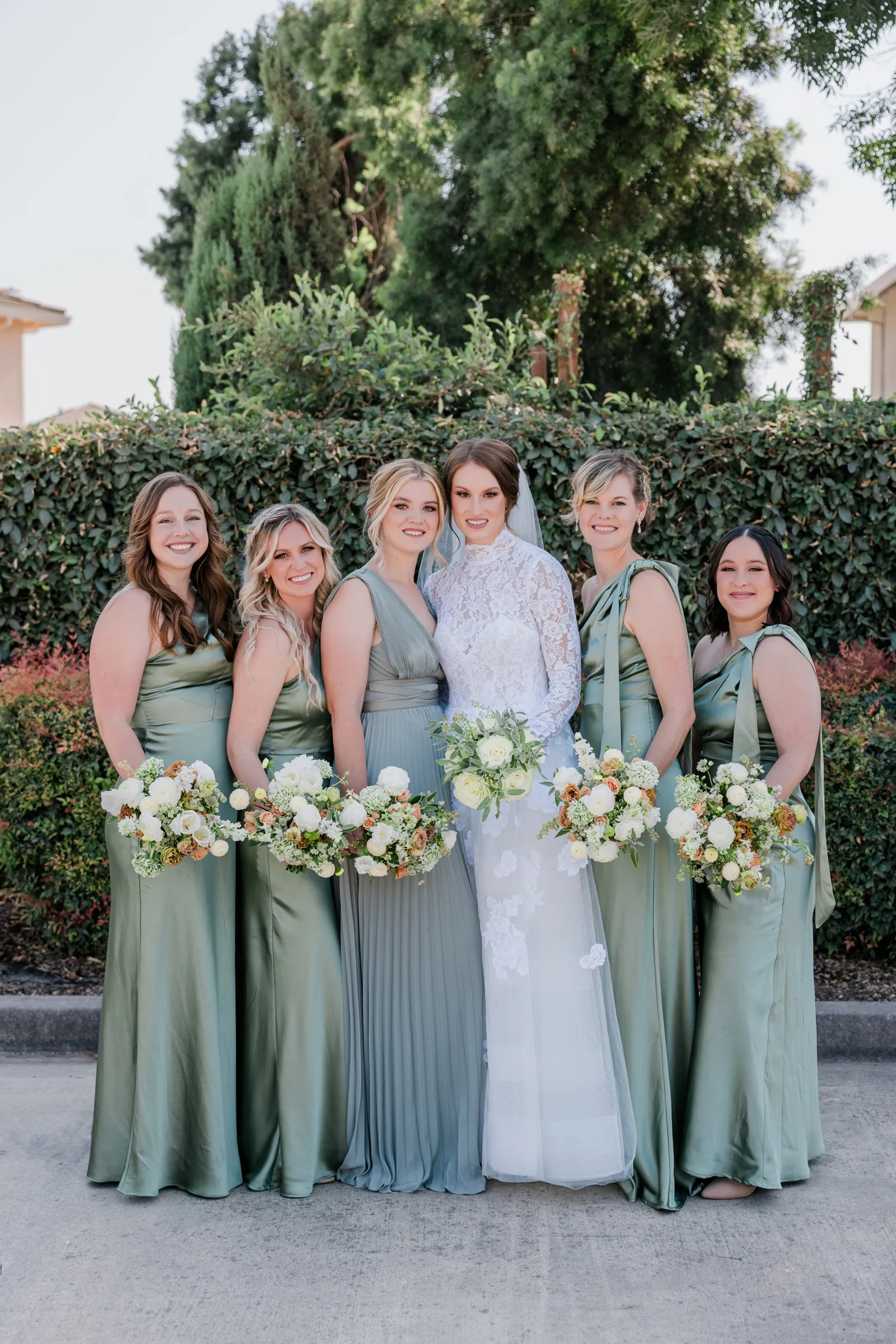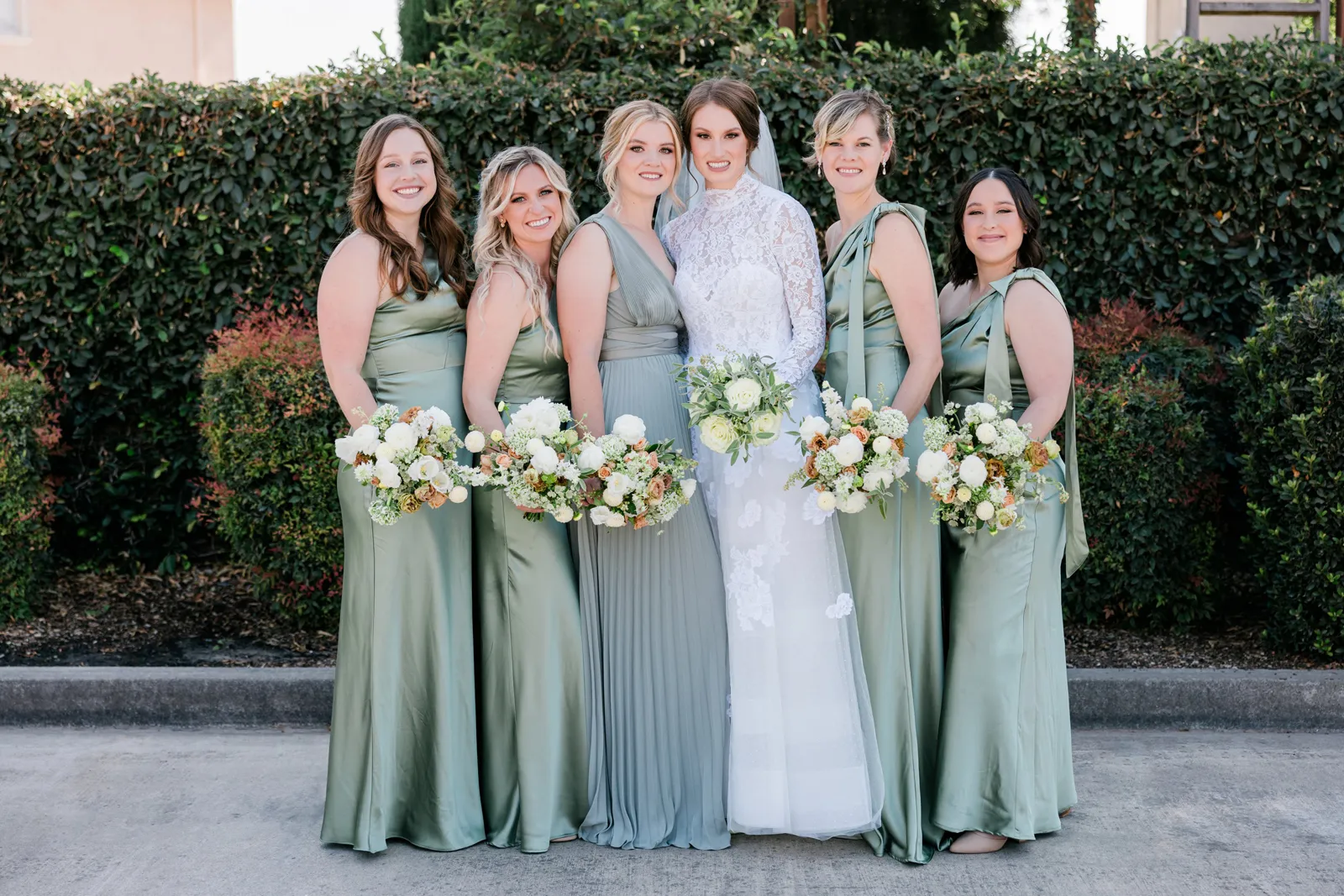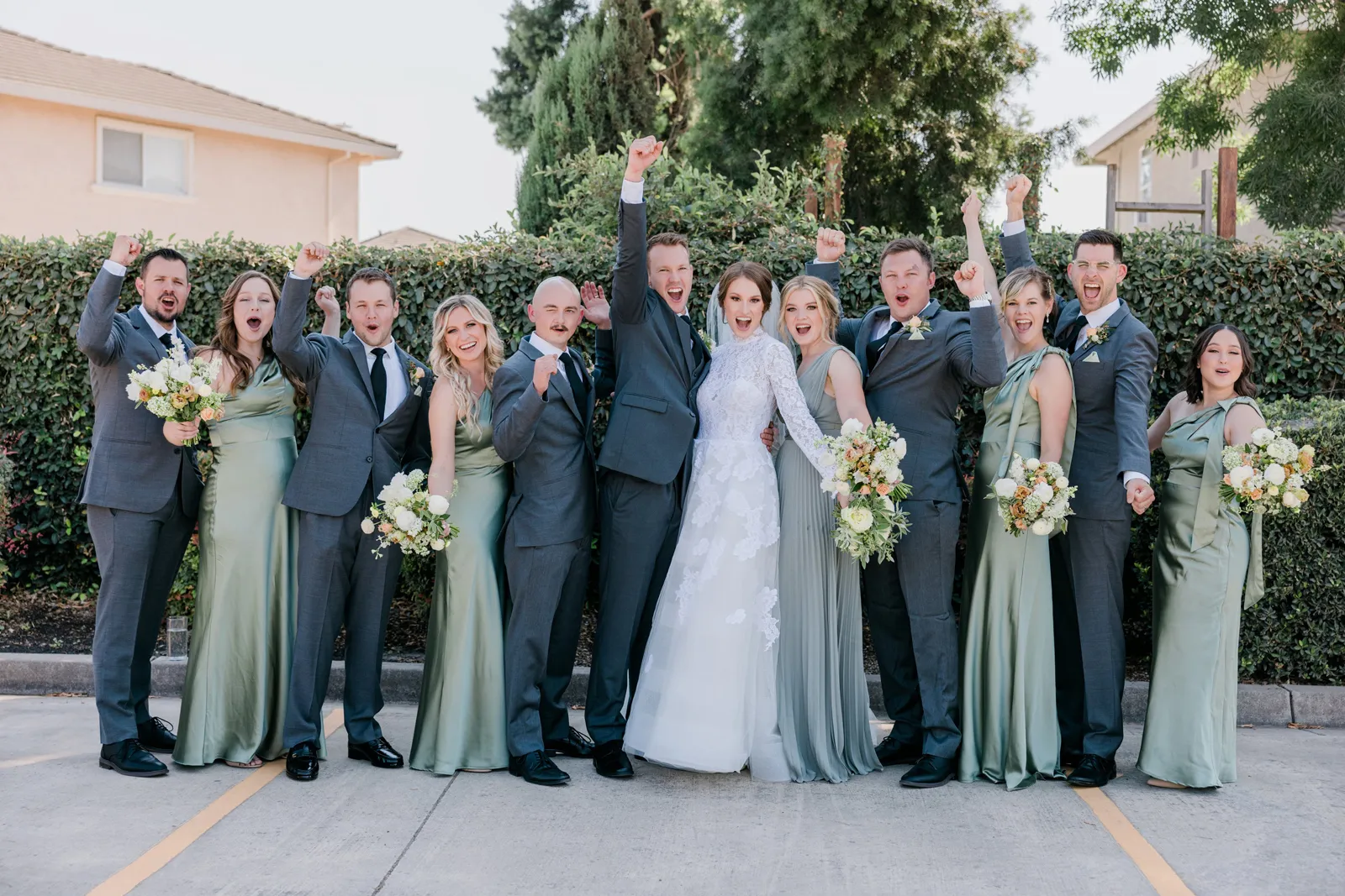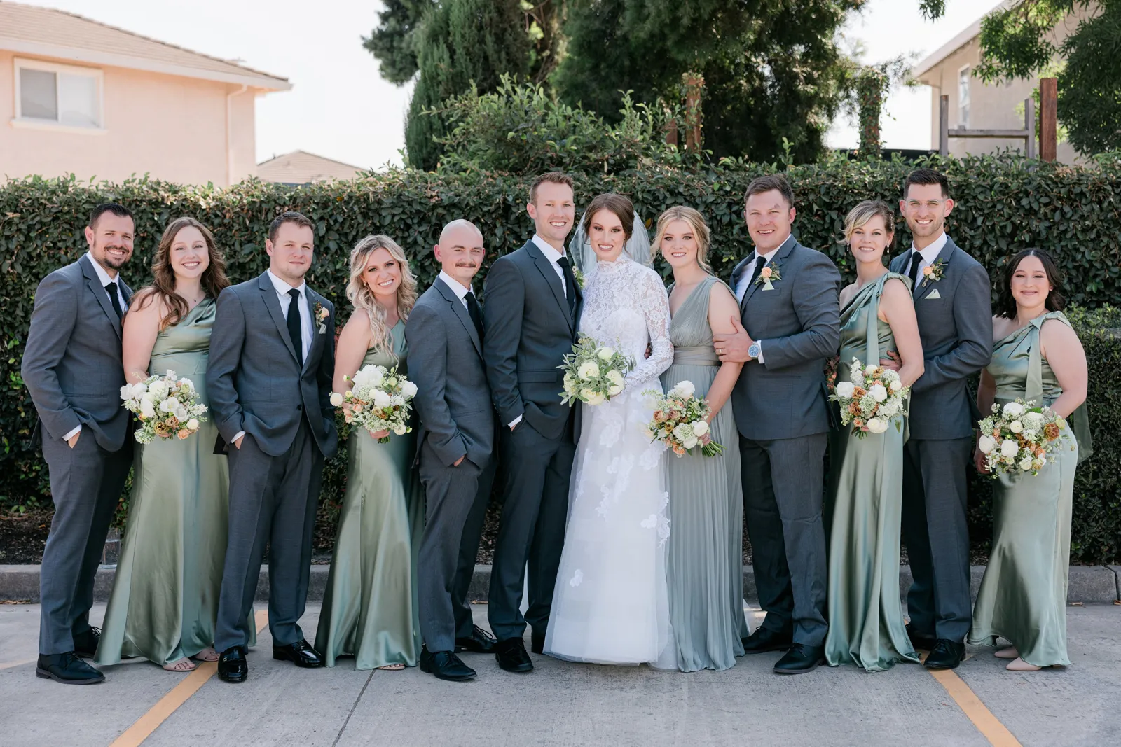 We knew that we wanted a traditional church ceremony, and we knew ahead of time that we wanted to use Garuda Blue for our live band. Also, I had a specific wedding dress style in mind (lace sleeves and a turtleneck), which is why I knew I found “the one” when I tried on my wedding gown at Miosa’s. I also wanted to incorporate green into the wedding as much as I could, (since that was the theme) and I loved how the bridesmaid dresses from Lulu’s turned out, as well as the green wedding shoes and the bridal bouquet which was created using green roses!