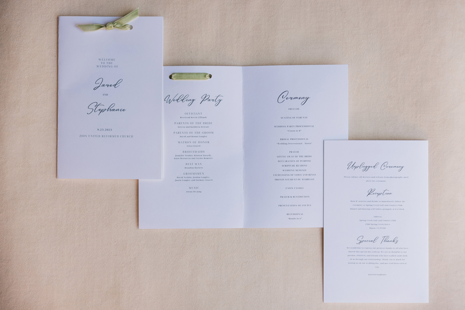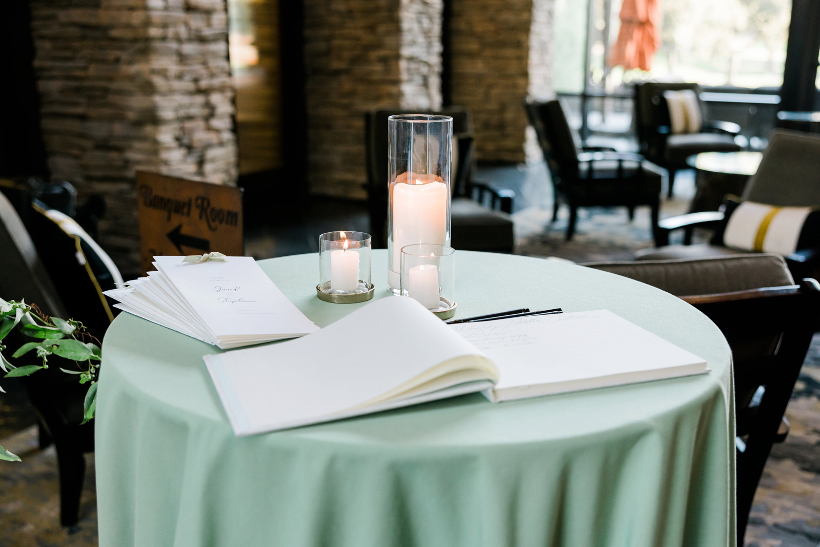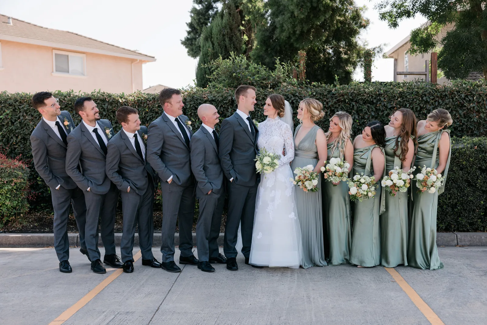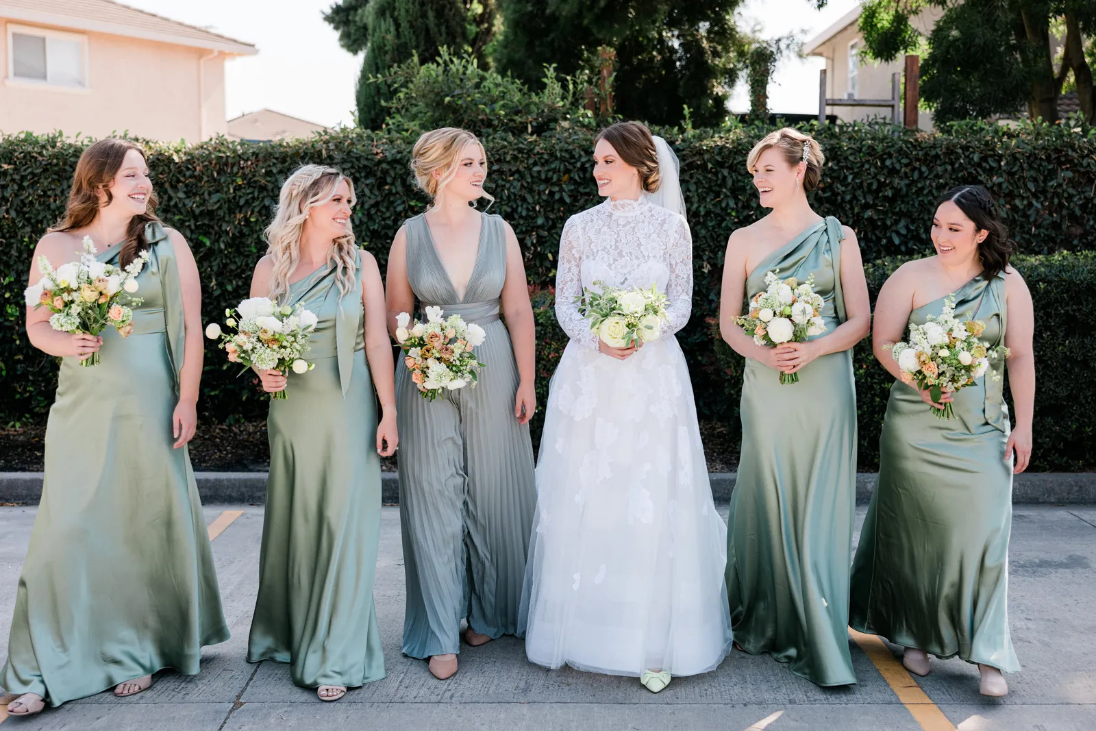 We knew that we wanted a traditional church ceremony, and we knew ahead of time that we wanted to use Garuda Blue for our live band. Also, I had a specific wedding dress style in mind (lace sleeves and a turtleneck), which is why I knew I found “the one” when I tried on my wedding gown at Miosa’s. I also wanted to incorporate green into the wedding as much as I could, (since that was the theme) and I loved how the bridesmaid dresses from Lulu’s turned out, as well as the green wedding shoes and the bridal bouquet which was created using green roses!