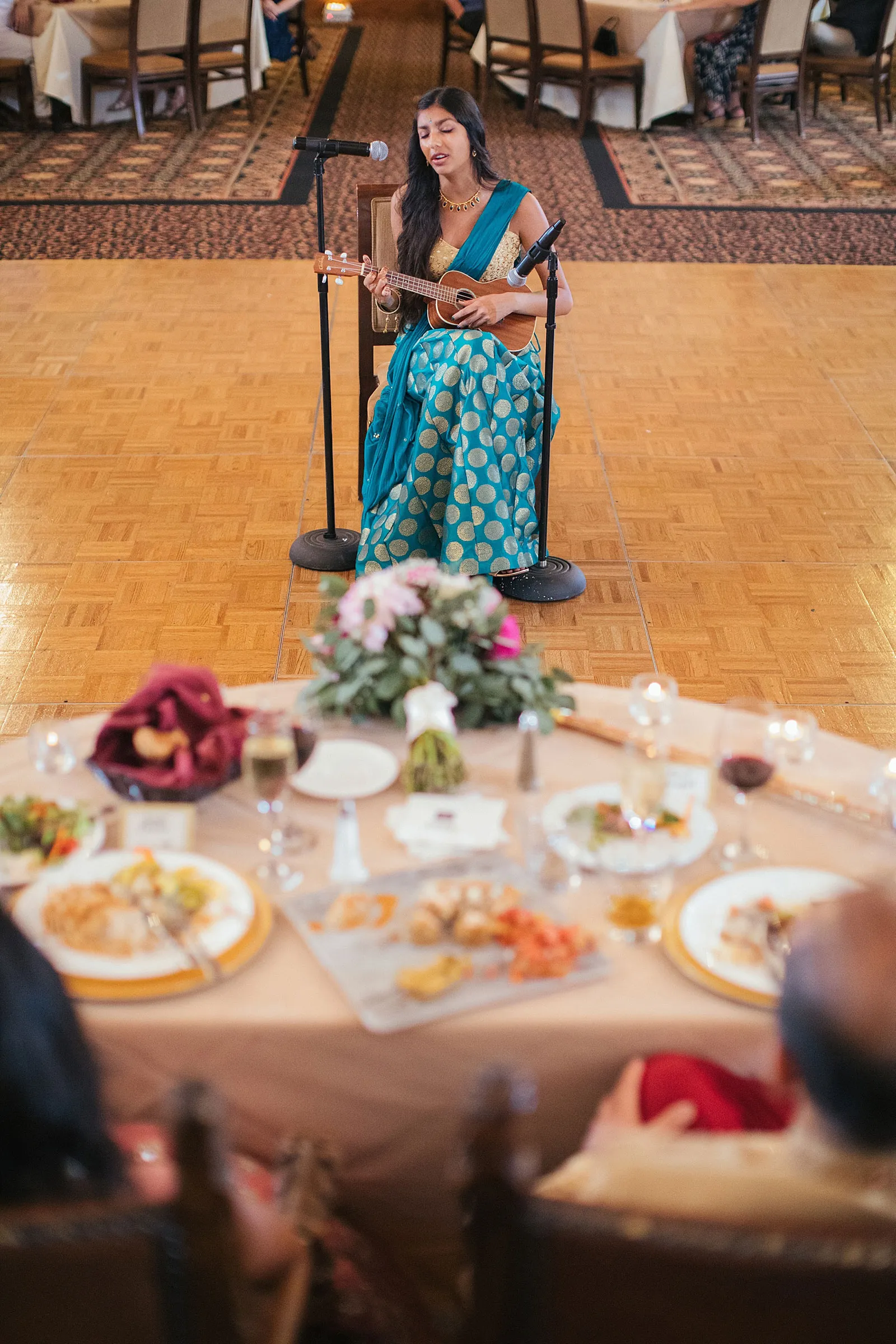 Navit enjoyed posing with his sword after the ceremony, which was really funny! His son, Mason, gave a funny toast referring to his appropriate duties as the best man. It was also fun to see everyone cheering as we entered the reception. Navit and I were confident that we could learn to dance and have a Bollywood first dance. We soon discovered that we were not the most coordinated couple out there! We managed to learn one or two moves, and even asked the DJ to cut our first dance short since it seemed like the song was going on forever! The Bollywood dance performance by my nieces, Saveena and Jayna, was amazing! The crowd loved the upbeat music and choreography! Saveena played her guitar and sang for us. Navit’s daughter, Sydney, also sang “Sunrise” by Norah Jones, which was very meaningful to us.