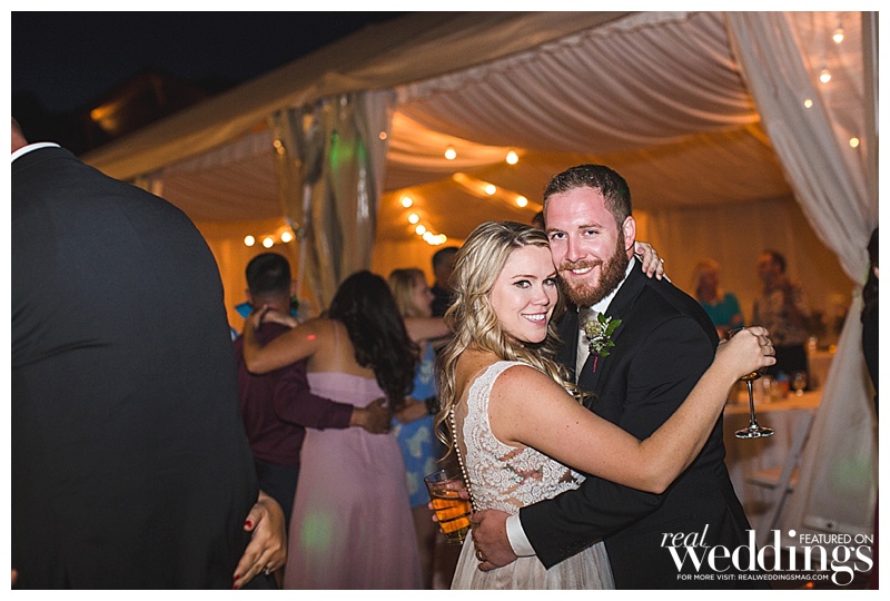 The wind had picked up that day, and much to Tara’s surprise, her veil was blown off and tossed down the mountain as she walked down the aisle. “When most brides would freak out, at that moment, it made me feel at ease,” she says. Tara explains that having something go wrong gave her the opportunity to laugh about it and realize that no matter what happened, their wedding would be a wonderful day.