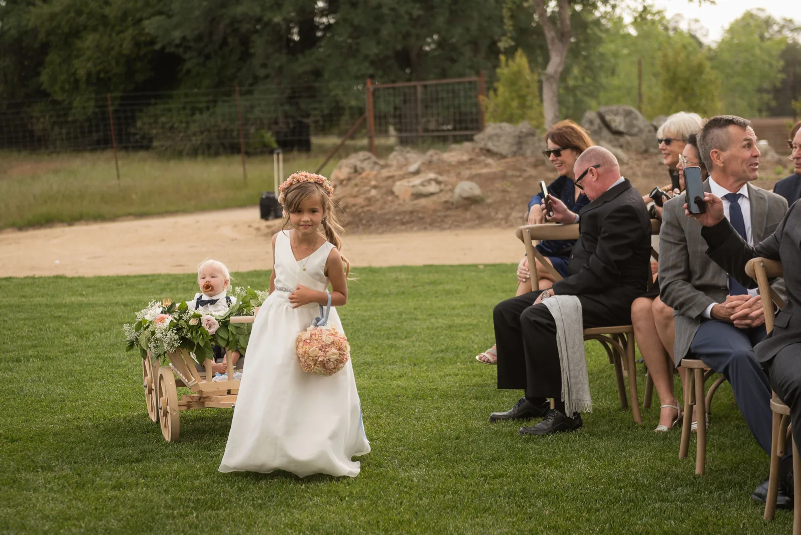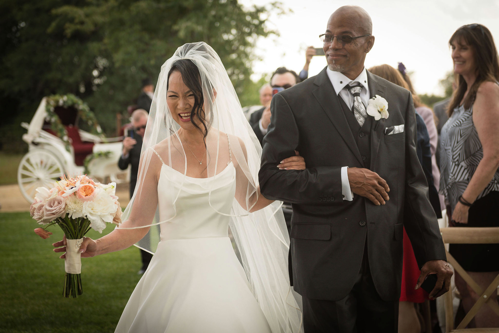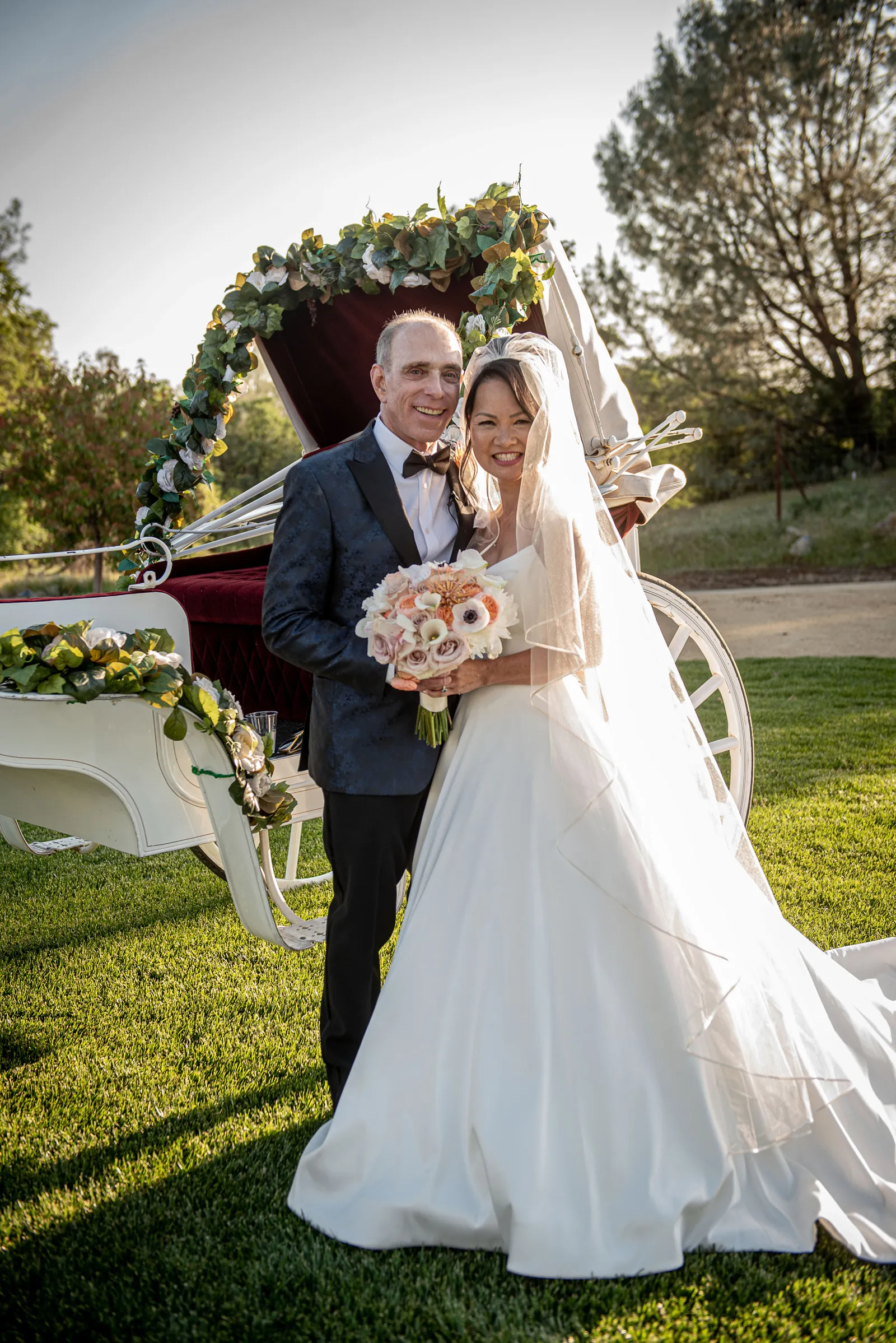 A few unique moments truly stood out. Iris, the flower girl, is my granddaughter. She walked up the aisle pulling her infant brother, Bodie, the ring bearer, in a cute, beautifully decorated wooden wagon. Just as the ceremony was ending, a magisterial bald eagle flew over the lake in the immediate background, not 50 feet away! We felt God’s presence blessing our marriage. Lastly, as I appeared in my horse-drawn carriage, Thomas’s niece, six-year-old Audrey, excitedly exclaimed to her mom, “Mom! Look! Look! A real princess!” It was charming.