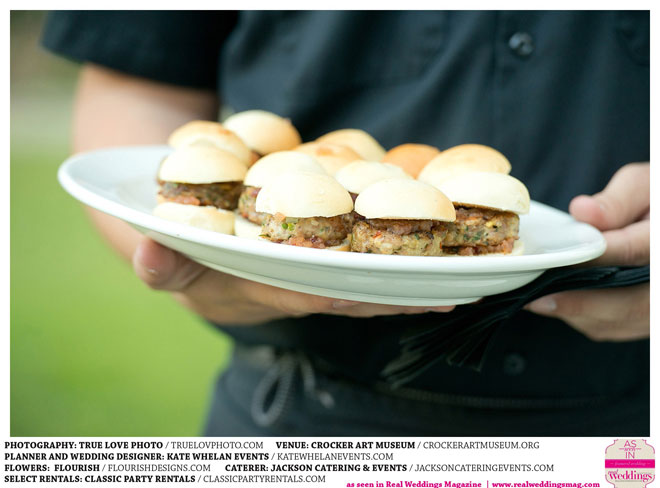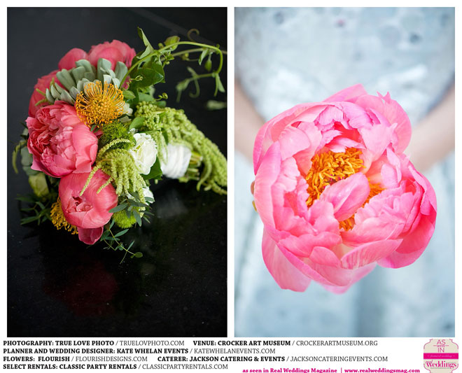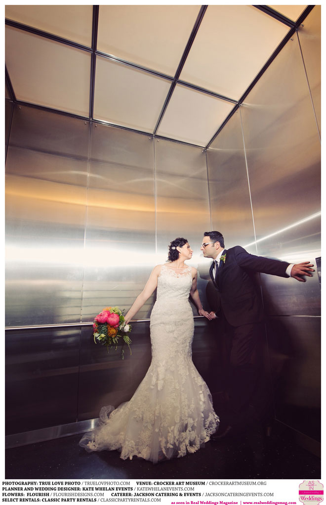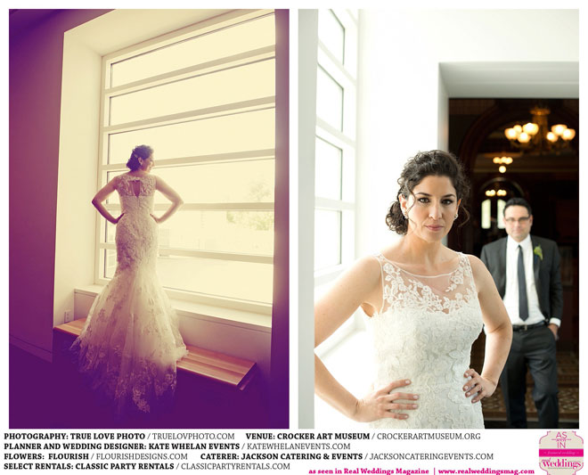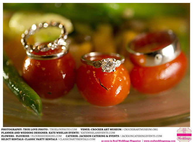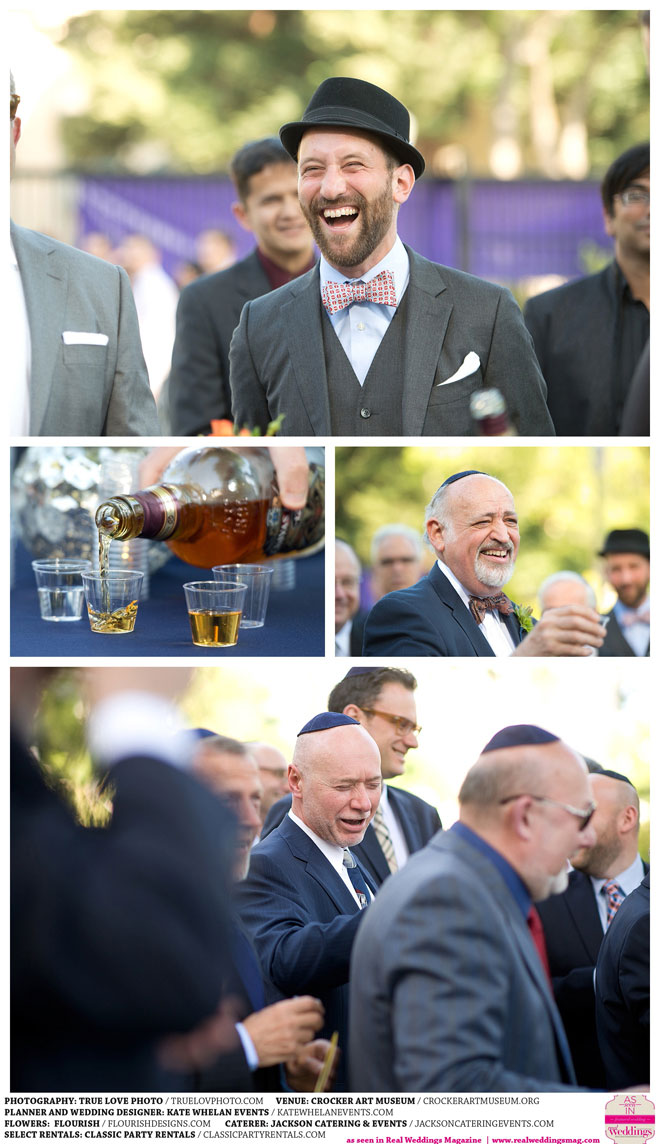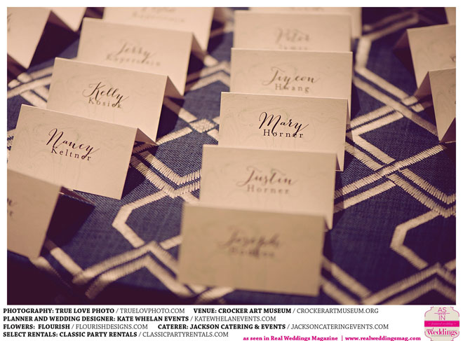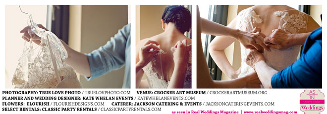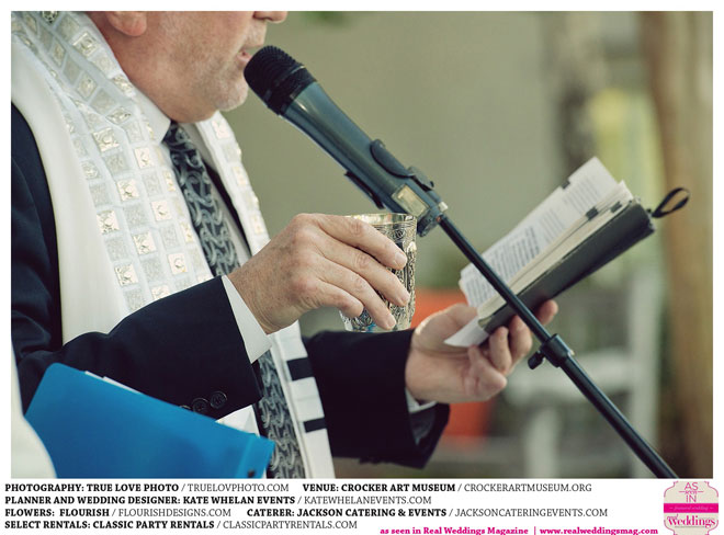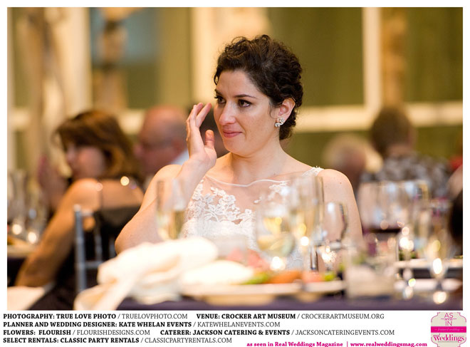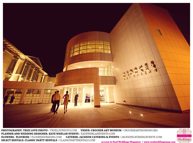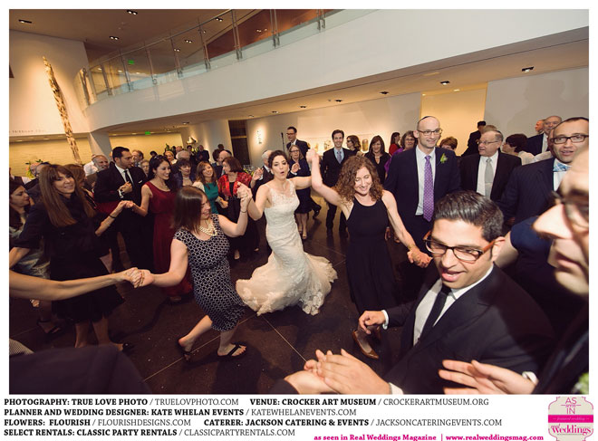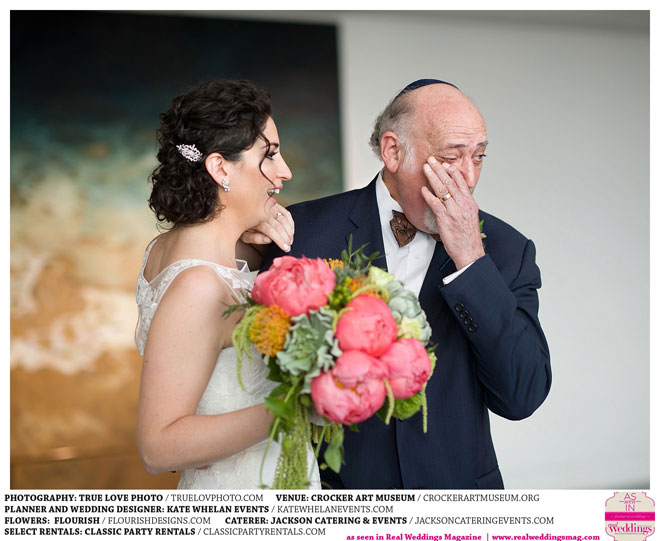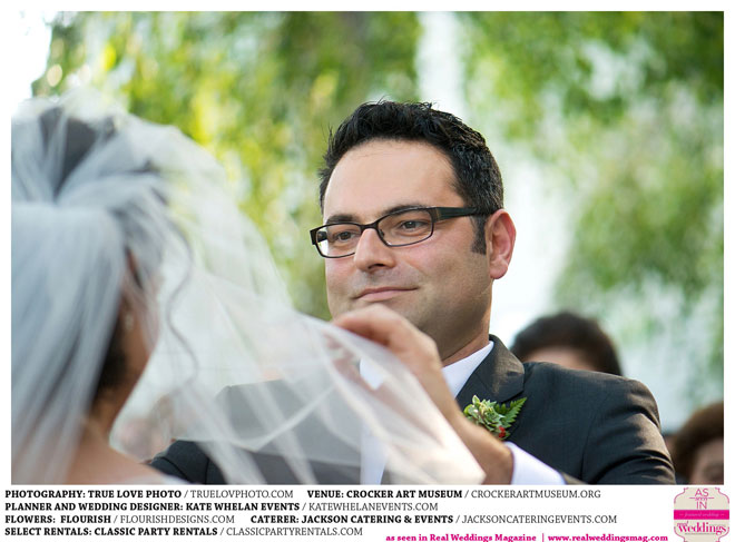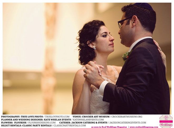 The couple—who met online and had dated for more than three years before getting engaged—married at the Crocker Art Museum. “It is beautiful and elegant and as a Sacramento native, I appreciated its significance as a local landmark,” says Tova. “It’s really a special place. In addition, we liked that we could have an outdoor ceremony followed by a reception indoors.”