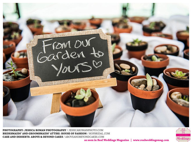 The couple gave guests homegrown succulents from their garden, which Todd said the guests really liked. “We used chalkboard paint on the pots so that people could write their names on them,” says Tracy, remembering, “the next morning when we were cleaning up, I found a bunch of messages from our guests to us written on the chalkboards. It was pretty cool.”