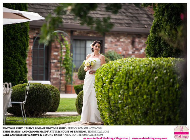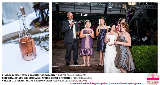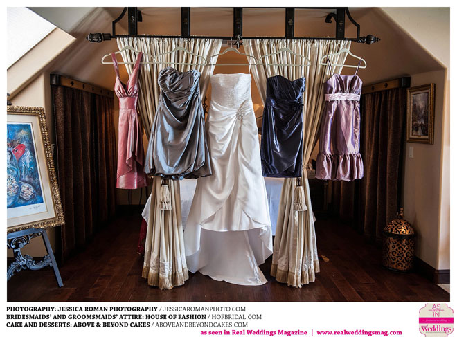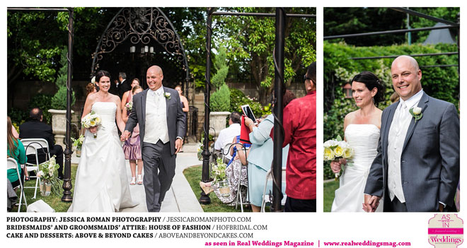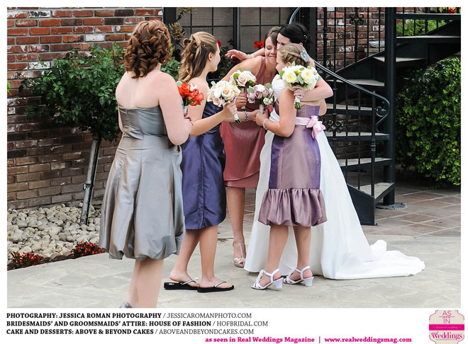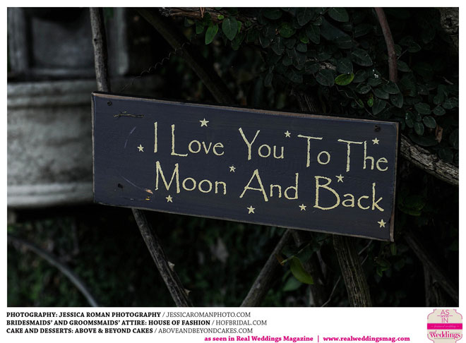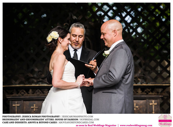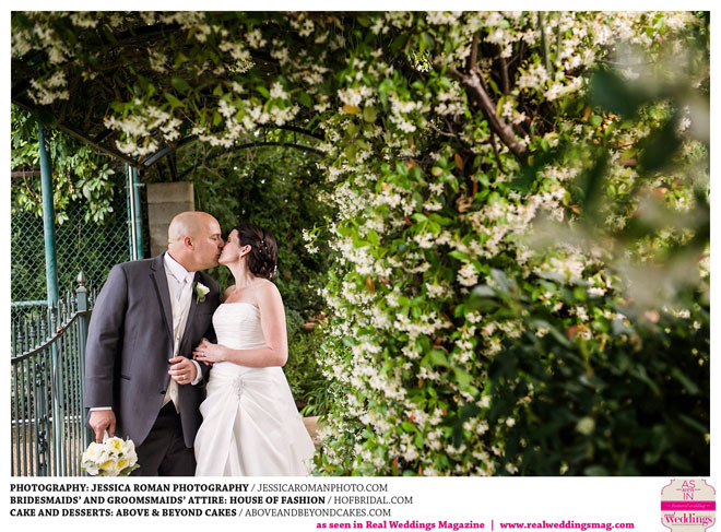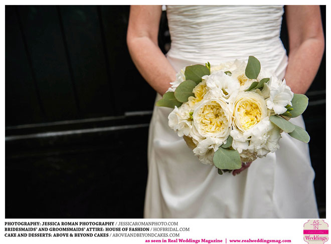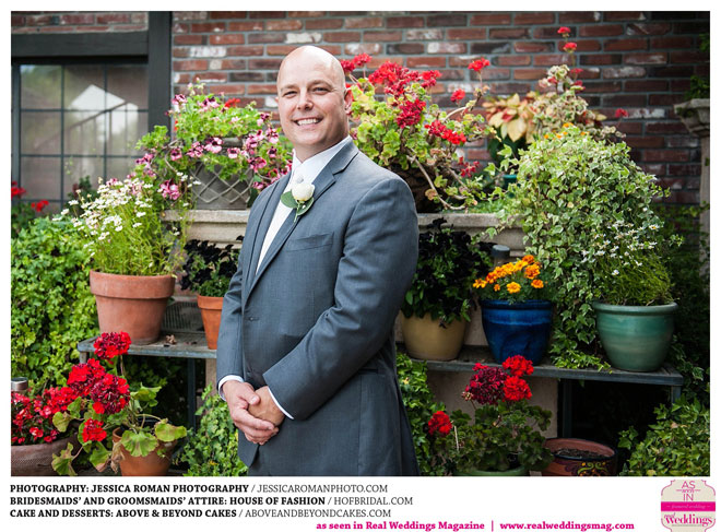 “The dress I wore to the wedding was actually the second dress I purchased,” says Tracy, who, five months before the wedding, found out that she was pregnant. She had to replace her form-fitting gown with a new one. “I had a corset panel sewn into the back of the gown to give me some room to grow after the final fitting,” she says, explaining that she was a little stressed about fitting into the gown on the wedding day.