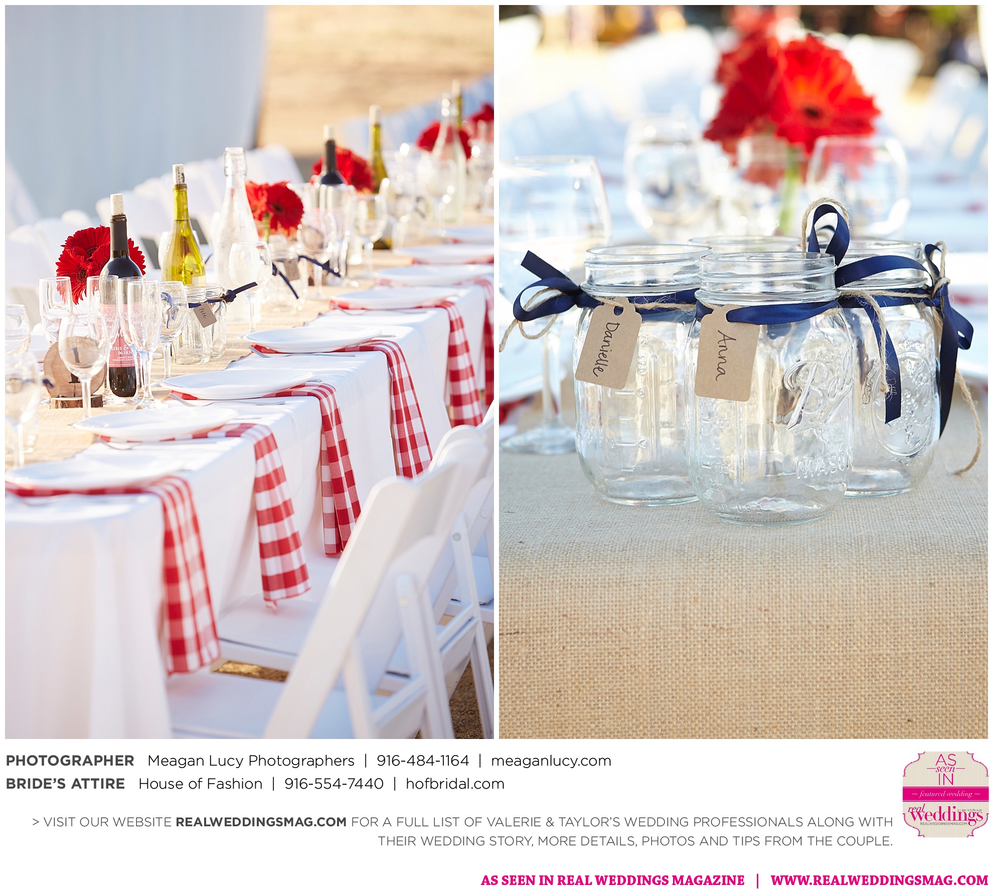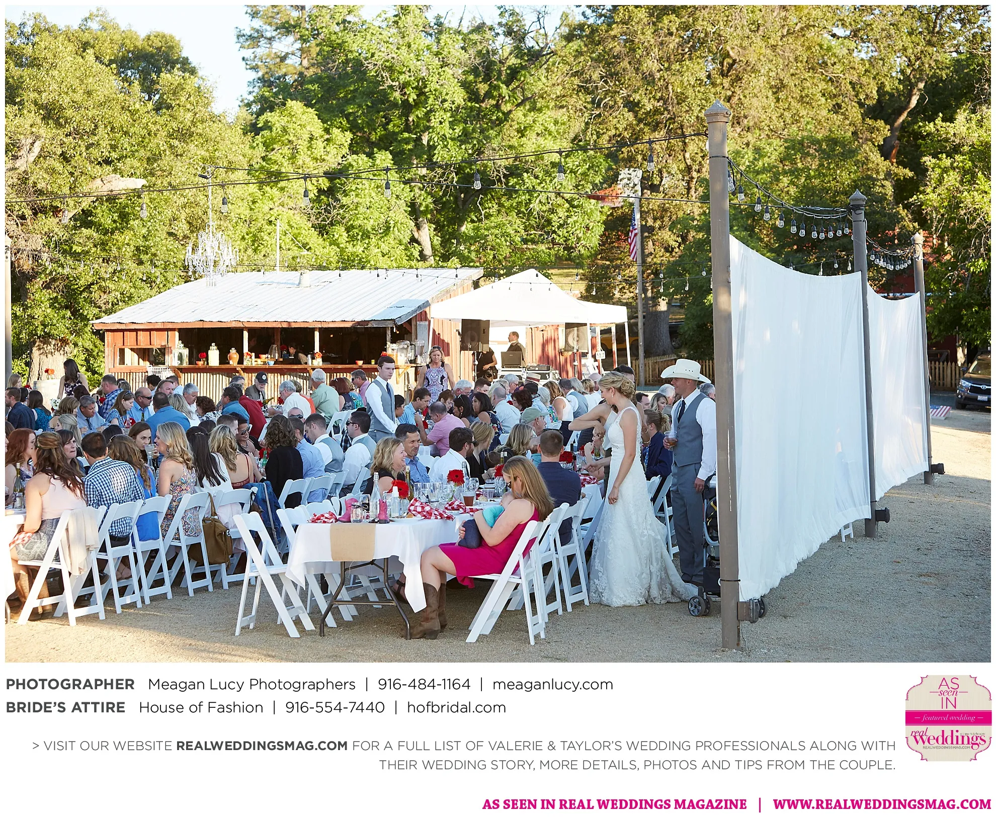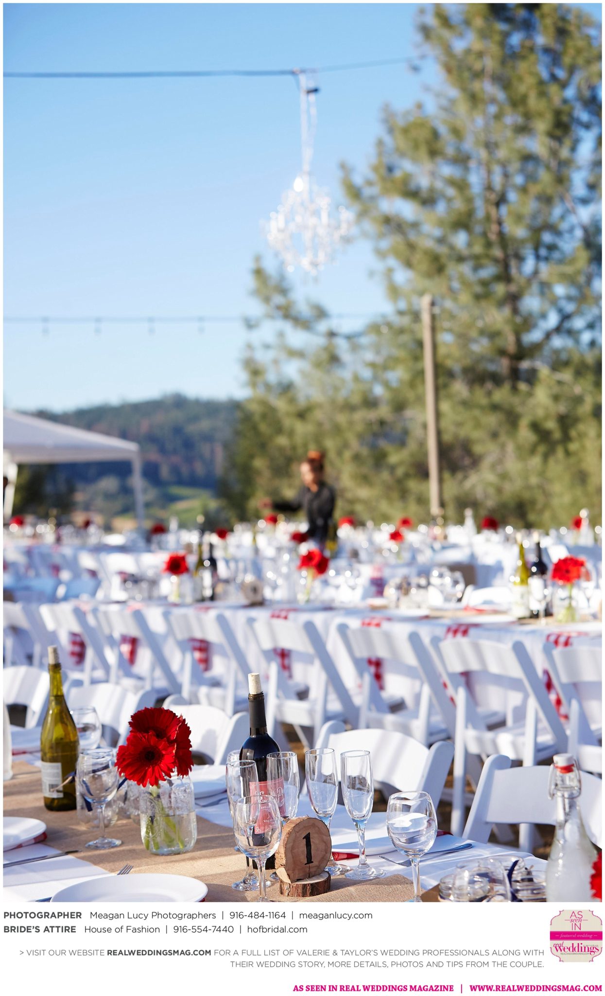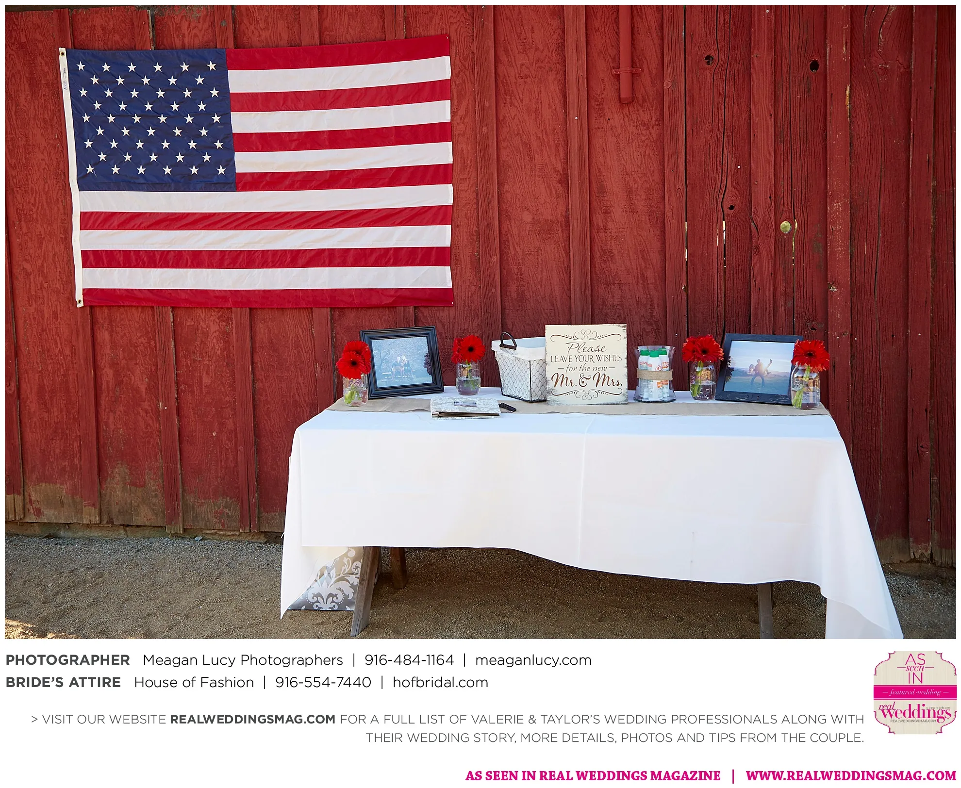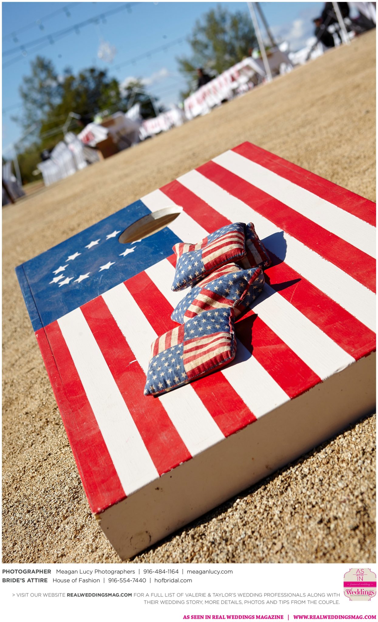 For their American country-themed wedding, they chose red, white and blue as their colors. Completing the country look, the groom wore cowboy boots to the ceremony and his white cowboy hat for the reception.