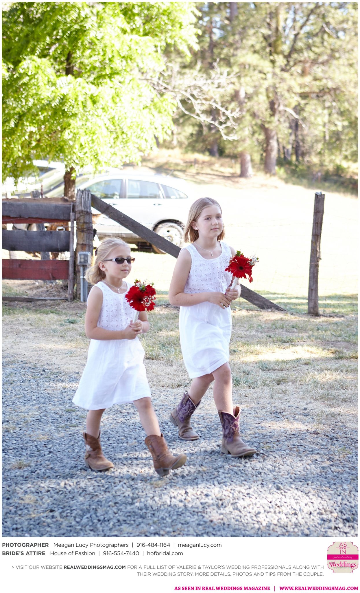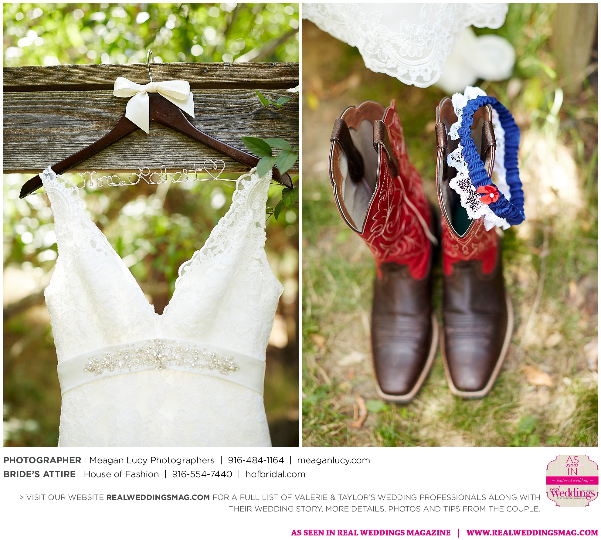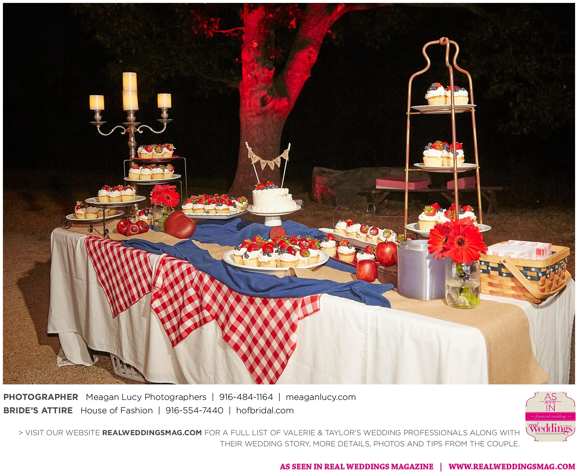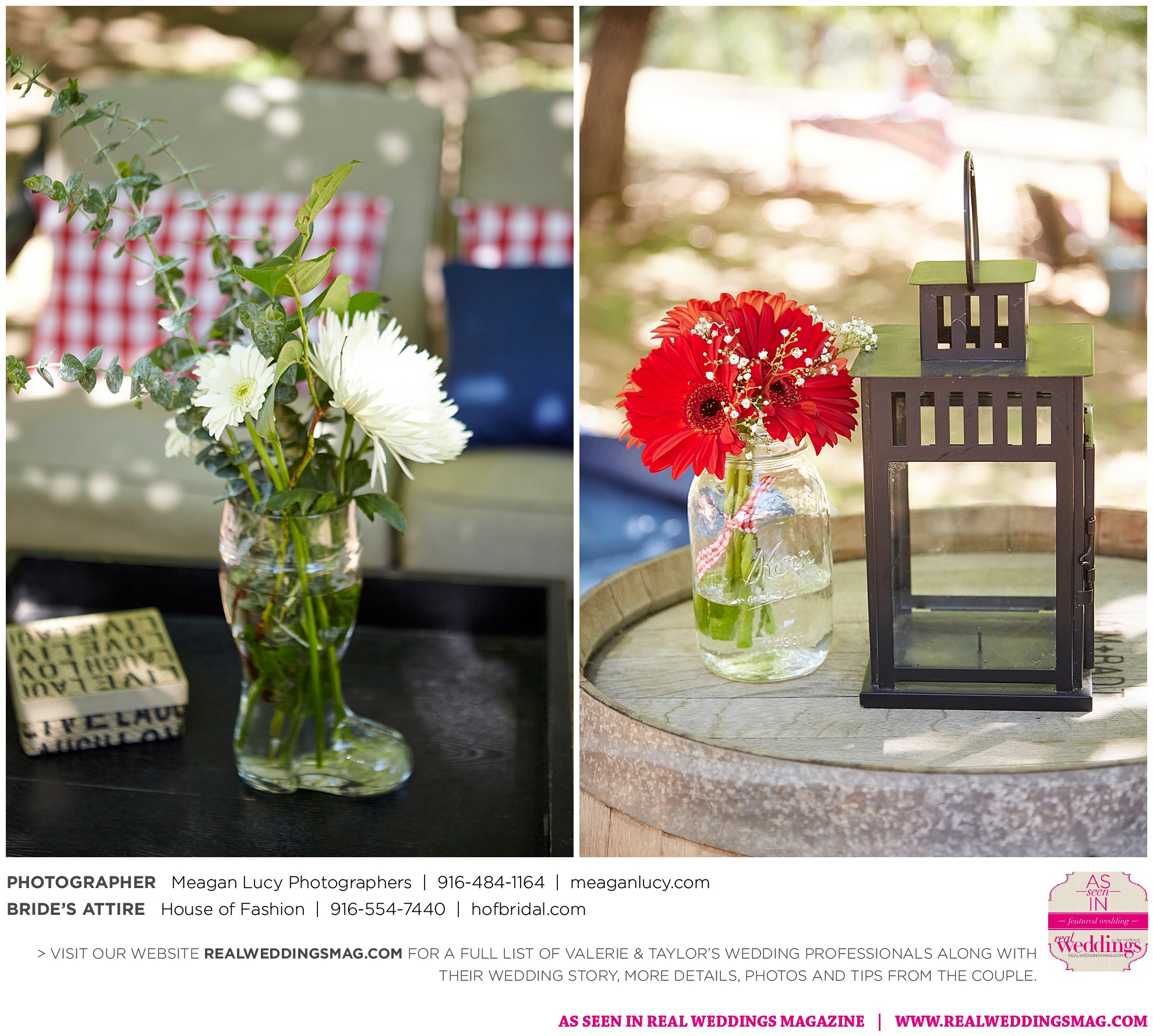 For their American country-themed wedding, they chose red, white and blue as their colors. Completing the country look, the groom wore cowboy boots to the ceremony and his white cowboy hat for the reception.