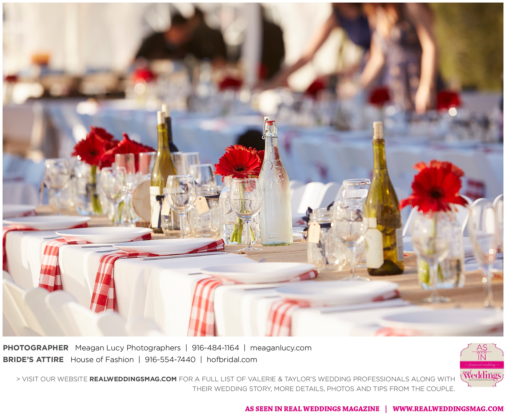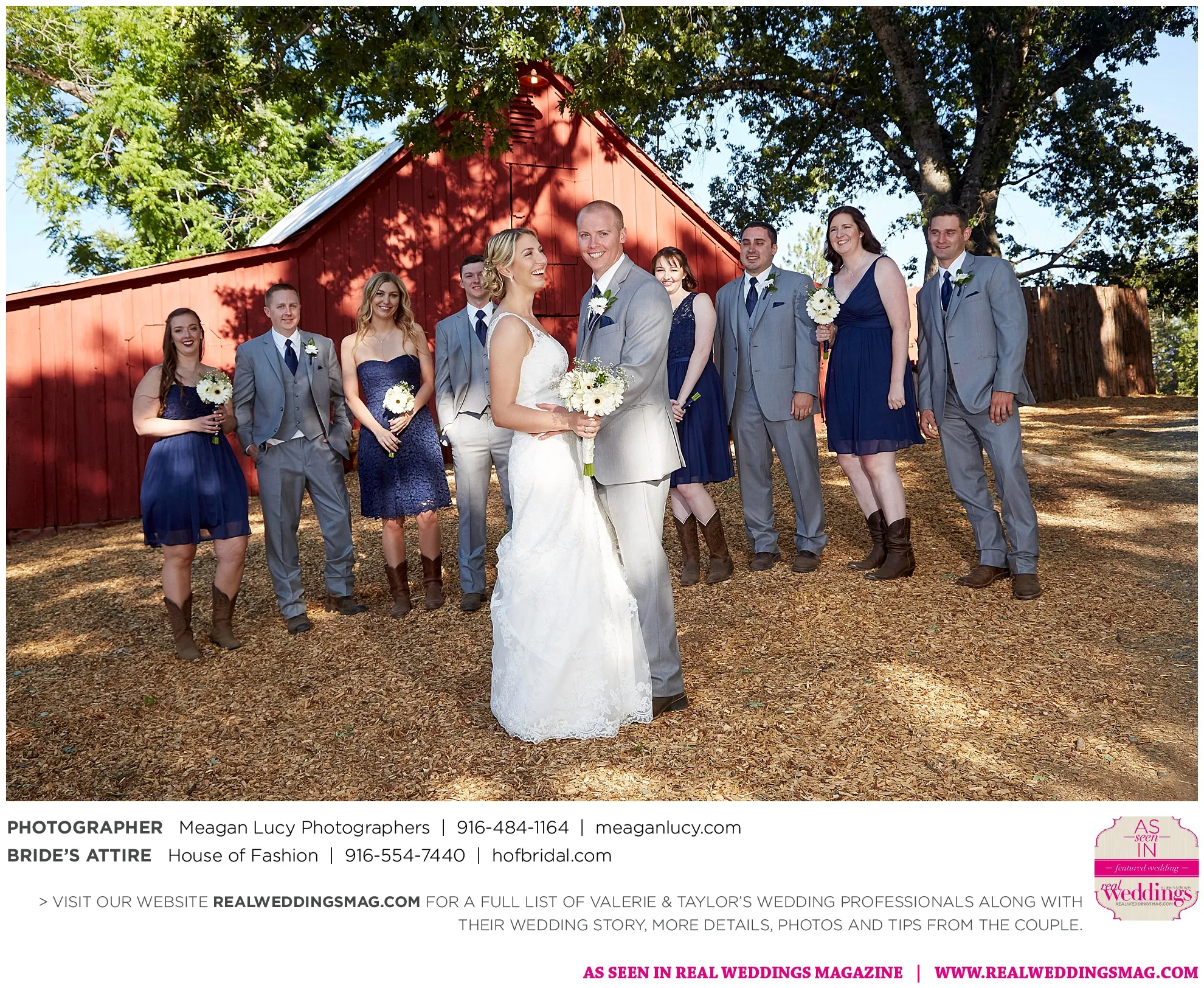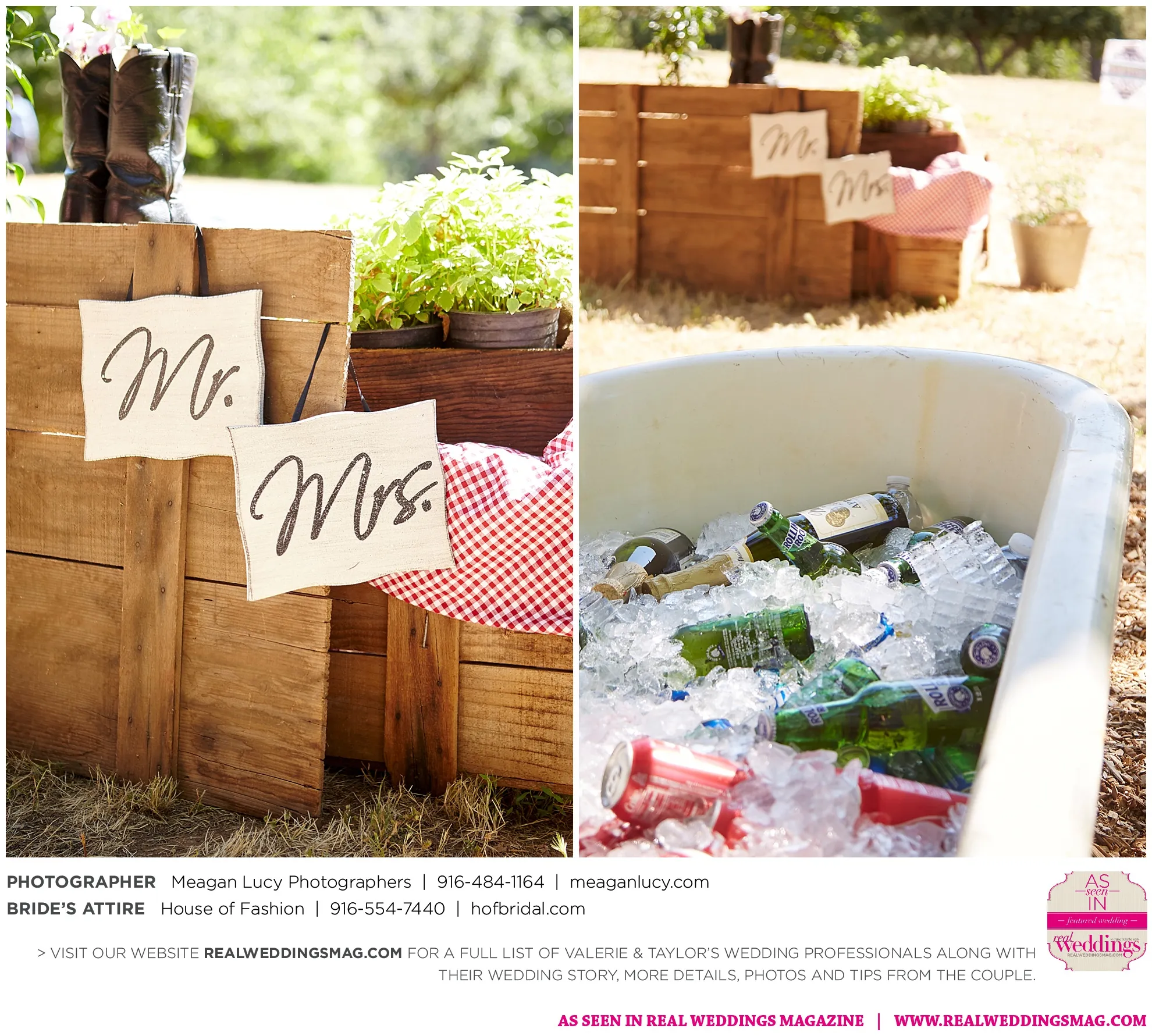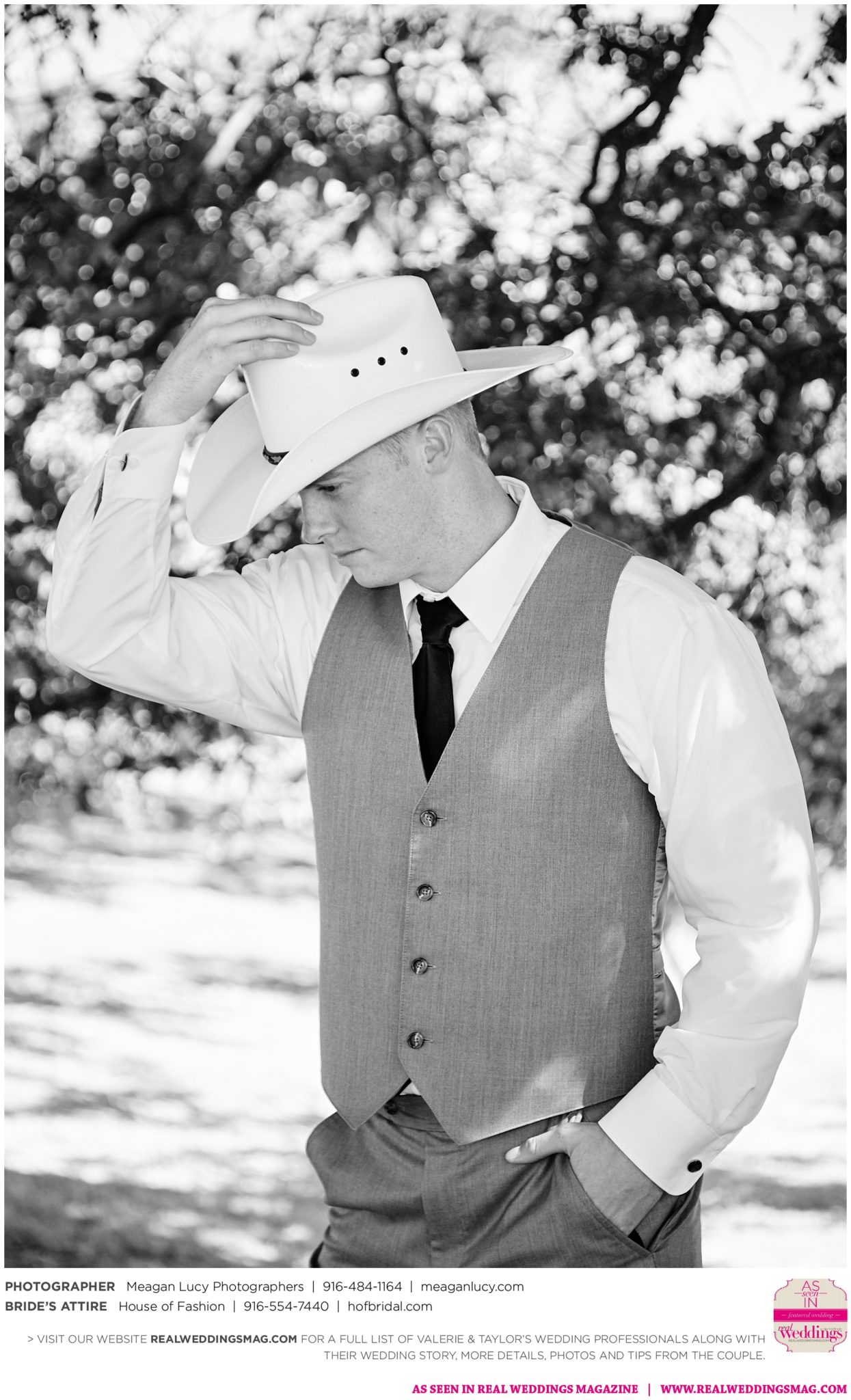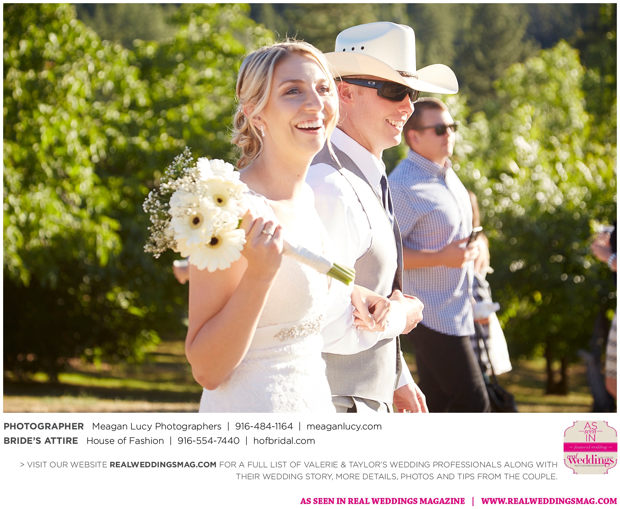 For their American country-themed wedding, they chose red, white and blue as their colors. Completing the country look, the groom wore cowboy boots to the ceremony and his white cowboy hat for the reception.