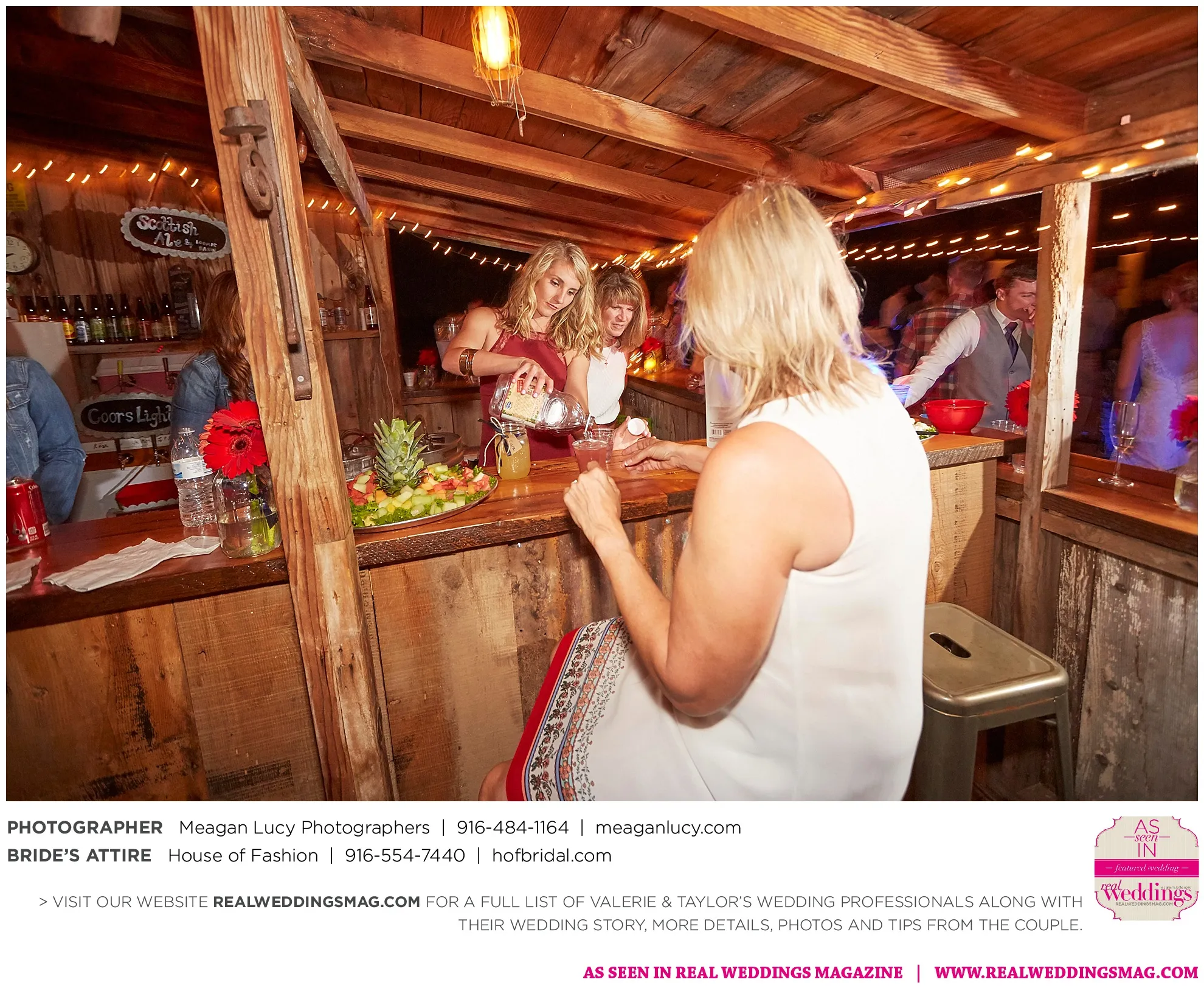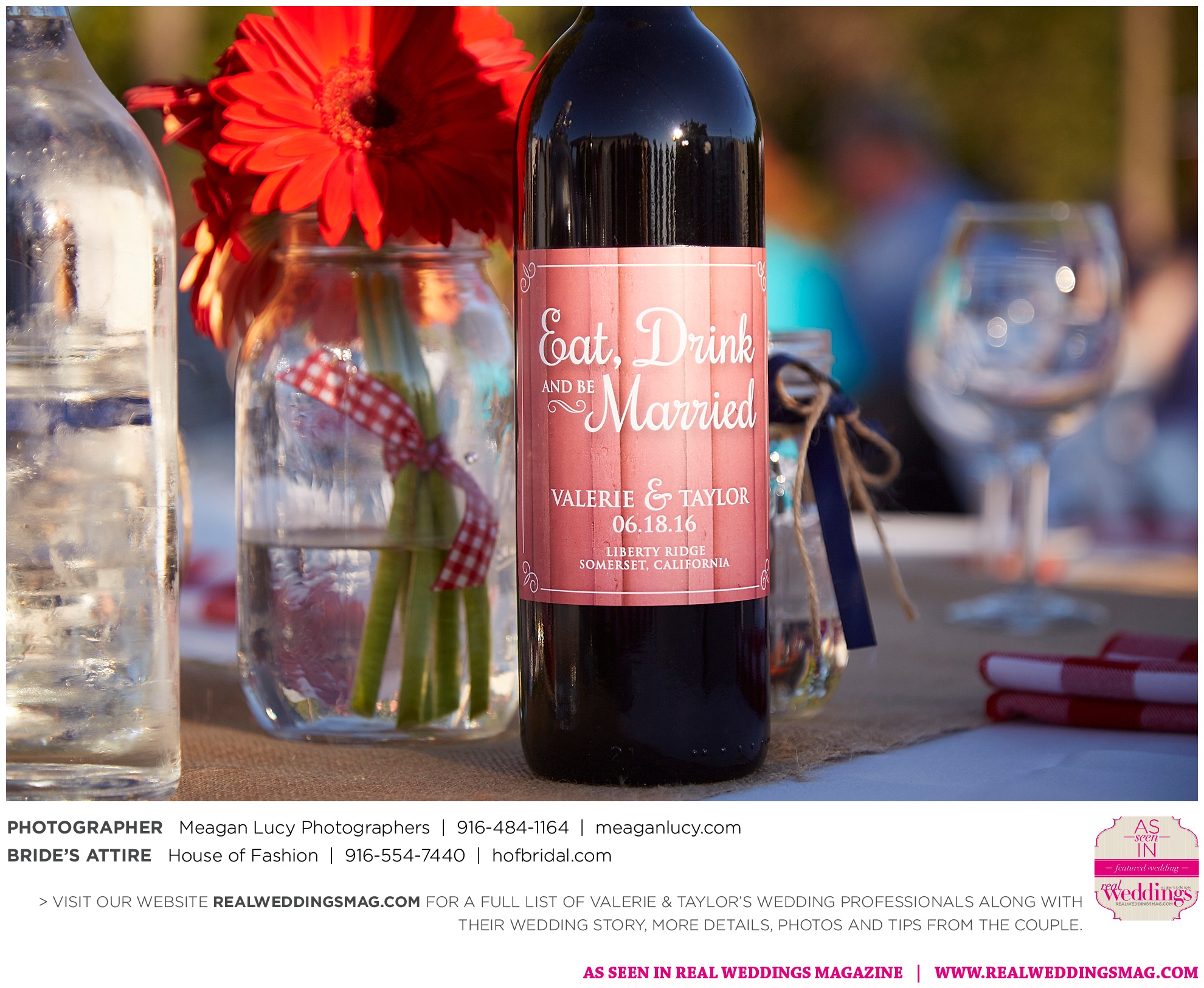 The couple loved their wedding’s personal touches, including the personal wine labels made by their friends; homemade beer courtesy of their friends; and the bar area built by Taylor’s grandfather. They also liked displaying photographs of their parents’ and grandparents’ wedding days; and the chandelier in the middle of the reception.