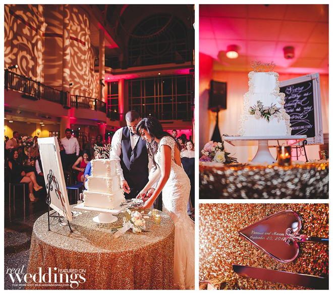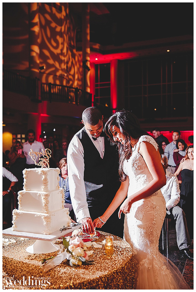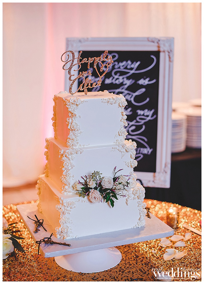 We had a 3-tier, square, Champagne cake with strawberry mousse filling and white buttercream frosting. The edges of the cake had a white floral design that was brushed with gold, and the florist placed fresh flowers in the middle tier.