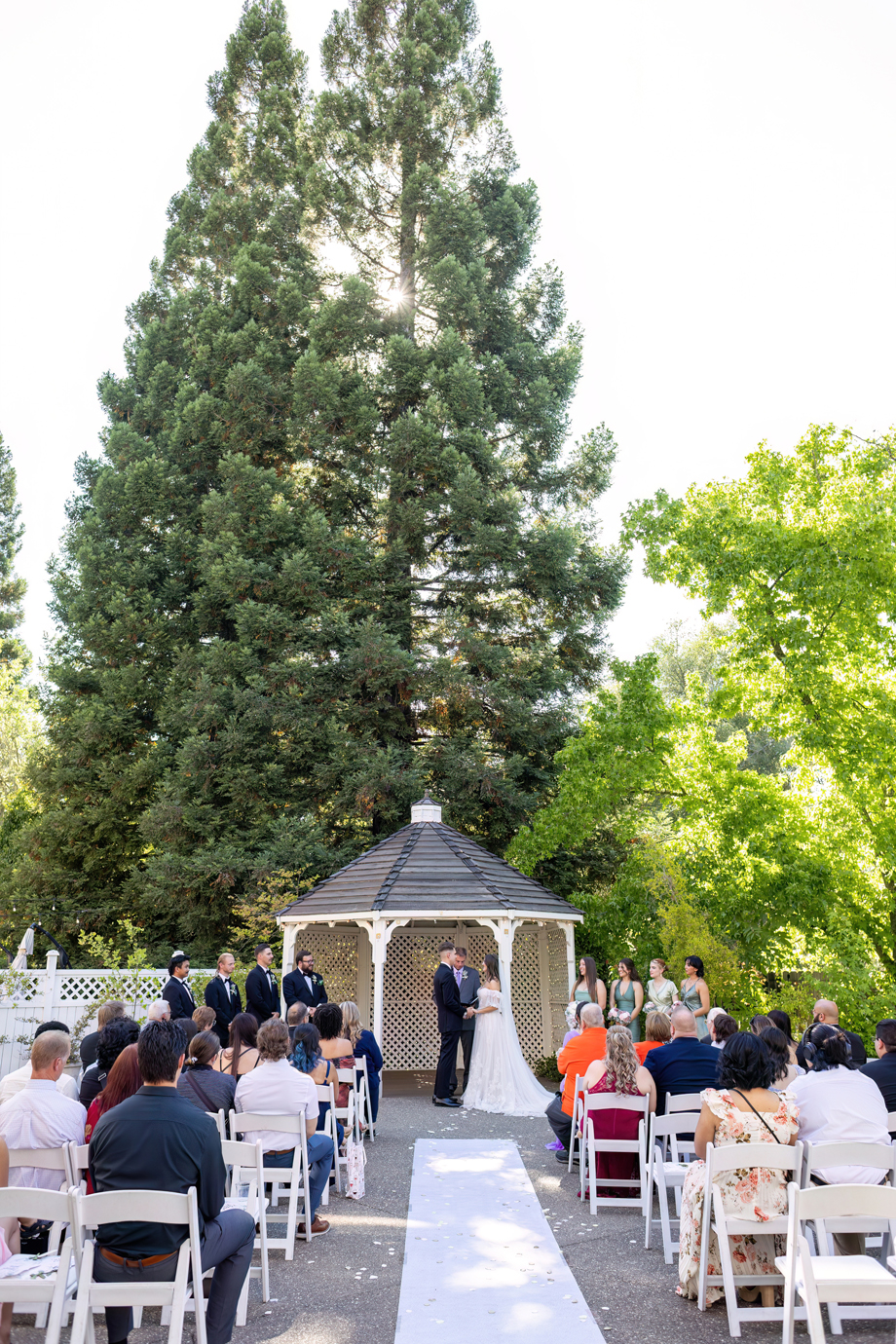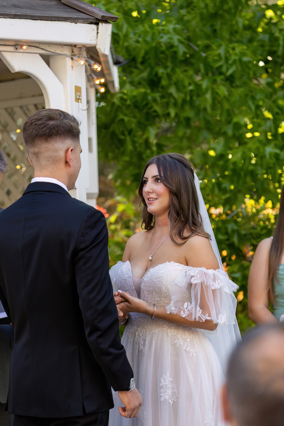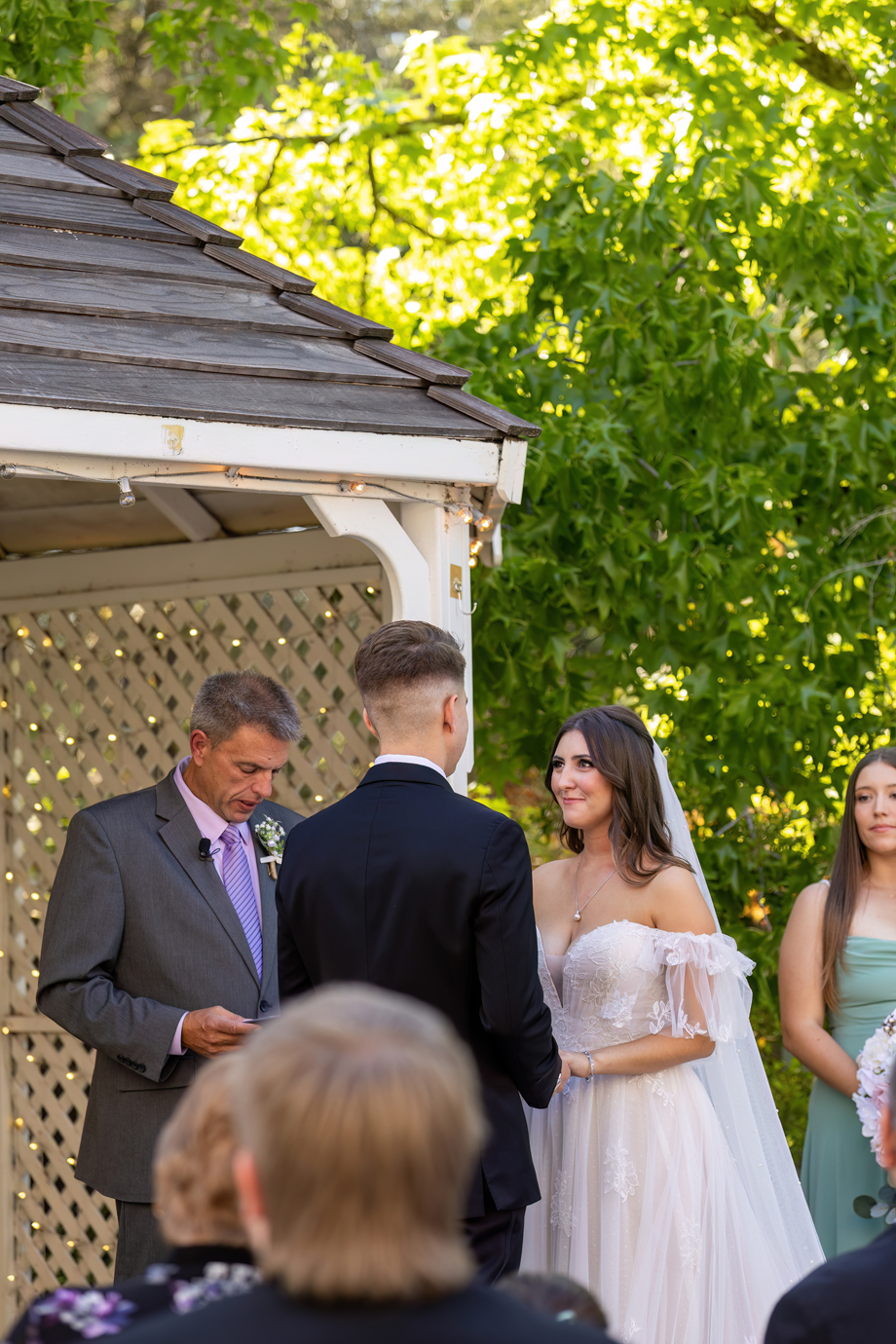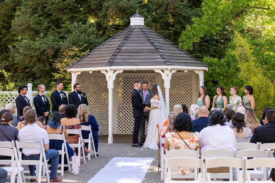 My dad (Russ Stringfellow) was our officiant. Having someone so close to both of us made the moment so special. The ceremony was outside underneath the gazebo with the lights in the back, and the gorgeous greenery that Lake Natoma Inn has to offer.