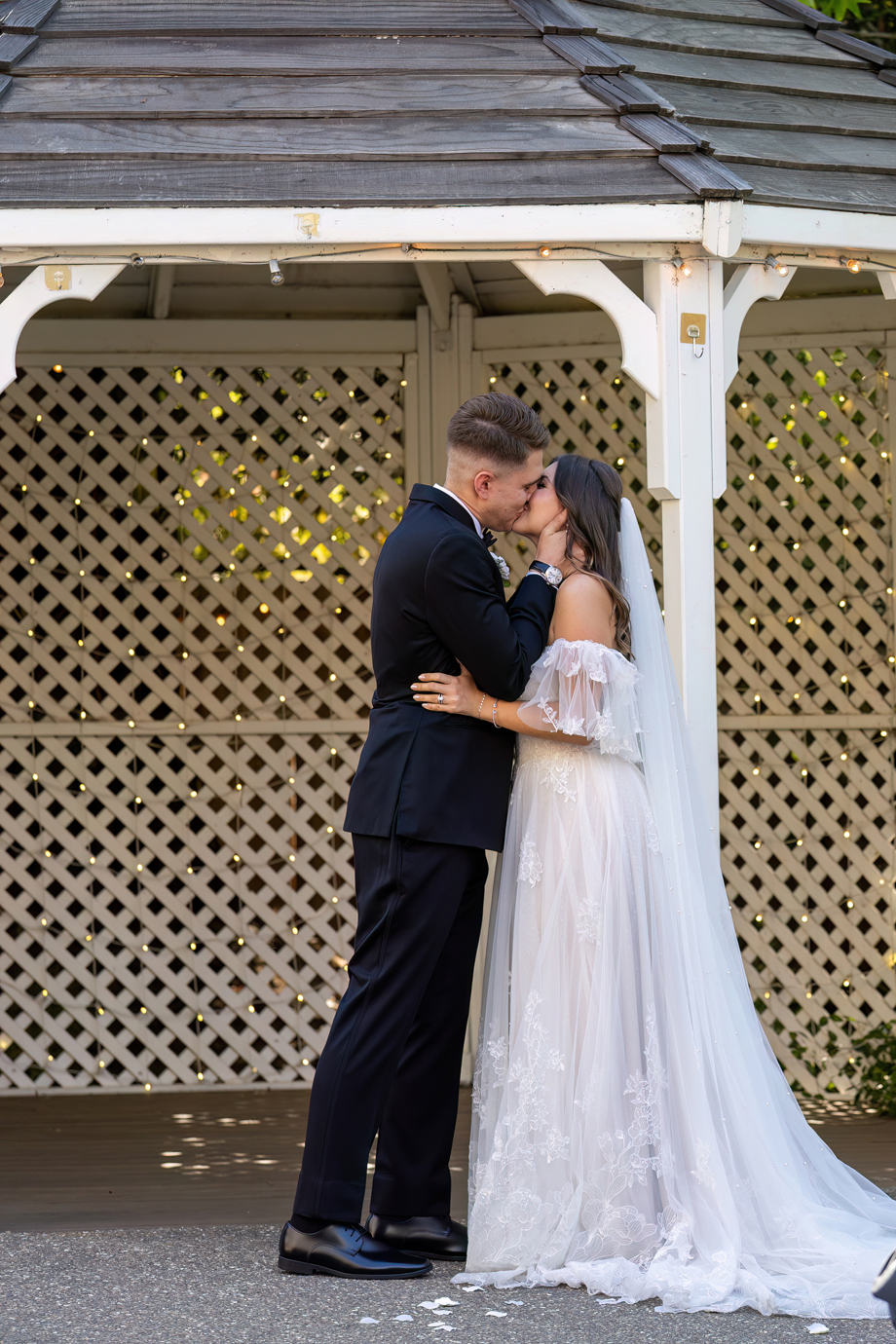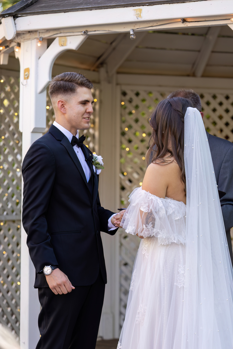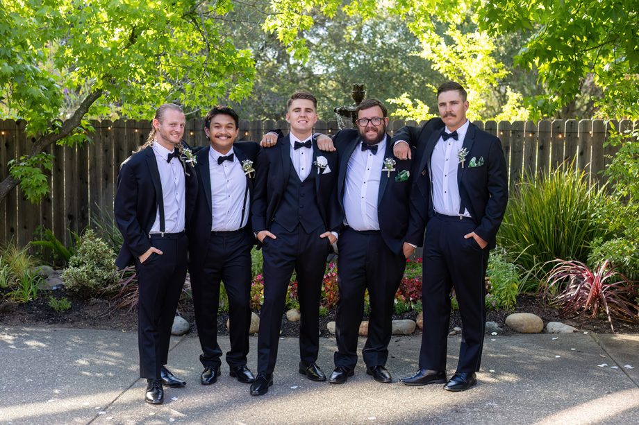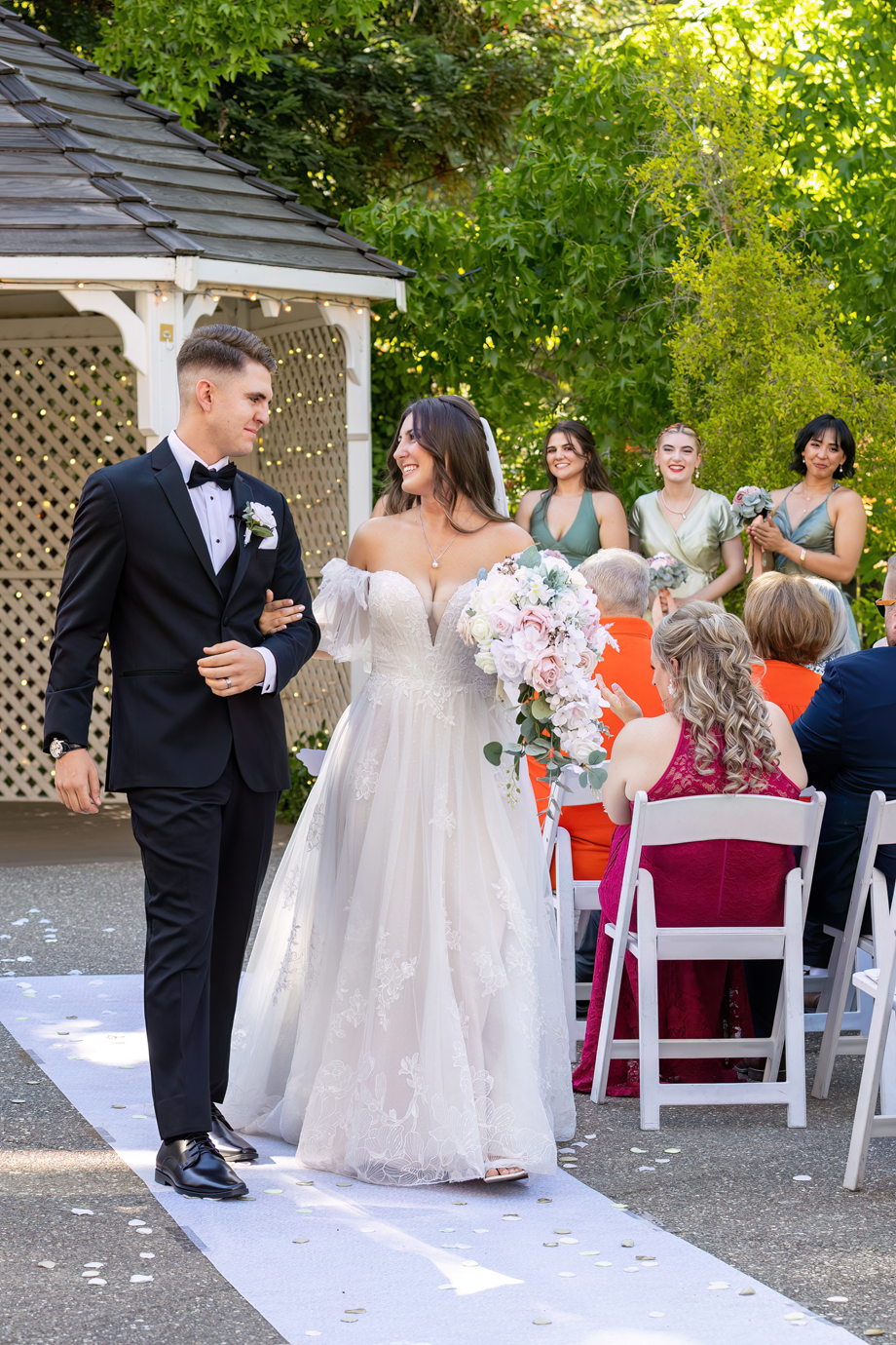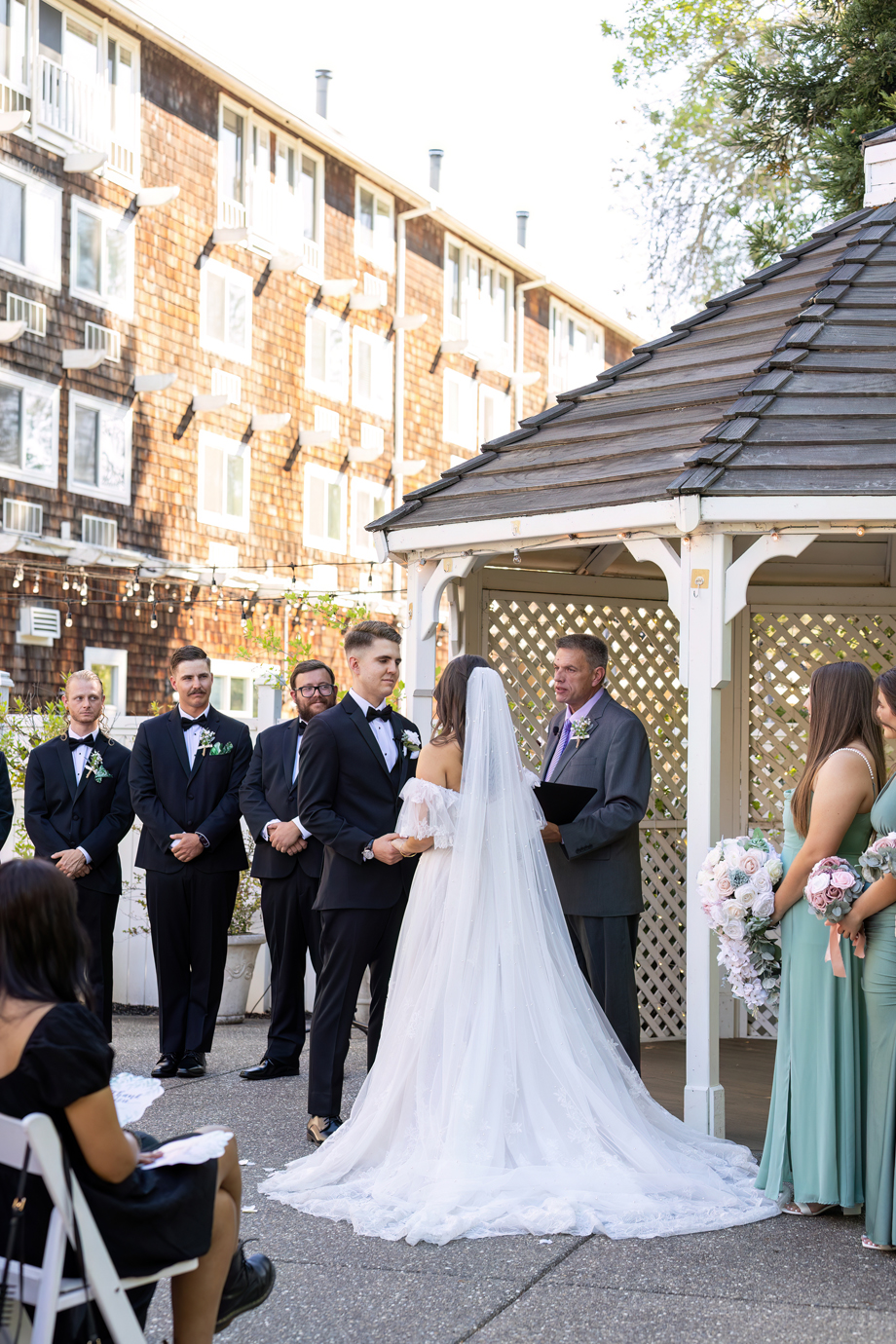 My dad (Russ Stringfellow) was our officiant. Having someone so close to both of us made the moment so special. The ceremony was outside underneath the gazebo with the lights in the back, and the gorgeous greenery that Lake Natoma Inn has to offer.