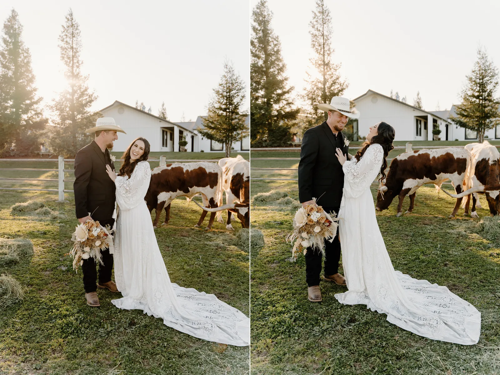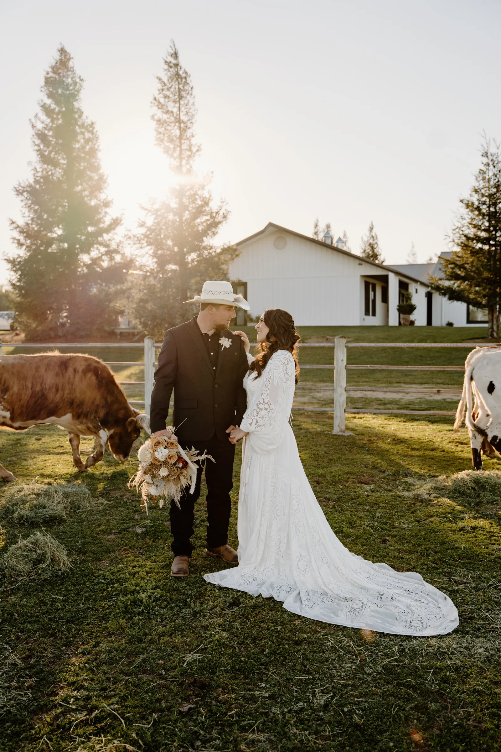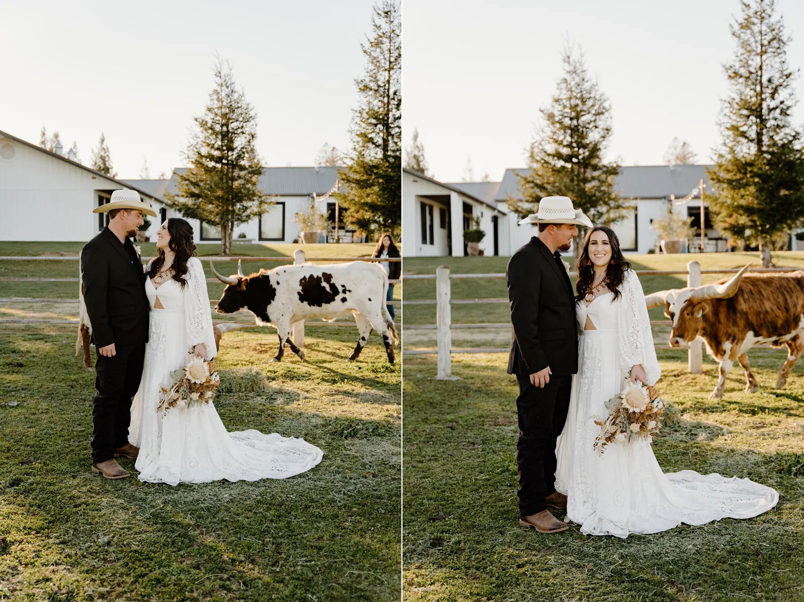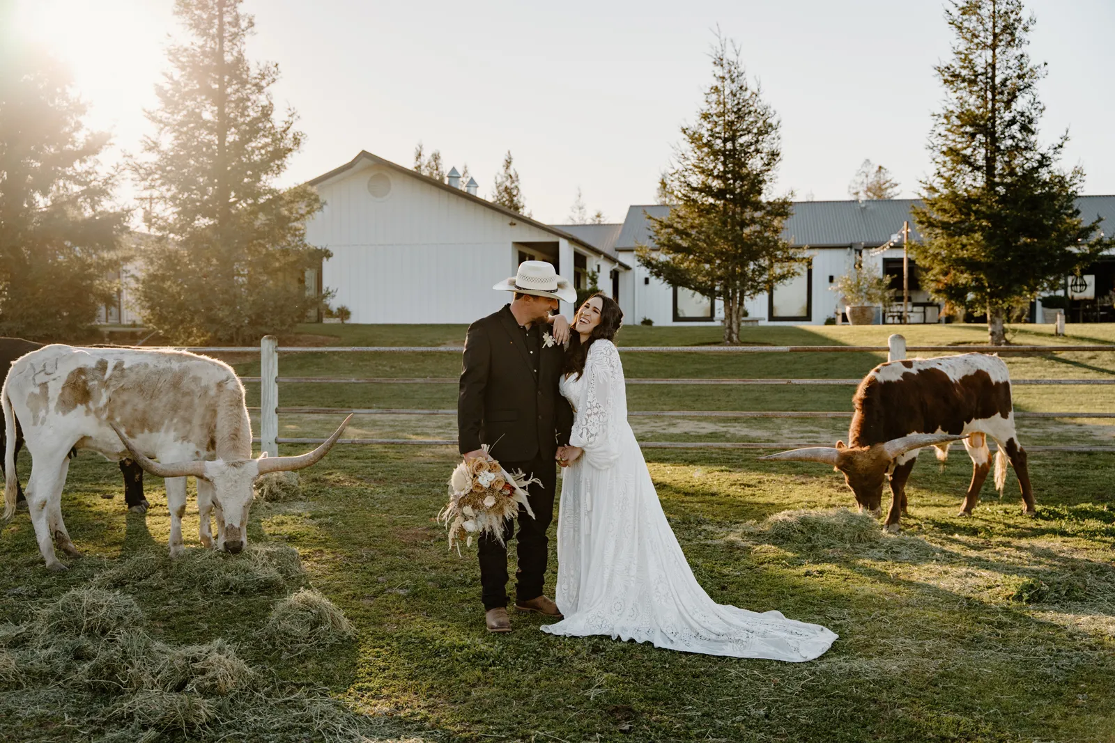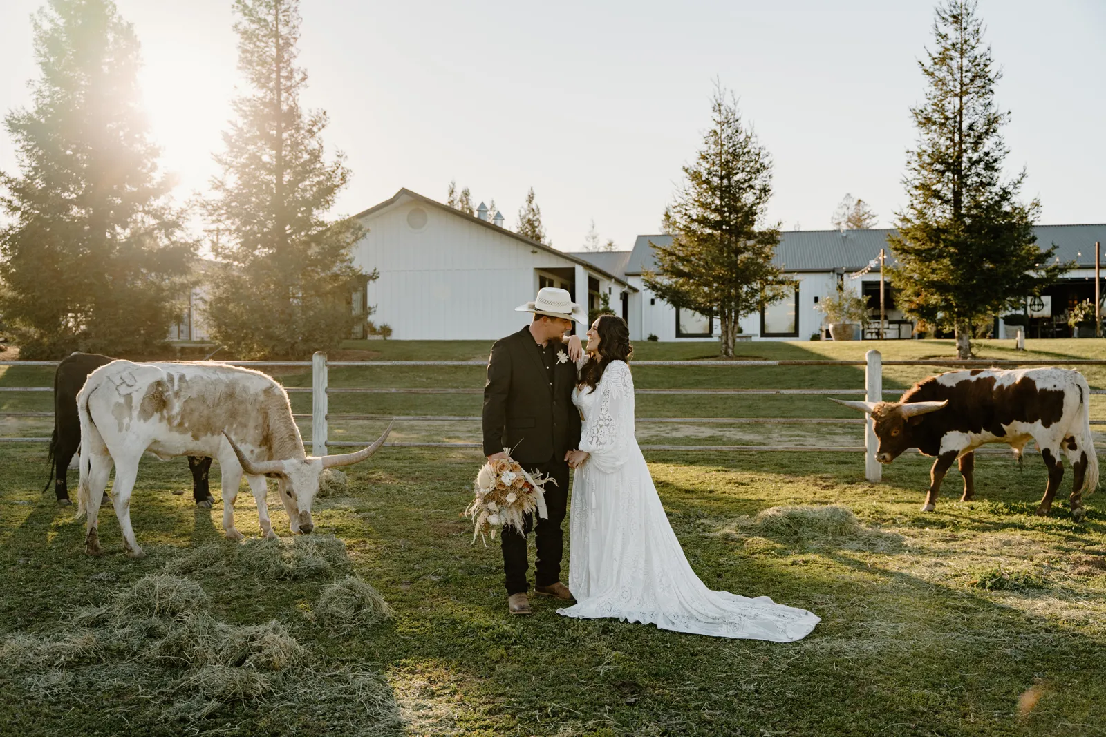 Is it wrong that we get giddy with excitement when we see weddings and styled shoots at The Ranch at Lone Oak Longhorns? Want to know why? With their modern farmhouse and barn like structures, the venue is the perfect backdrop for virtually any wedding theme (as you’ll see with this gorgeous submitted styled shoot), but also: They. Have. Cows. and not just any cows, they’re LONGHORNS. These gentle giants seem unfazed by the wedding couples they see, and sneak into the background of many photos, often to the delight of the wedding couple. And for this submitted styled shoot that we teased in the current issue of Real Weddings Magazine, it fuses boho touches with a modern western theme…enjoy dear Real Weddings Readers!