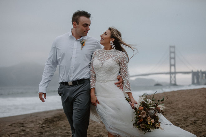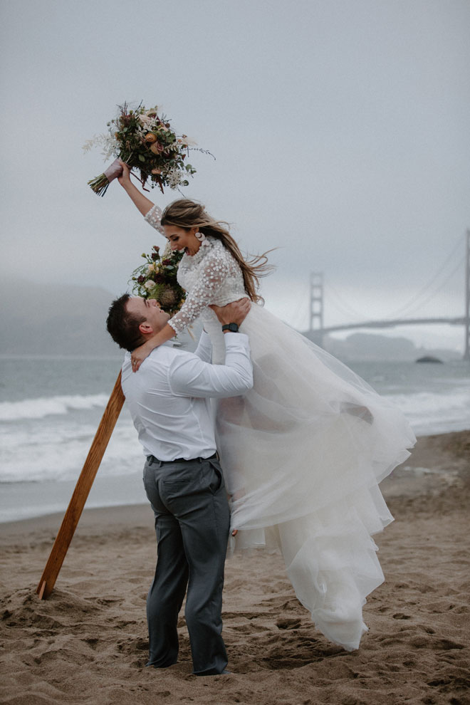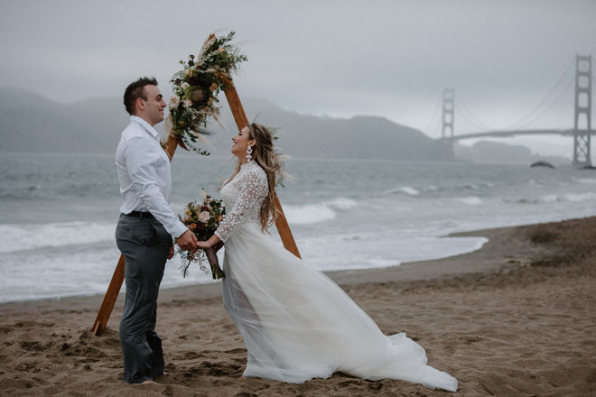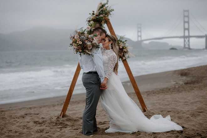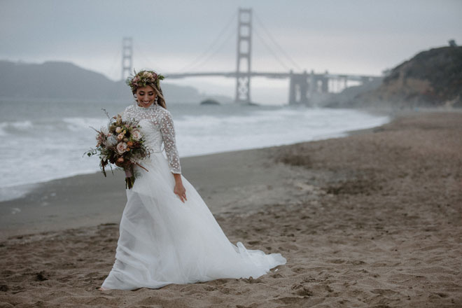 There’s nothing more romantic than an intimate beach elopement and San Francisco is just close enough to host a beautifully romantic day barefoot and in love. Get inspired by this windswept styled shoot with lush flowers and beautifully-detailed gowns!